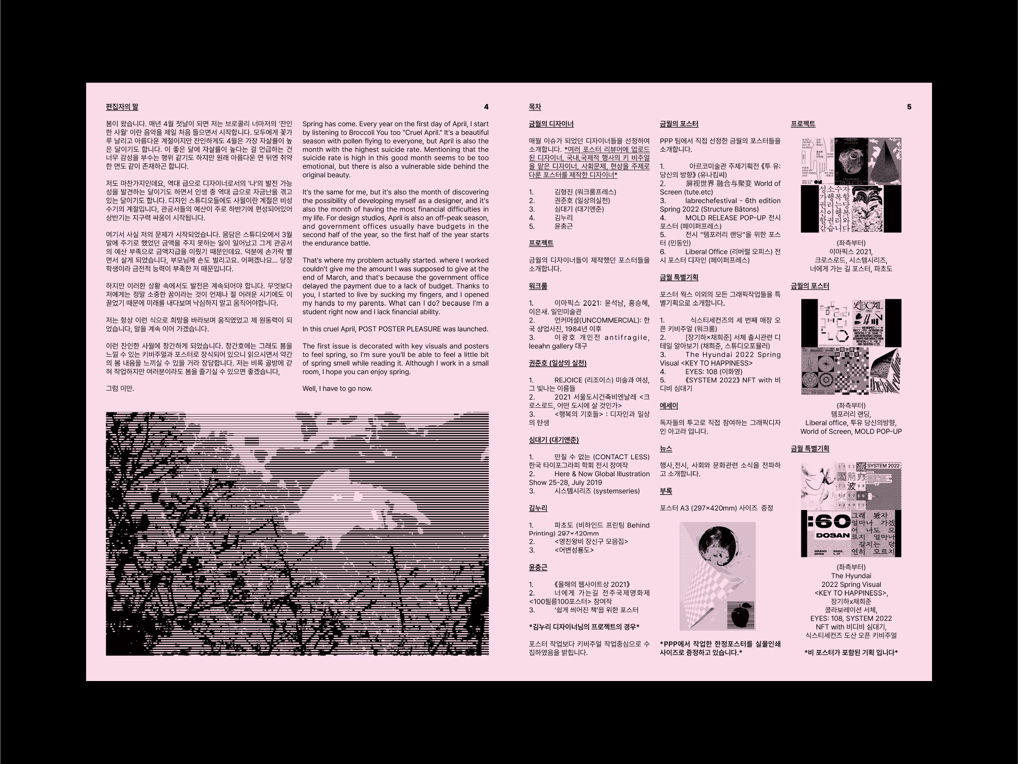 『계간 포스트포스터프레저』 저는 평소에 포스터에 관심이 정말 많습니다. 다양한 포스터들을 인스타그램을 통해 항상 수집함으로서 그래픽디자인의 최신 동향에 대해 파악하고, 이해합니다. 그렇지만 저와 같은 포스터 러버들을 위한 잡지는 사실 찾아봐도 잘 안보입니다. 월간디자인이나 기타잡지 혹은 그래픽지에서 같이 실렸던 포스터들을 단독으로 모아놓은 월간잡지는 없었습니다. 는 이슈가 되었던 모든 포스터들을 매달 소개하는 월간지 입니다. 는 이슈가 되었던 모든 포스터들을 매달 소개하는 월간지 입니다. 『책의 구성내용』 이슈가 되었던 그래픽디자인 키워드, 포스터들, 디자이너인터뷰 소식지, 에세이 표지 편집장의 글 목차 금월의 디자이너 = 이슈가 되었던 매월 선정 (선정기준 = 여러 포스터리뷰어에 업로드된 포스터, 국내..