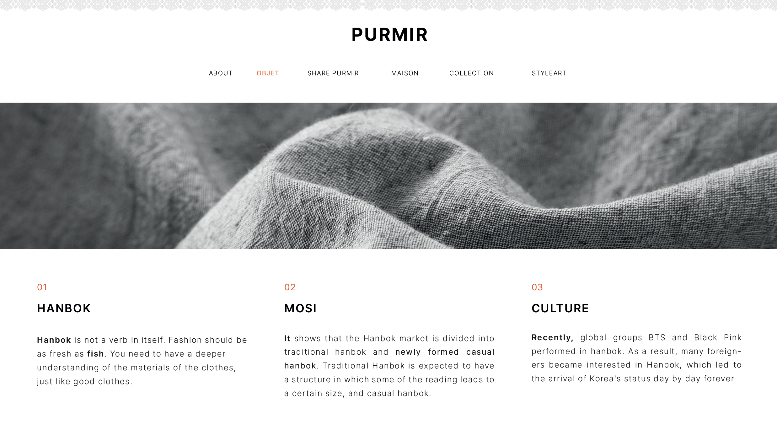 '푸르미르'라는 가상의 브랜드를 선정한 후, 대한민국의 전통의상인 한복을 스트릿 패션이라는 패션 트렌드의 컨셉으로 재해석해 만든 리플릿 디자인입니다. 브랜드 소개 페이지, 한복의 미, 스트릿 패션의 특징 등을 페이지 별로 간략하게 정리했으며, 타이포그래피의 배치를 통해 내용 전달을 극대화하고자 하였습니다. 임주원 7dlawndnjs@naver.com