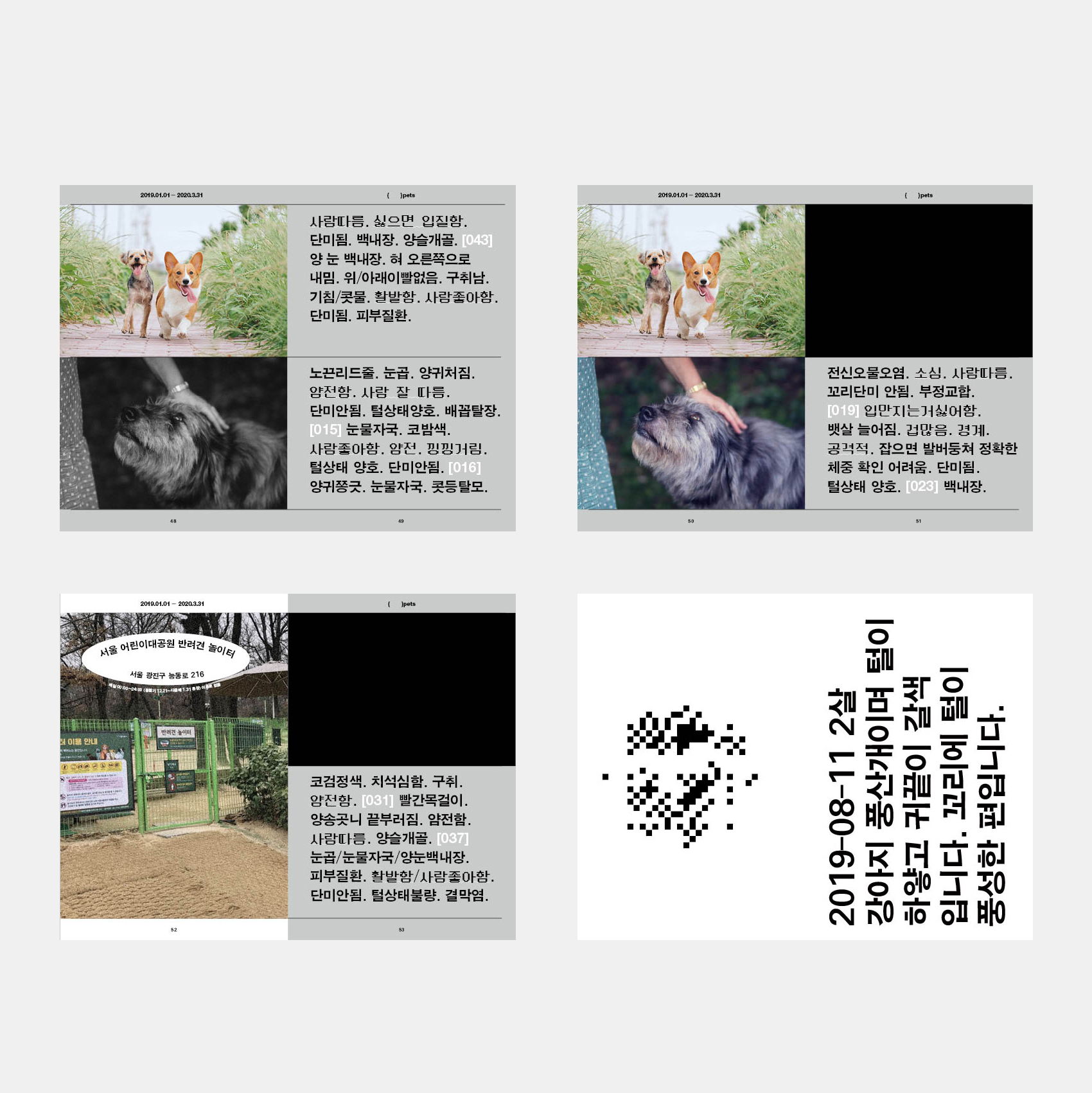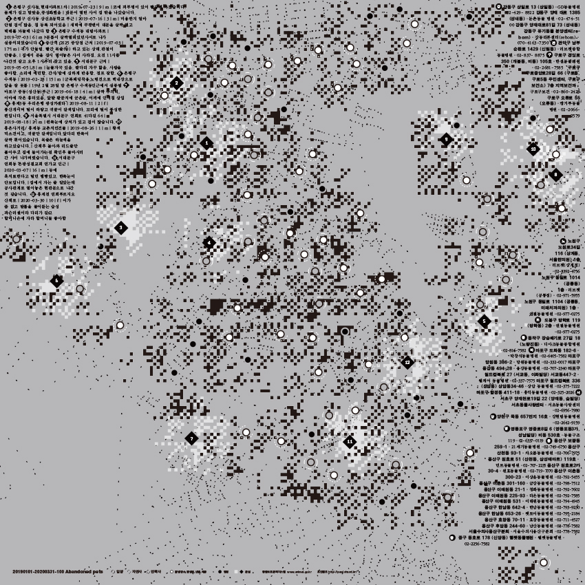 2019년 1월 1일부터 2020년 3월 31일의 유기동물 데이터로 이루어진 지도와 지도첩, 그리고 책이다. 동물들이 유실·유기되어 발생된 장소는 유기동물들의 집으로 해석했다. 반환, 입양, 자연사, 안락사된 100마리의 유기동물로 구성되어 있다. 김유진 youjin.k@gmail.com @yourjin.k
