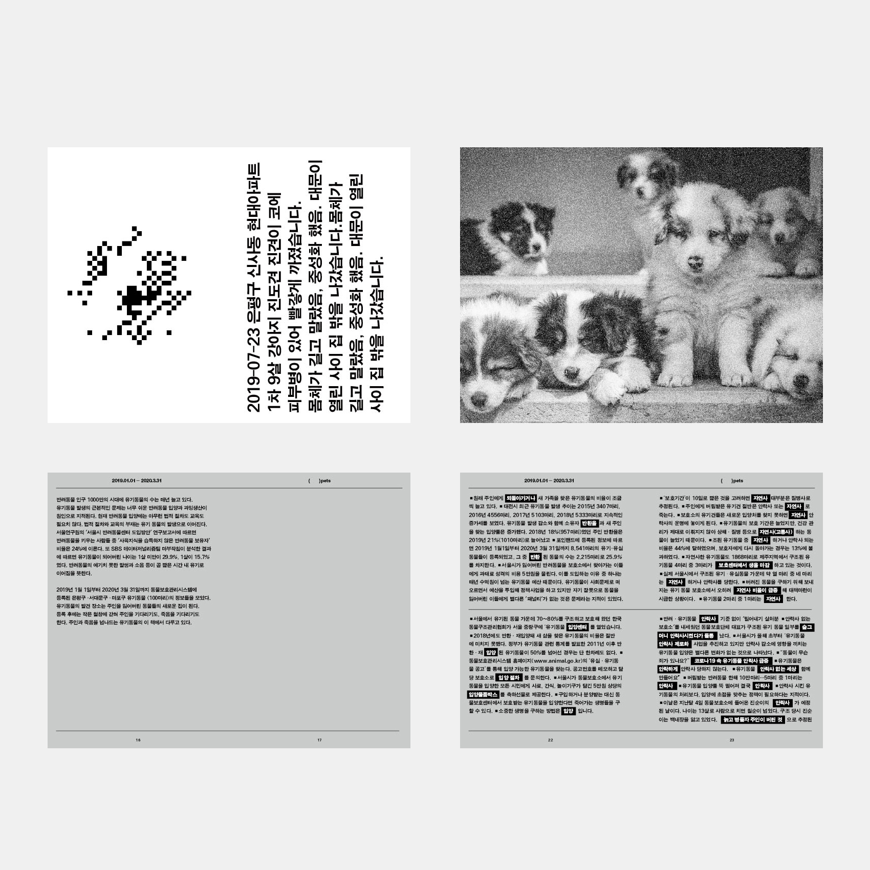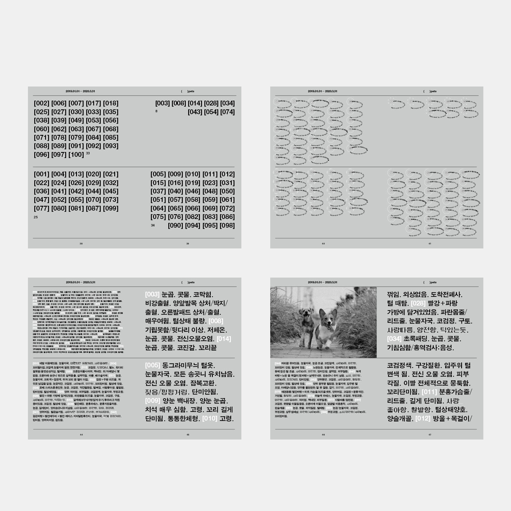 2019년 1월 1일부터 2020년 3월 31일의 유기동물 데이터로 이루어진 지도와 지도첩, 그리고 책이다. 동물들이 유실·유기되어 발생된 장소는 유기동물들의 집으로 해석했다. 반환, 입양, 자연사, 안락사된 100마리의 유기동물로 구성되어 있다.