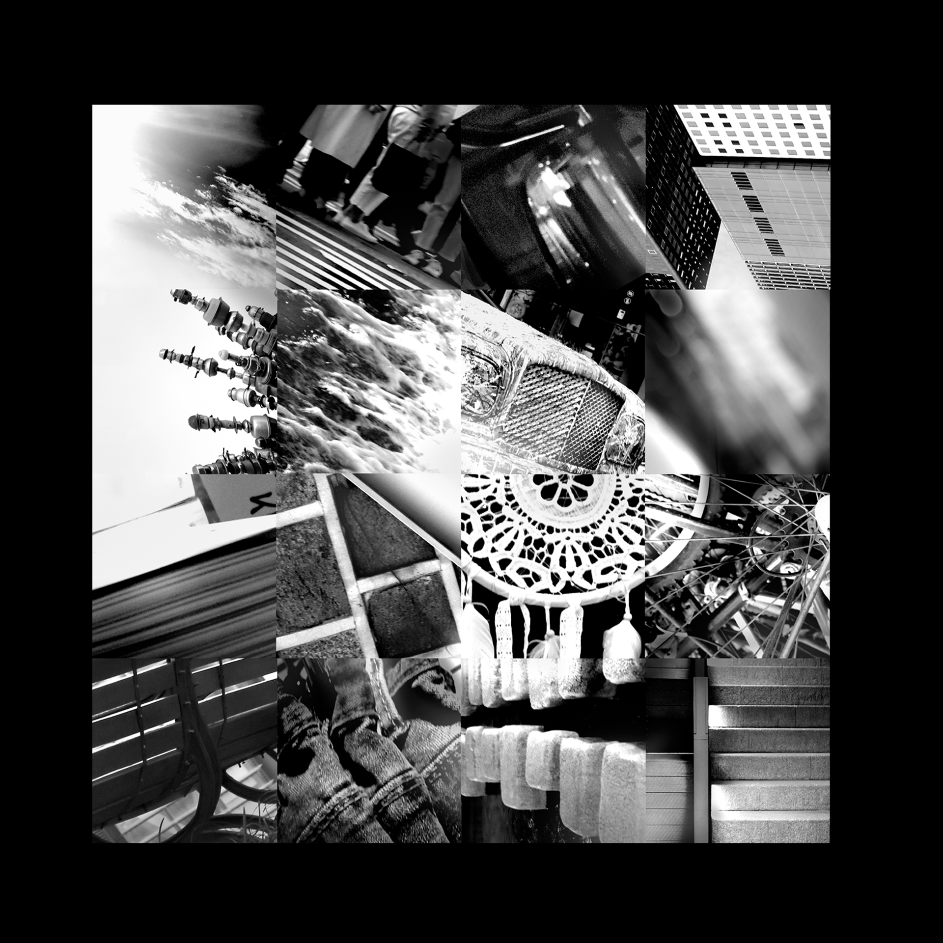 직접 찍은 흑백 사진 16장에서 일부분씩만 오려내어, 밝기나 모양이 연결되는 지점을 찾아 붙이며 새로운 1장의 장면을 만드는 과제.