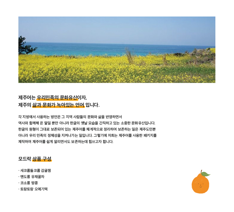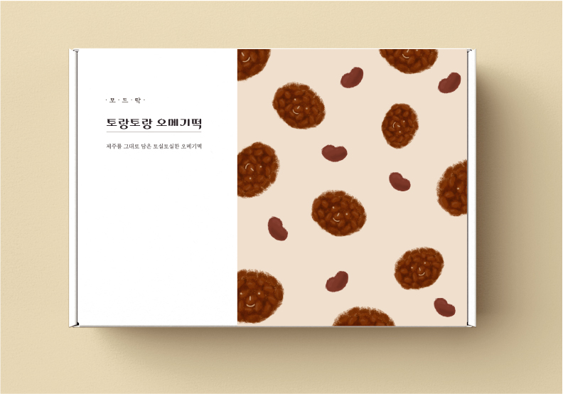 모드락은 ‘제주어, 제주도 역사 · 문화 알리기 콘텐츠’를 통해 제주어를 보존하고 계승하려는 목적을 가진 브랜드이다. 모드락을 통해 제주어의 가치를 널리 알리고자 일상 속에서 쉽게 접할 수 있도록 제주의 특성을 담아 브랜드를 제작하였다. 제주하면 떠오르는 이미지들 중 여행자들에게 가장 친숙한 것들을 뽑아내어 일러스트로 제작하였고, 토실토실 오메기떡을 토랑토랑 오메기떡으로, 고소한 땅콩을 코소롱 땅콩으로 바꾸는 등 의성어 의태어를 활용하여 제주의 언어와 그 풍경을 패키지에 담아보고자 하였다. 이세영 dltpdud0146@naver.com 장시온 siony0405@naver.com 정수진 molly2009@naver.com