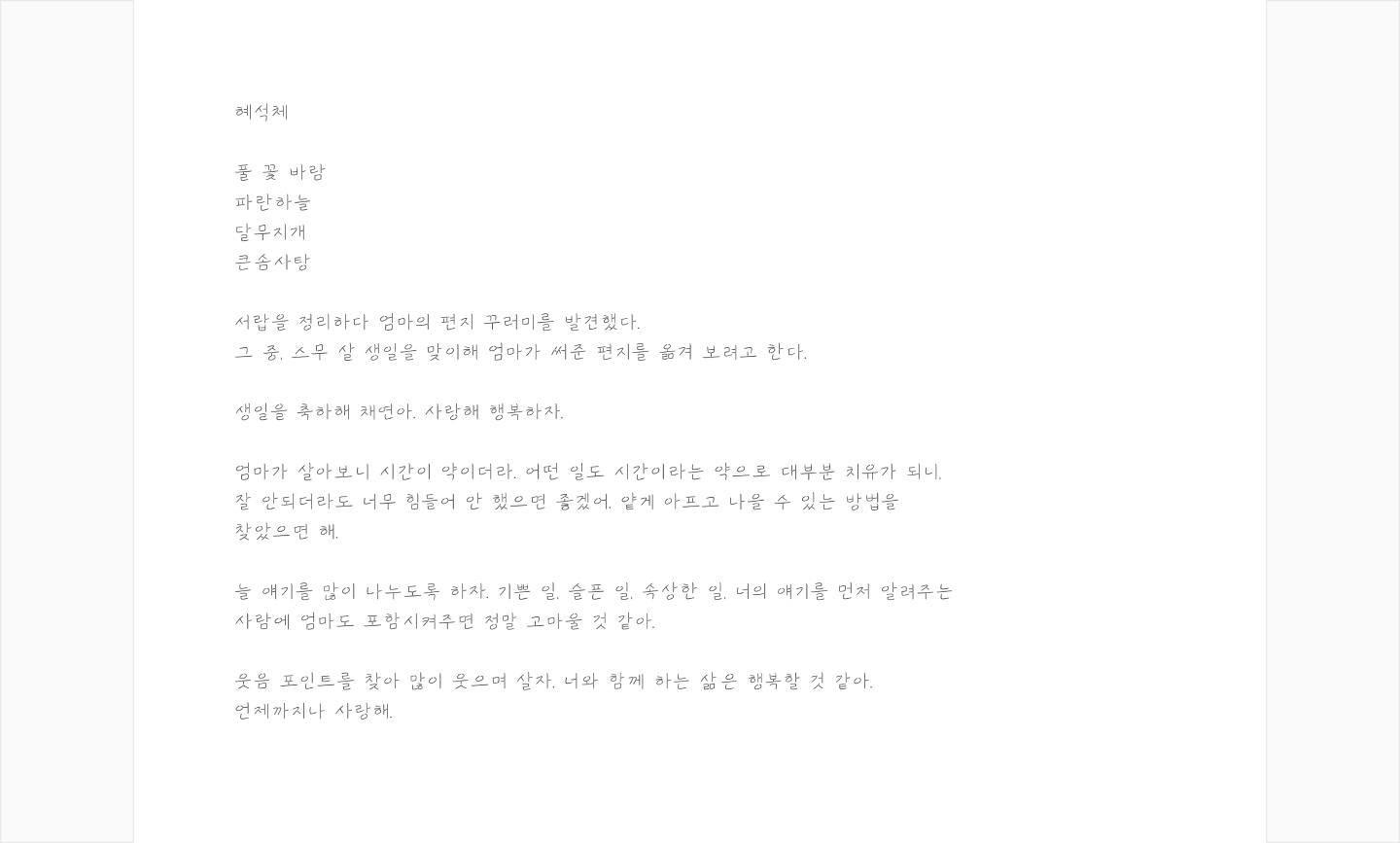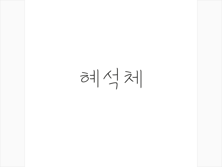 '혜석체'는 엄마의 이름을 따 서체의 이름을 짓고, 엄마의 편지 손글씨를 기반으로 제작한 블로그 본문용 서체이다.