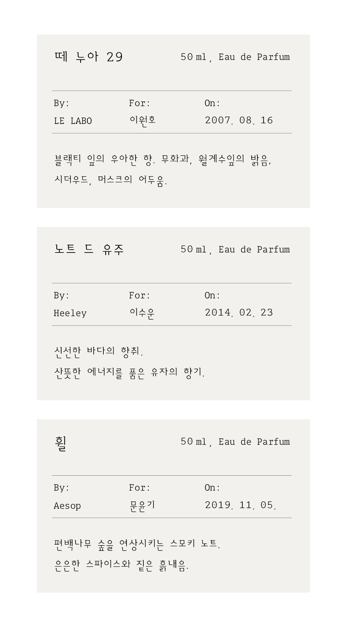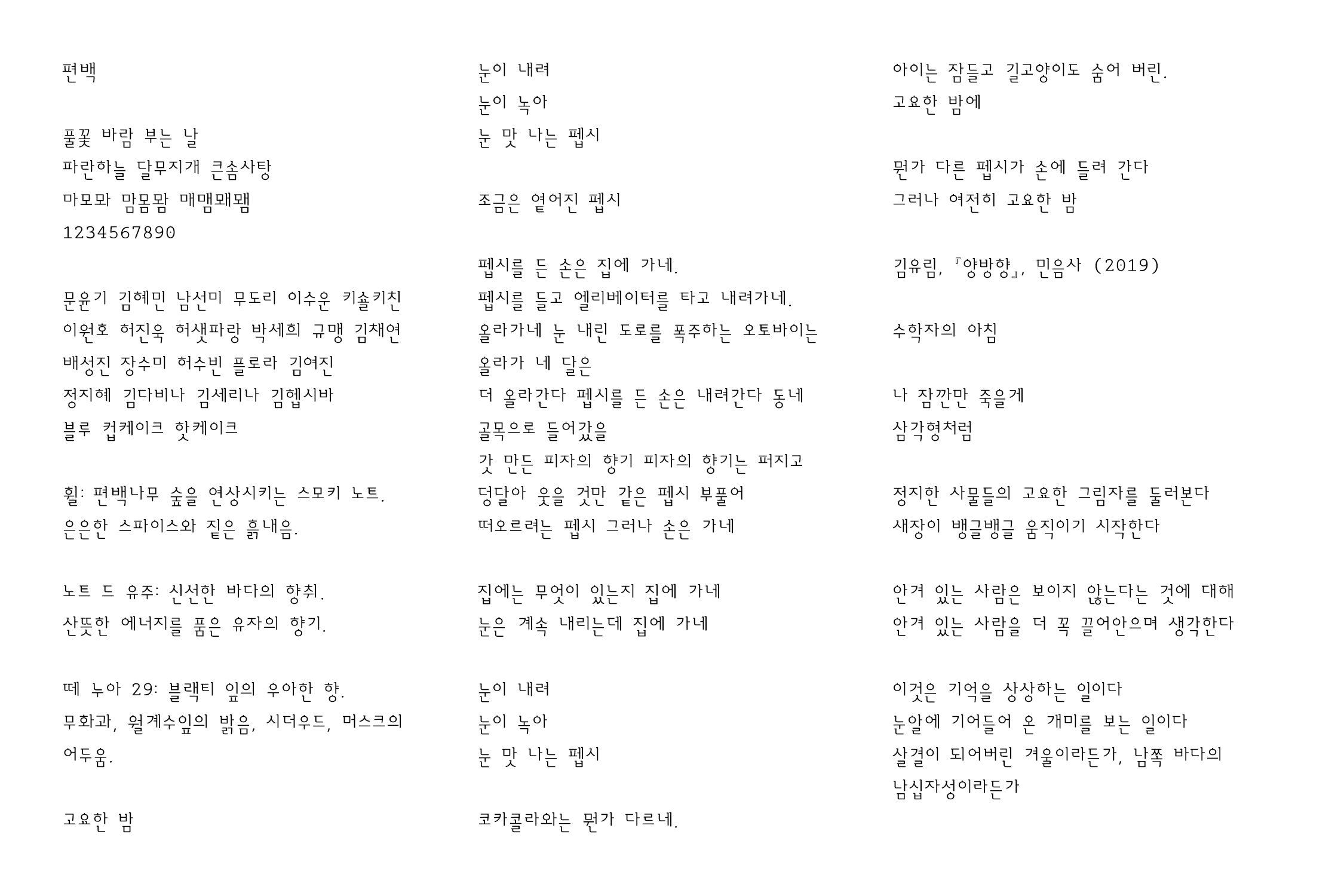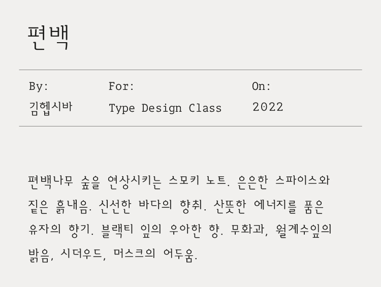 편백은 현대적인 탈네모꼴 타자기 활자다. 향수 패키지에 주로 쓰이는 영문 모노 스페이스 활자에서 영감을 받아, 이러한 활자에서 느껴지는 아날로그의 따뜻한 느낌과 기계의 건조한 느낌의 균형을 담아보고자 했다. 기본적으로 타자기 글자의 기계적이고 불안정한 구조를 가져가되, 질감을 덜어내고 긴 글에서도 잘 읽히도록 구조를 정돈하여 디자인했다. 패키지, 짧은 시 같이 너무 길지 않은 본문에 적합하다. 김헵시바 hepzibakim@gmail.com @hepzzzzi