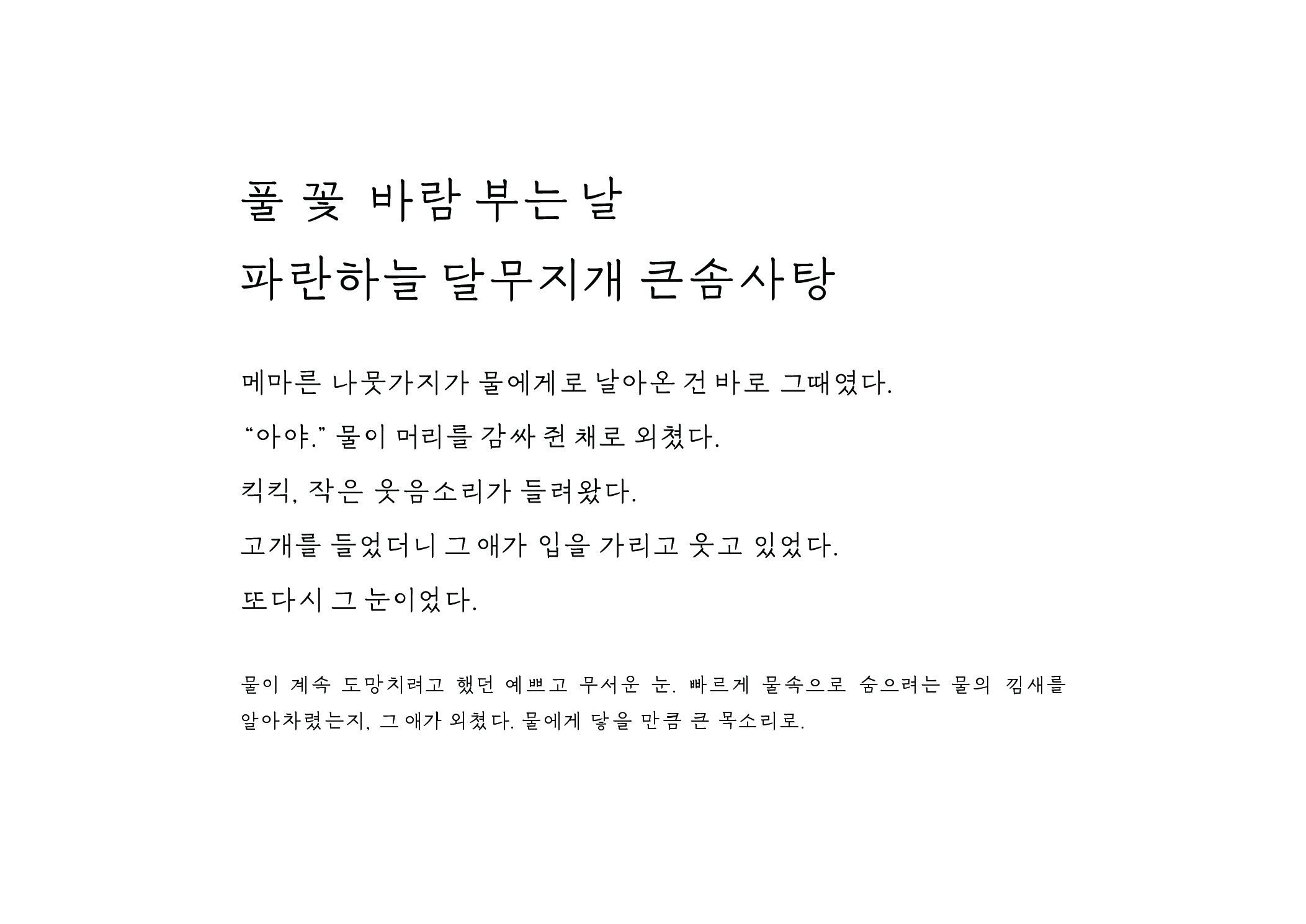 사사는 공적(公的)이 아닌 개인적인 범위나 관계의 성질이란 뜻으로, 수필이란 언어를 빌려 개성적이고 고백적인 글, 자연과 인생과 존재의 의미를 찾아가며 사사로워지는 것들을 담아낸다. 《사사》는 결과적으로 무심하고 서정적인 개인의 감정을 끌어내는 많은 노력이 보였으면 한다. 《사사》는 본문용 활자체다. 《사사》는 본문용 가로쓰기 전용 활자체다. 《사사》는 9pt~14pt 범위 내 사용을 추천한다. 장수미 @ilysbreath