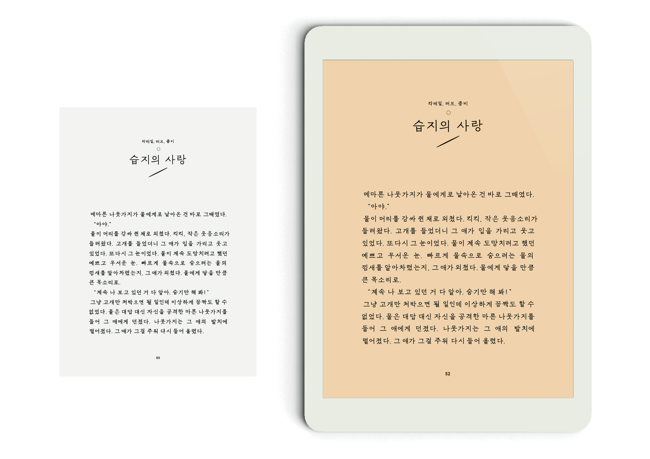 부드럽고 담백한 인상을 지닌 아날로그 타자기 서체에서 영감을 얻어, 정석적인 출판물 같지 않고 친근한 인상을 띌 수 있도록 디자인했다.