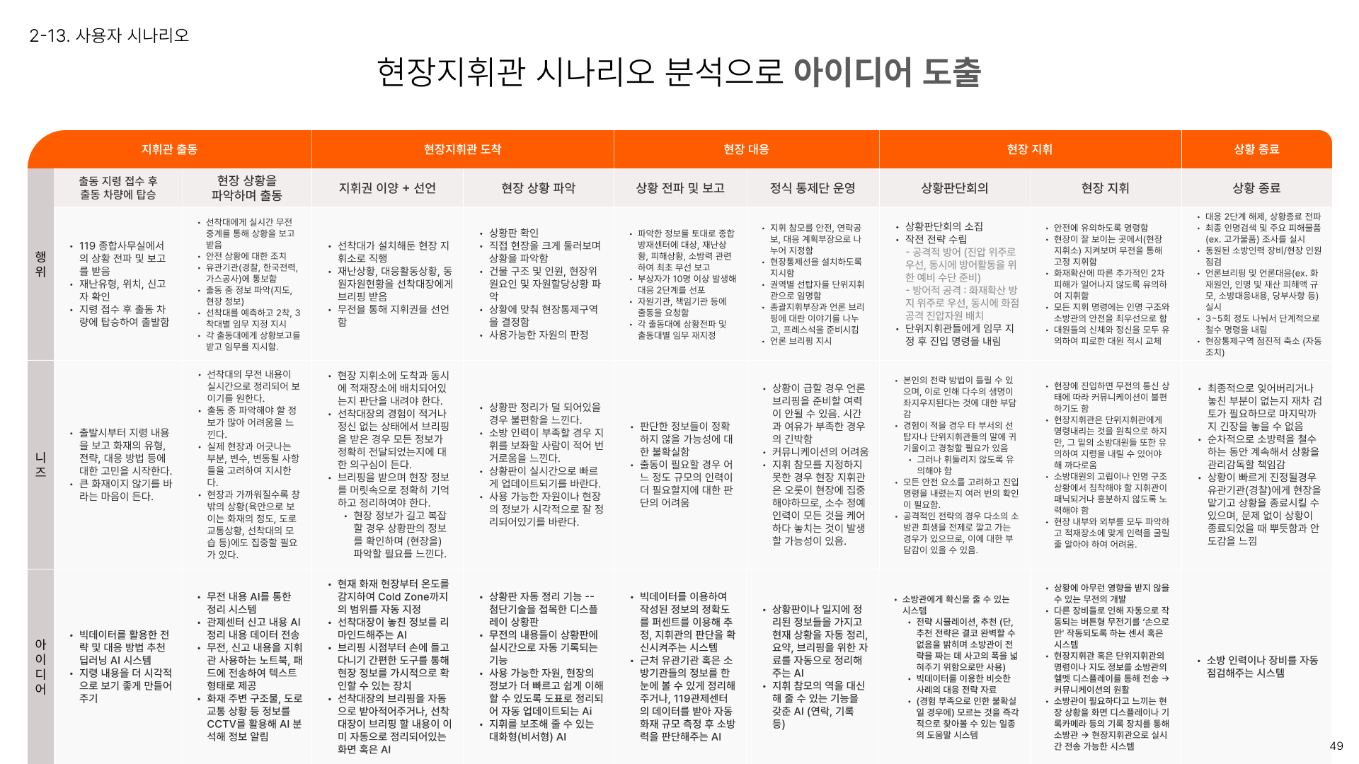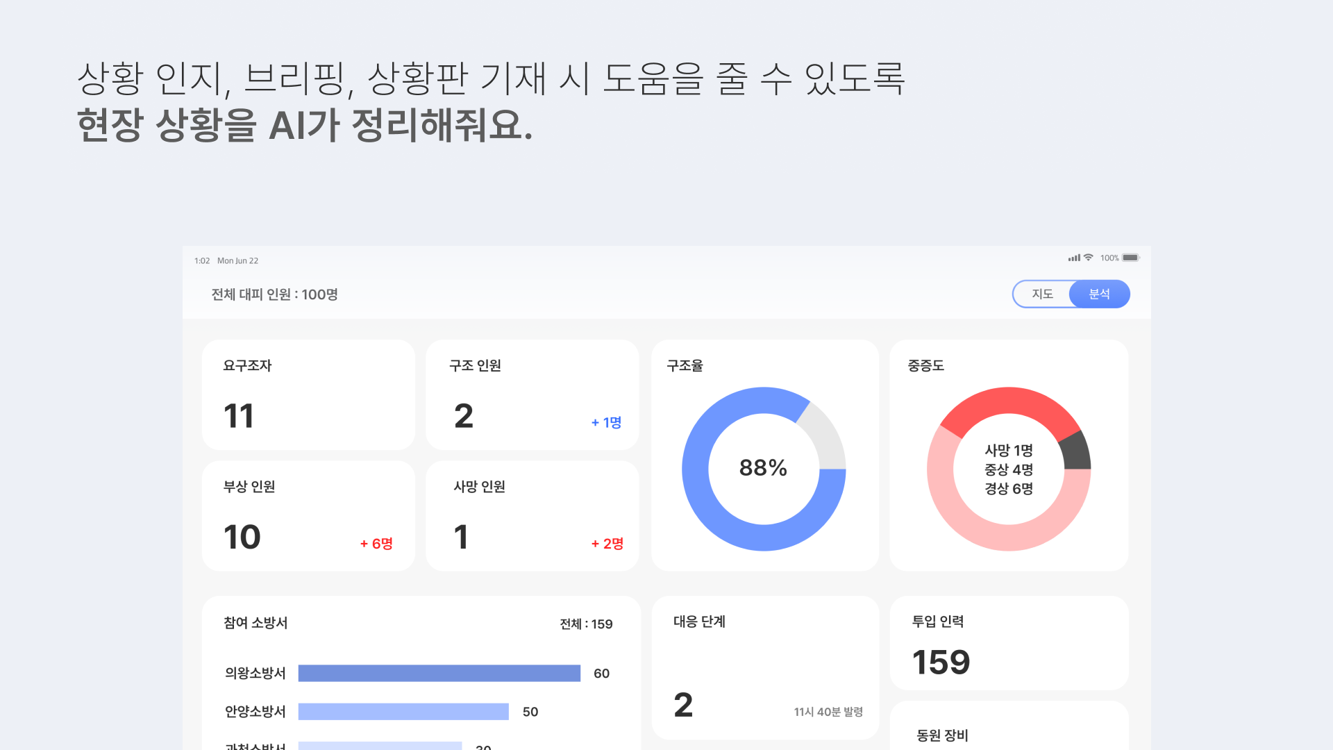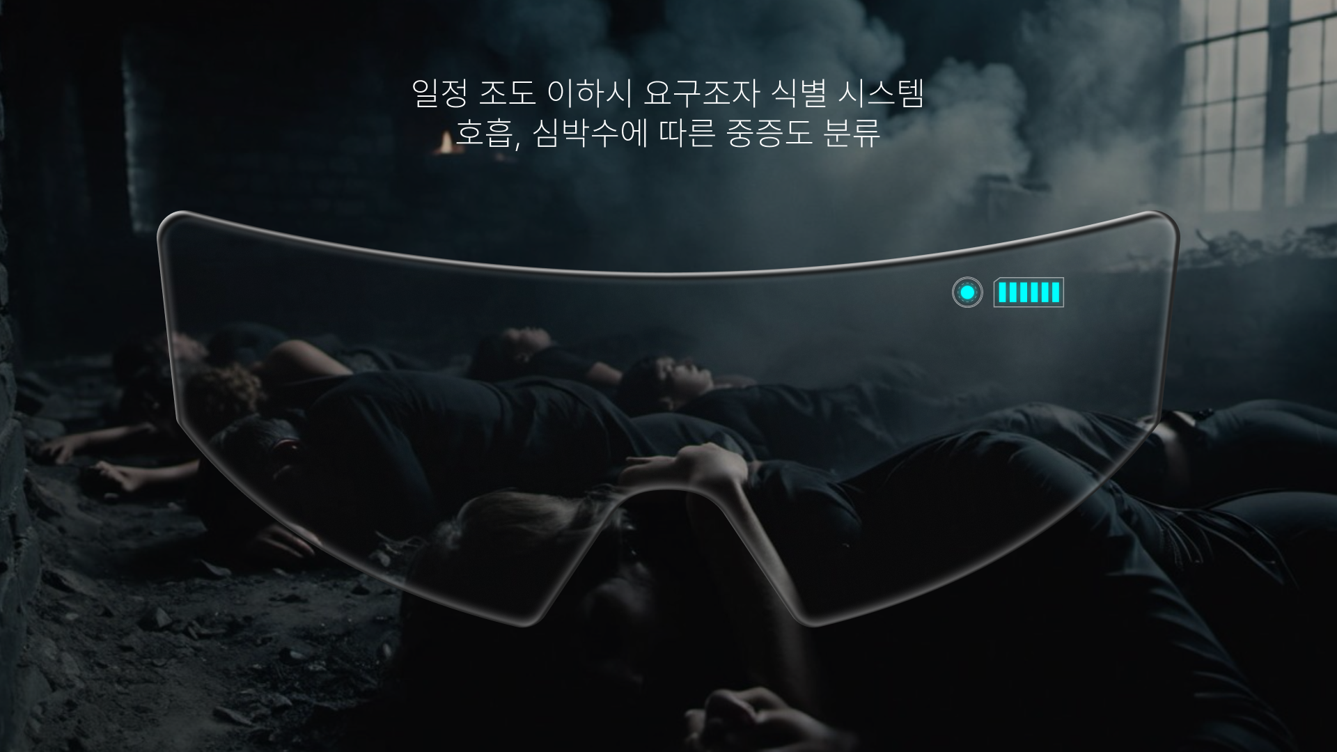 1. 정보 수집 : AI CCTV, 인명 파악 레이더 센서, 무전 및 신고 정리 AI 기능으로 구조 및 인명 파악.