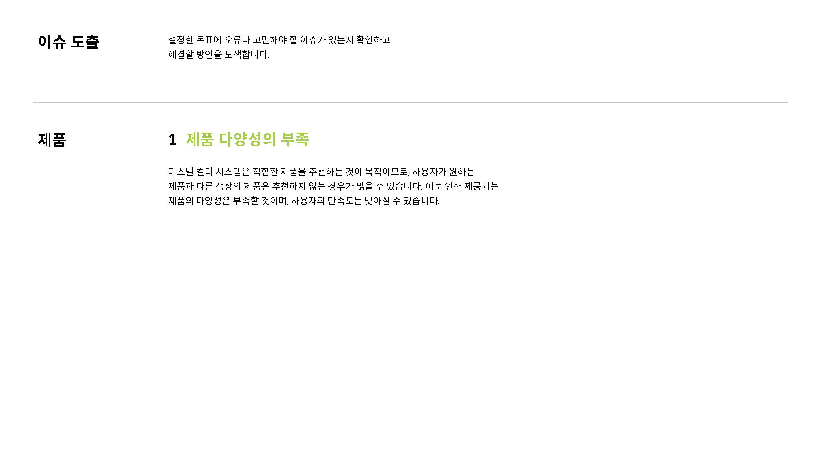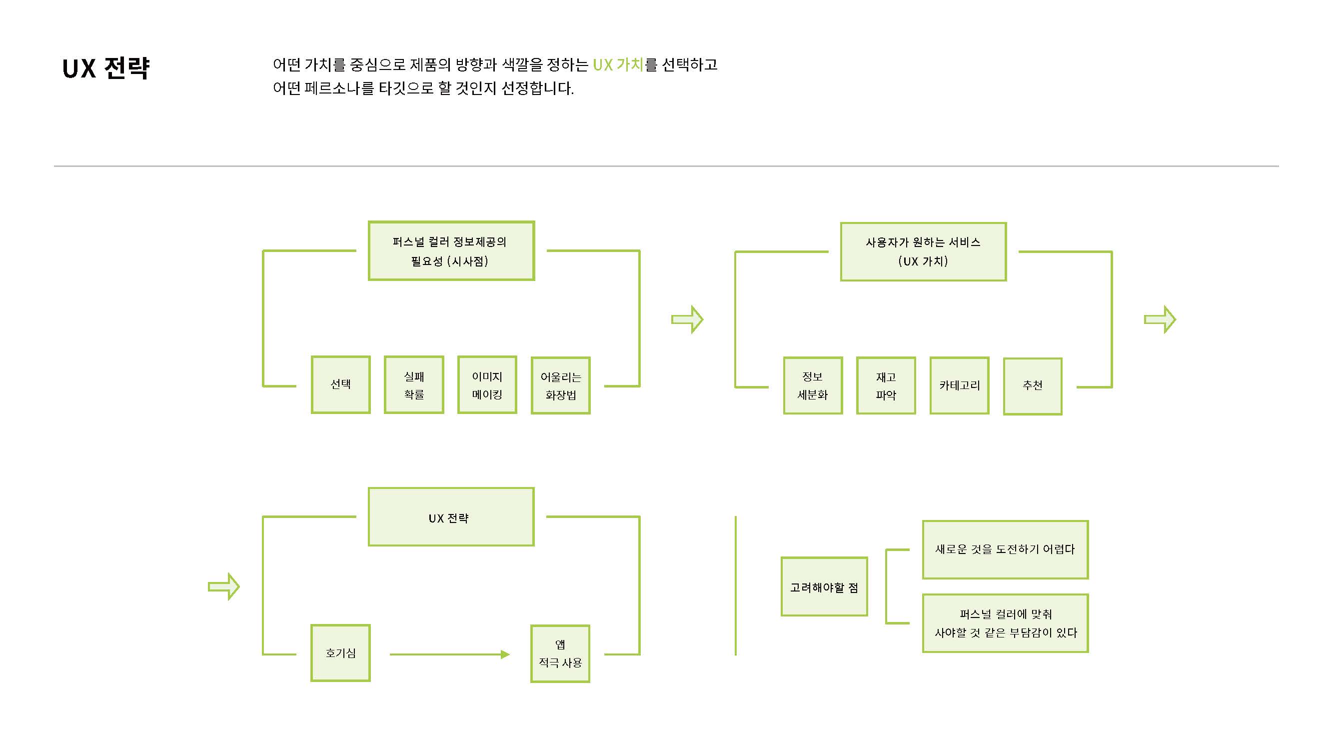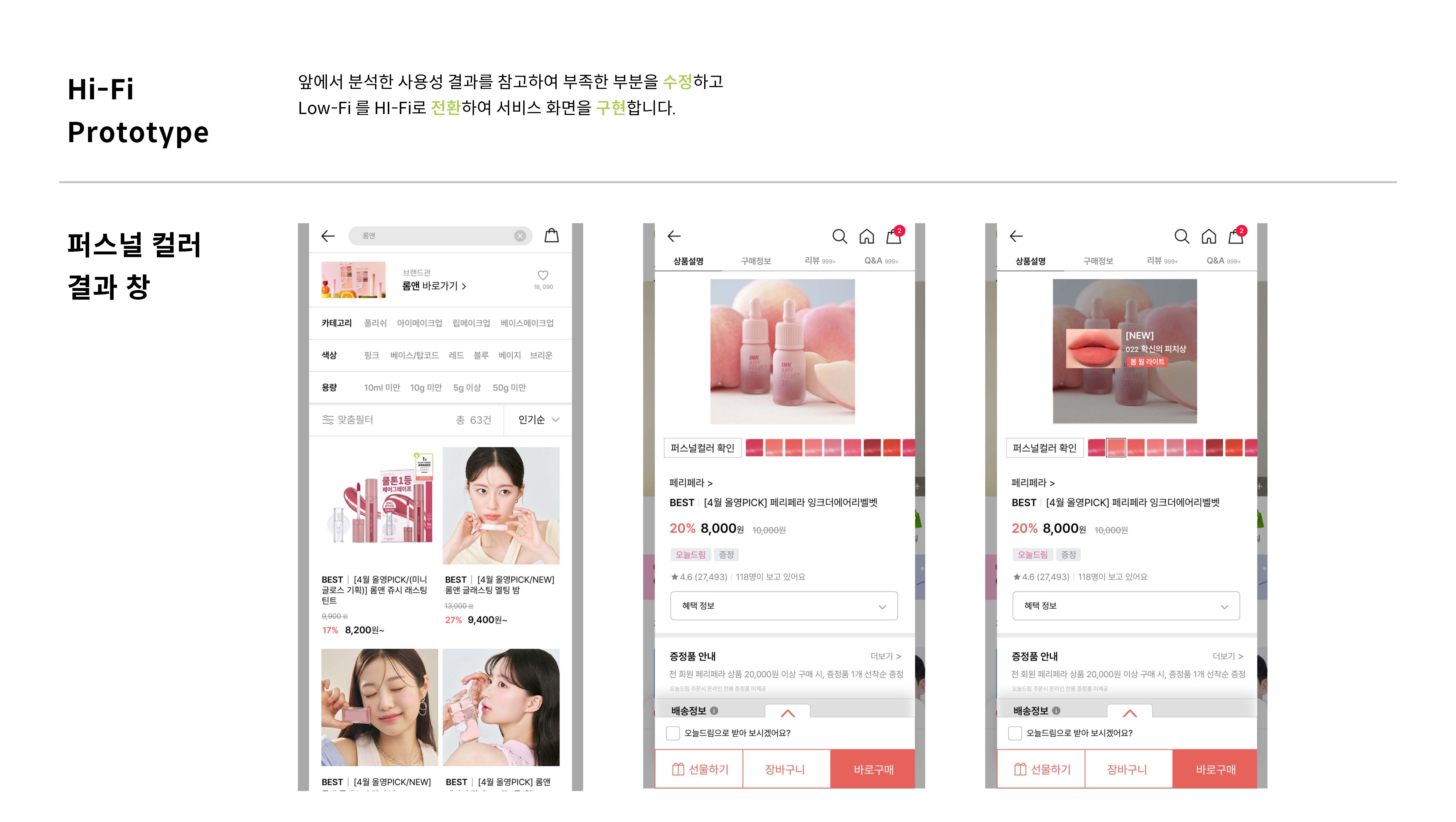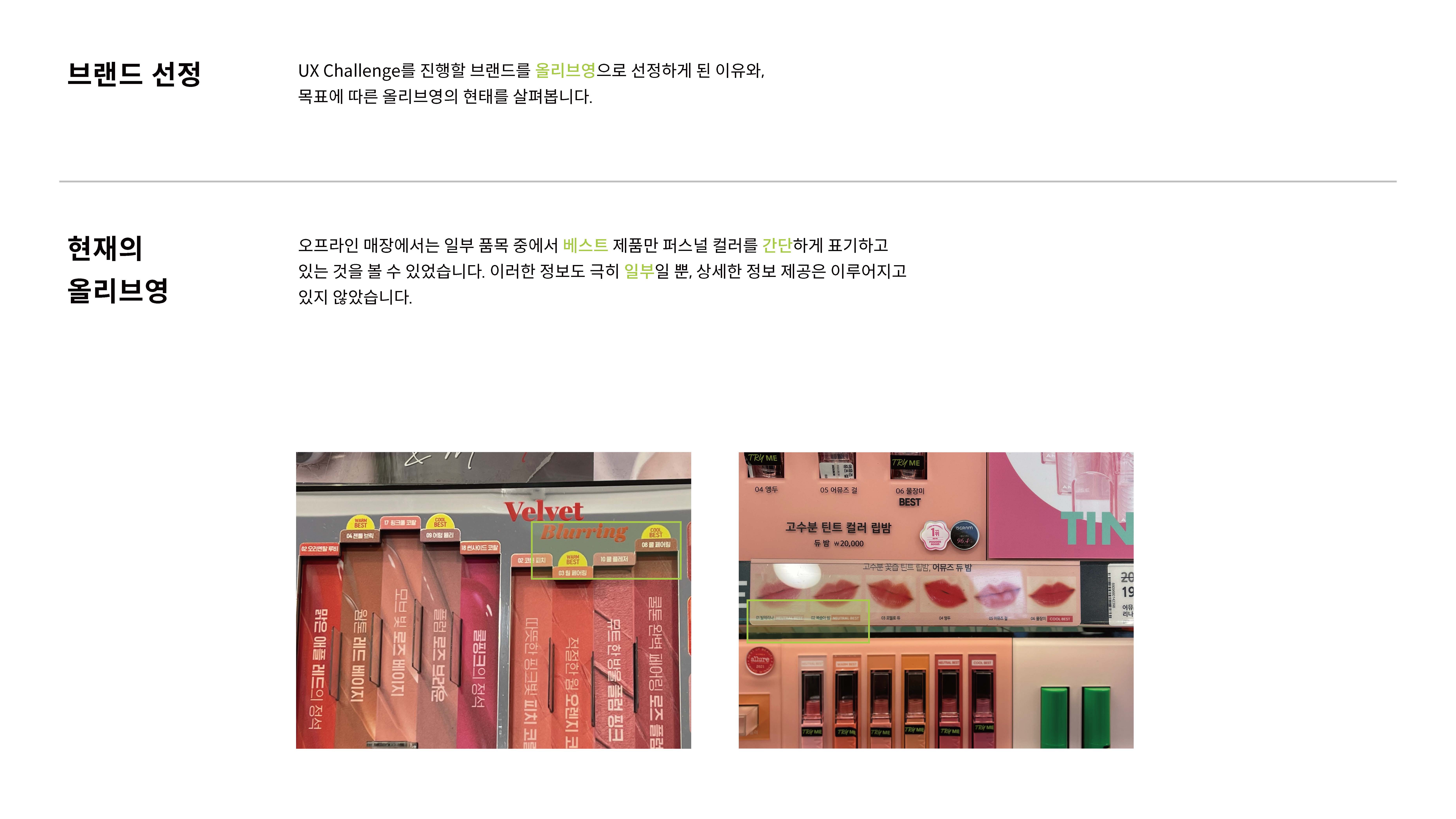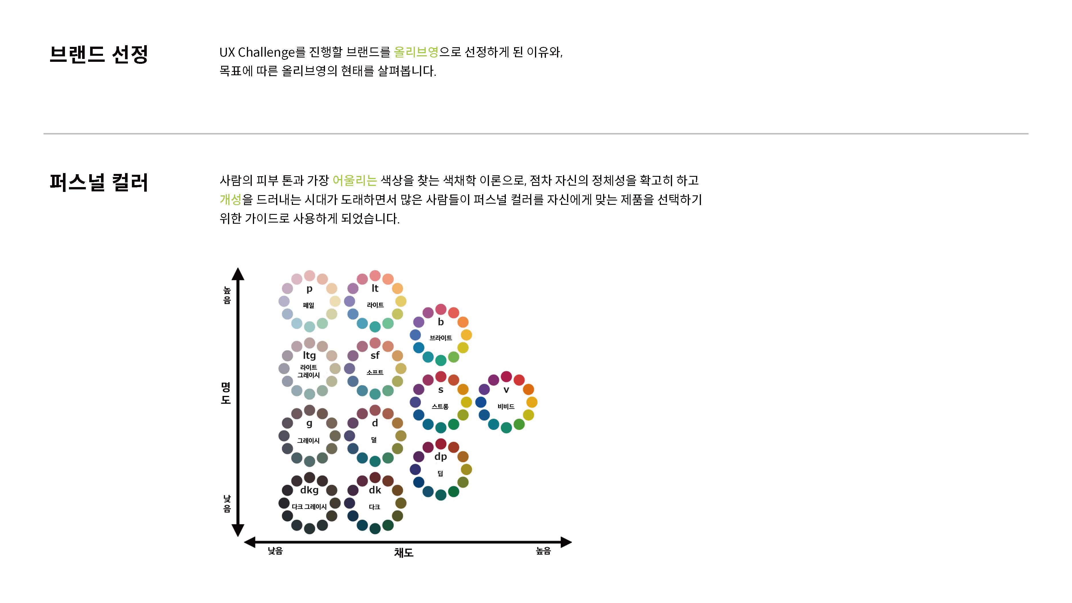 현재 올리브영에서 제공되고 있는 퍼스널 컬러 관련 정보들을 보완하며 이와 관련된 서비스를 기획하고 시뮬레이션을 진행하였다.