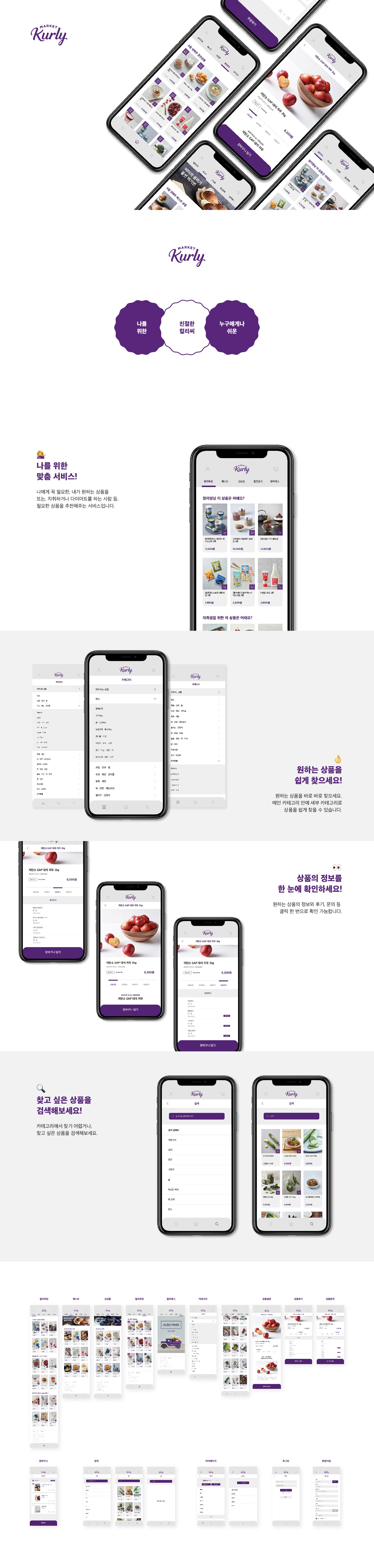 평소에 자주 사용하던 장보기 앱인 마켓컬리 앱을 리디자인하였다. 시장 조사와 사용자 조사를 바탕으로 ‘친절한 컬리씨’라는 주제를 잡았고, 누구에게나 쉽고, 나를 위한 앱으로 리디자인하고자 하였다. 정아영 6351020@naver.com @aaayyoung