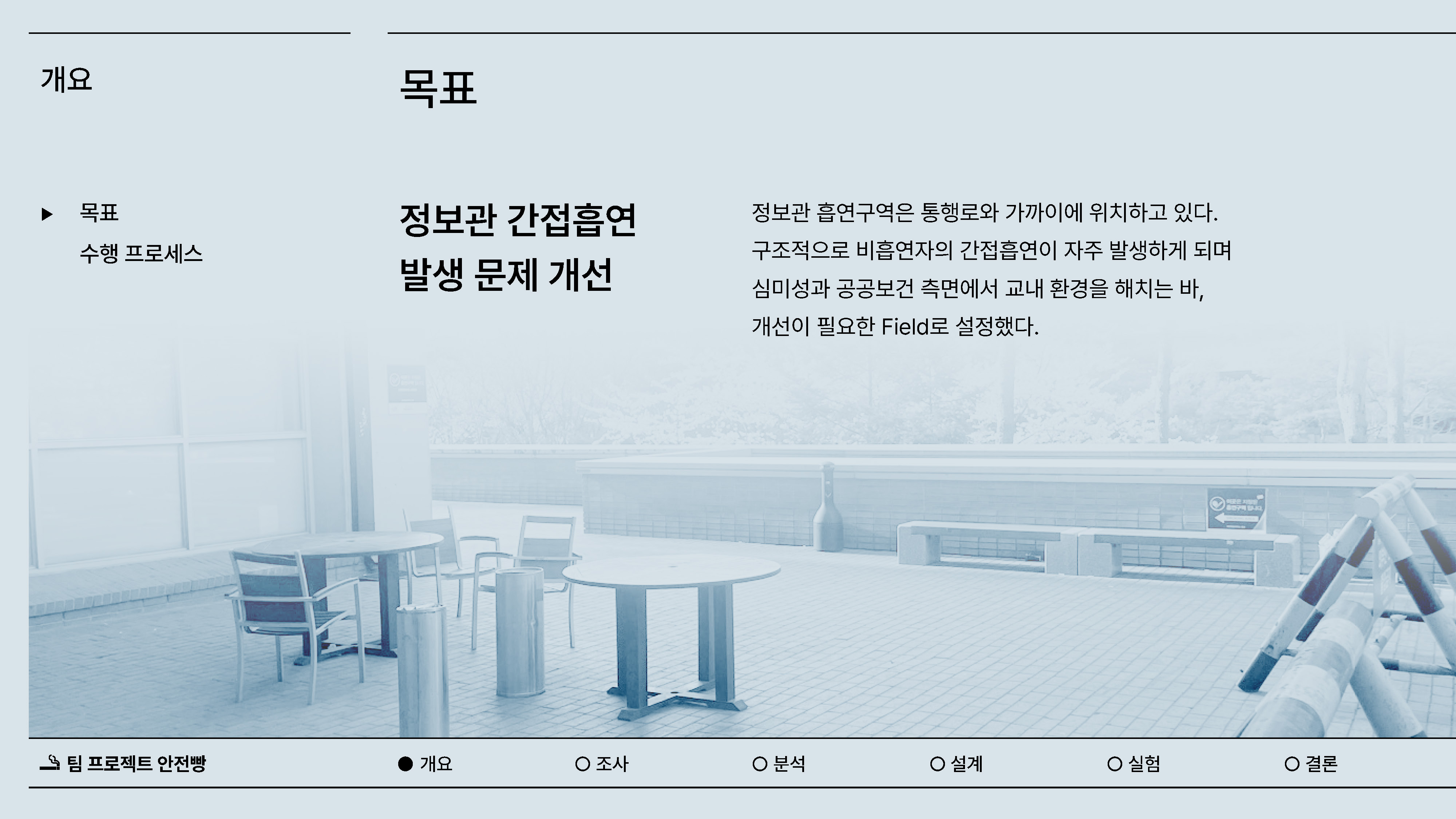 계원예술대학교 정보관 1층 흡연구역 환경 개선을 위한 필드 UX 디자인입니다.