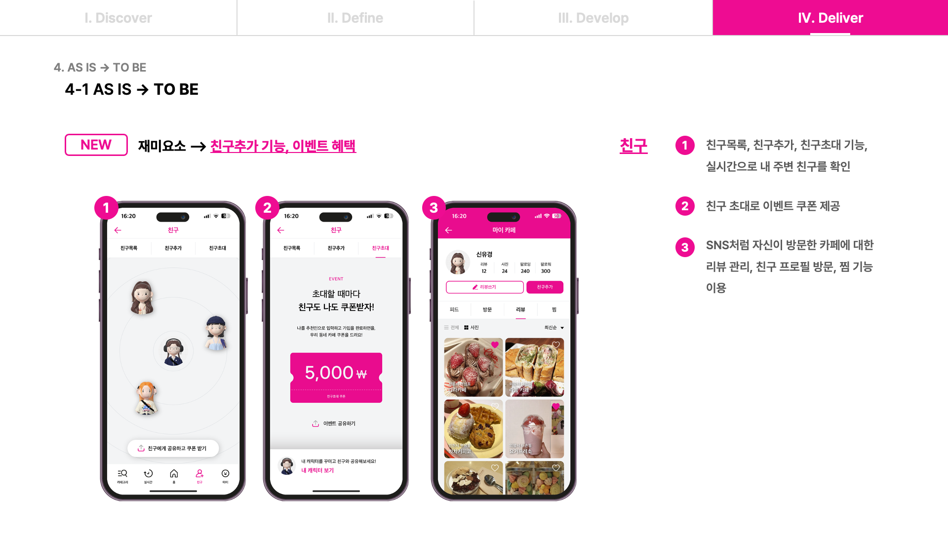 인기 있는 카페의 상황을 파악할 수 있도록 실시간 복잡도 표기로 긴 웨이팅 시간을 해결했고, 내 주변 친구를 추가해서 카페 후기와 정보를 공유할 수 있는 기능을 제공합니다. 또 사용성 높은 UI로 연령대에 상관없이 다양한 사람들이 사용할 수 있도록 설계했습니다.