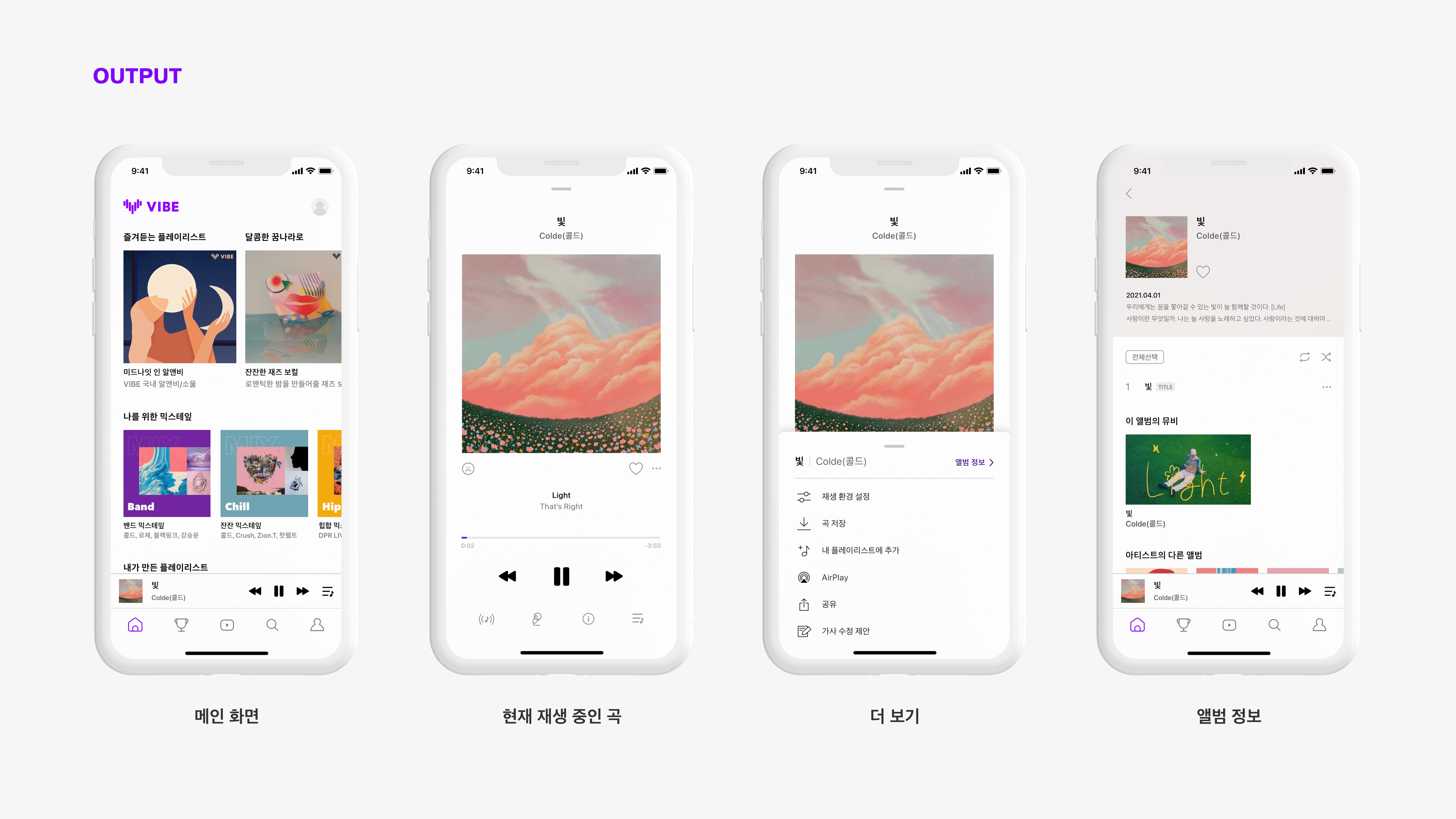바이브는 UI/UX 디자인을 다른 음악 앱들과 차별화하는 새로운 시도를 하였지만 사용자 입장에서는 아직 어색한 부분들이 많다고 느껴 이러한 점들을 개선하고 싶다는 생각을 하게 되었다. 분석을 통해 문제점과 해결 방법을 도출해낸 후 메인 화면에 '내가 만든 플레이리스트' 영역을 추가하고, 현재 재생 중인 곡 화면에서 바로 적용할 수 있도록 '이 노래 제외' 버튼을 추가하는 등 사용자 맞춤화 기능을 우선순위로 하고, 번거로운 플로우를 정리하여 앱 리디자인을 하였다. 김소은 soeunnnn@naver.com @so.eunnn