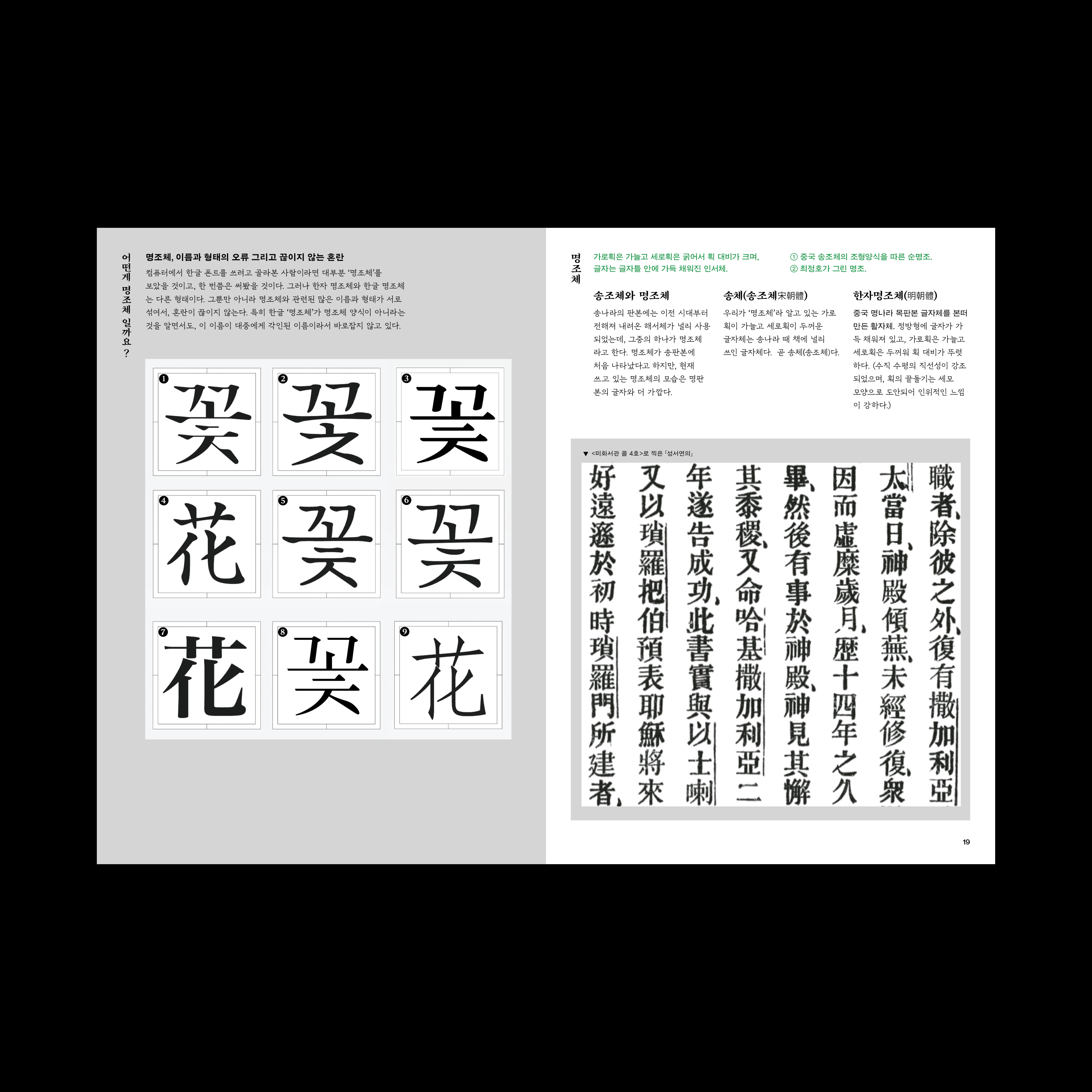 타이포그래피 역사, 명조체, 조판과 가독성, 한글과 조형, 한글과 문장부호에 대한 내용과 이미지를 정리하여 중철 제본의 책으로 엮었다.
