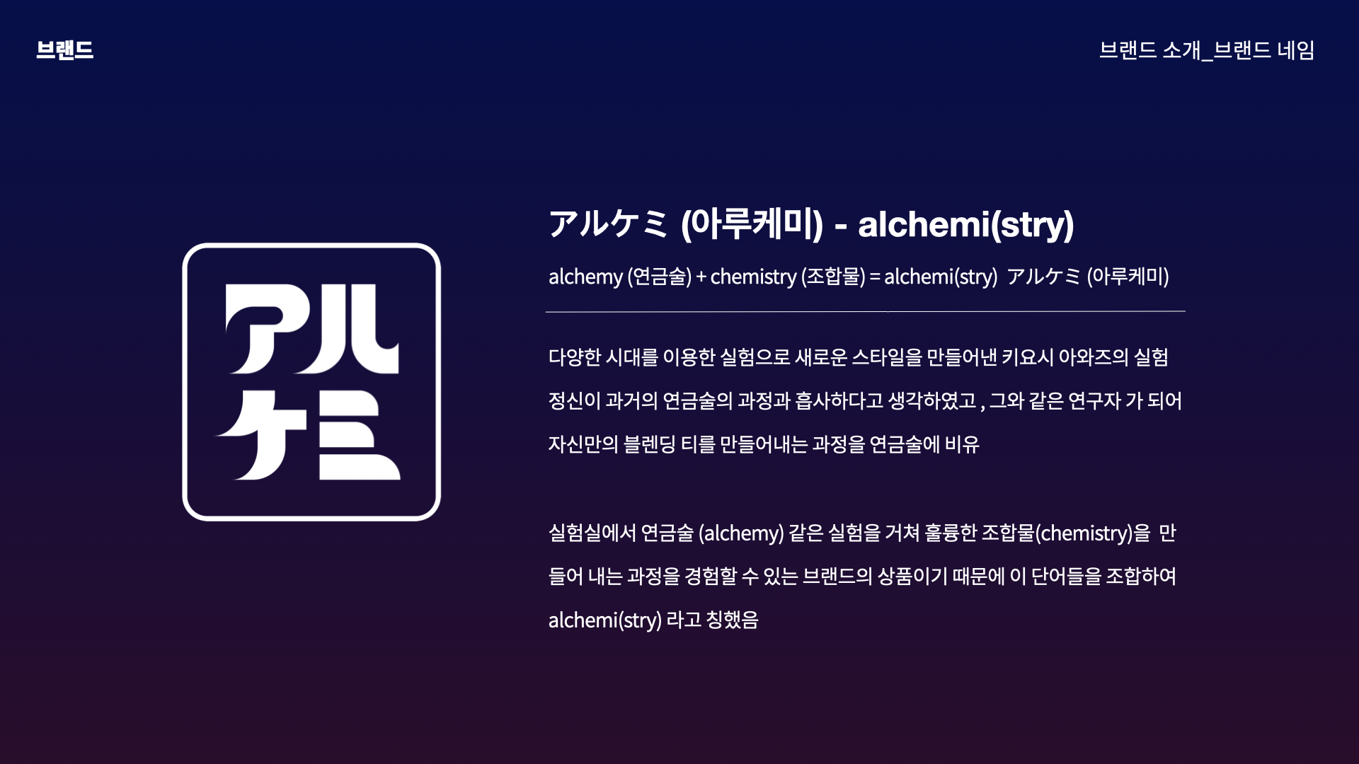 실험실에서 연금술(alchemy) 같은 실험을 거쳐 훌륭한 조합물(chemistry)을 만들어 내는 과정을 경험할 수 있는 브랜드의 상품이기 때문에 이 단어들을 조합하여 alchemi(stry)라고 칭했다.