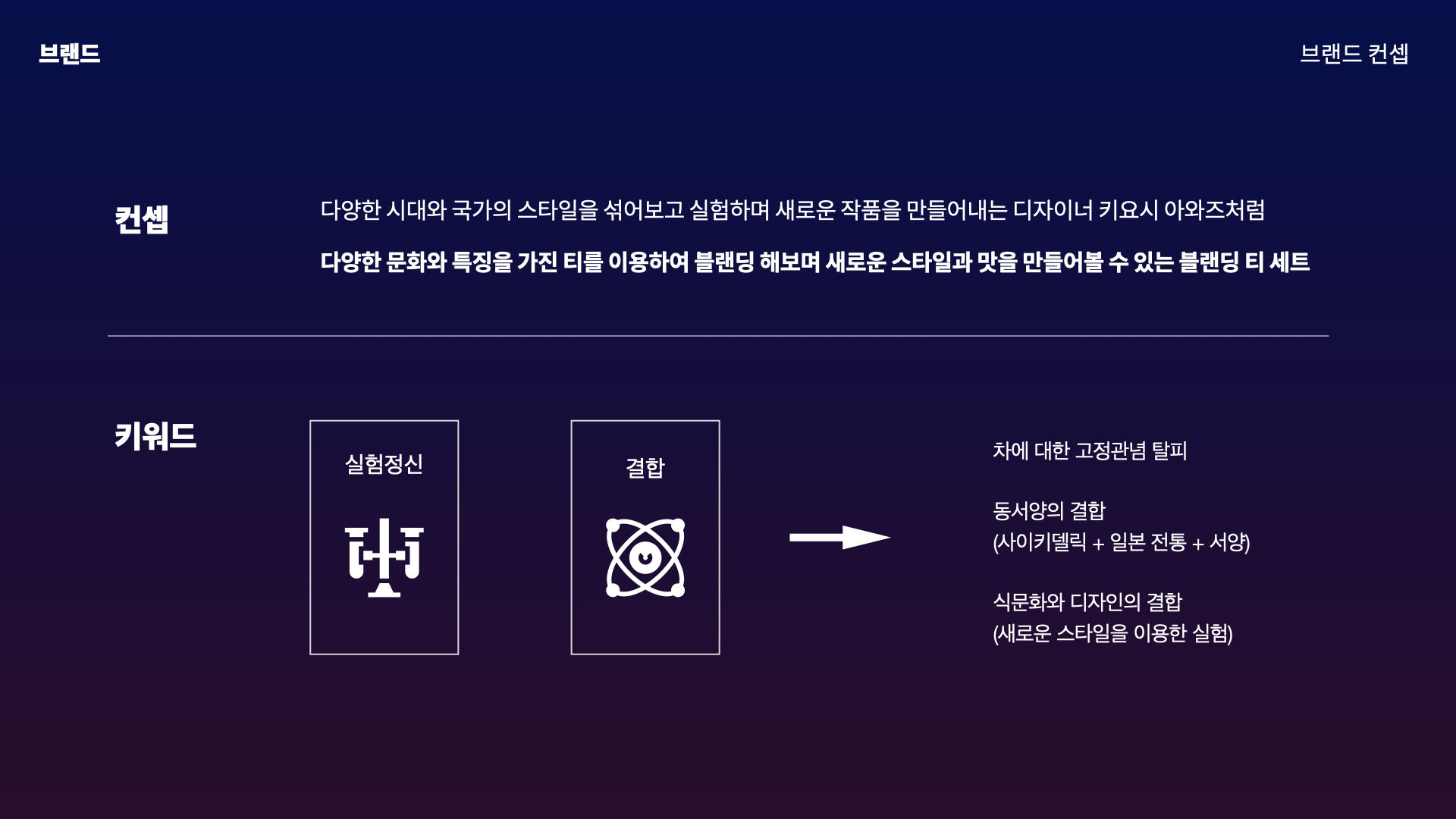 다양한 시대를 이용한 실험으로 새로운 스타일을 만들어낸 키요시 아와즈의 실험 정신이 과거의 연금술의 과정과 흡사하다고 생각하였고, 그와 같은 연구자가 되어 자신만의 블렌딩 티를 만들어내는 과정을 연금술에 비유했다.
