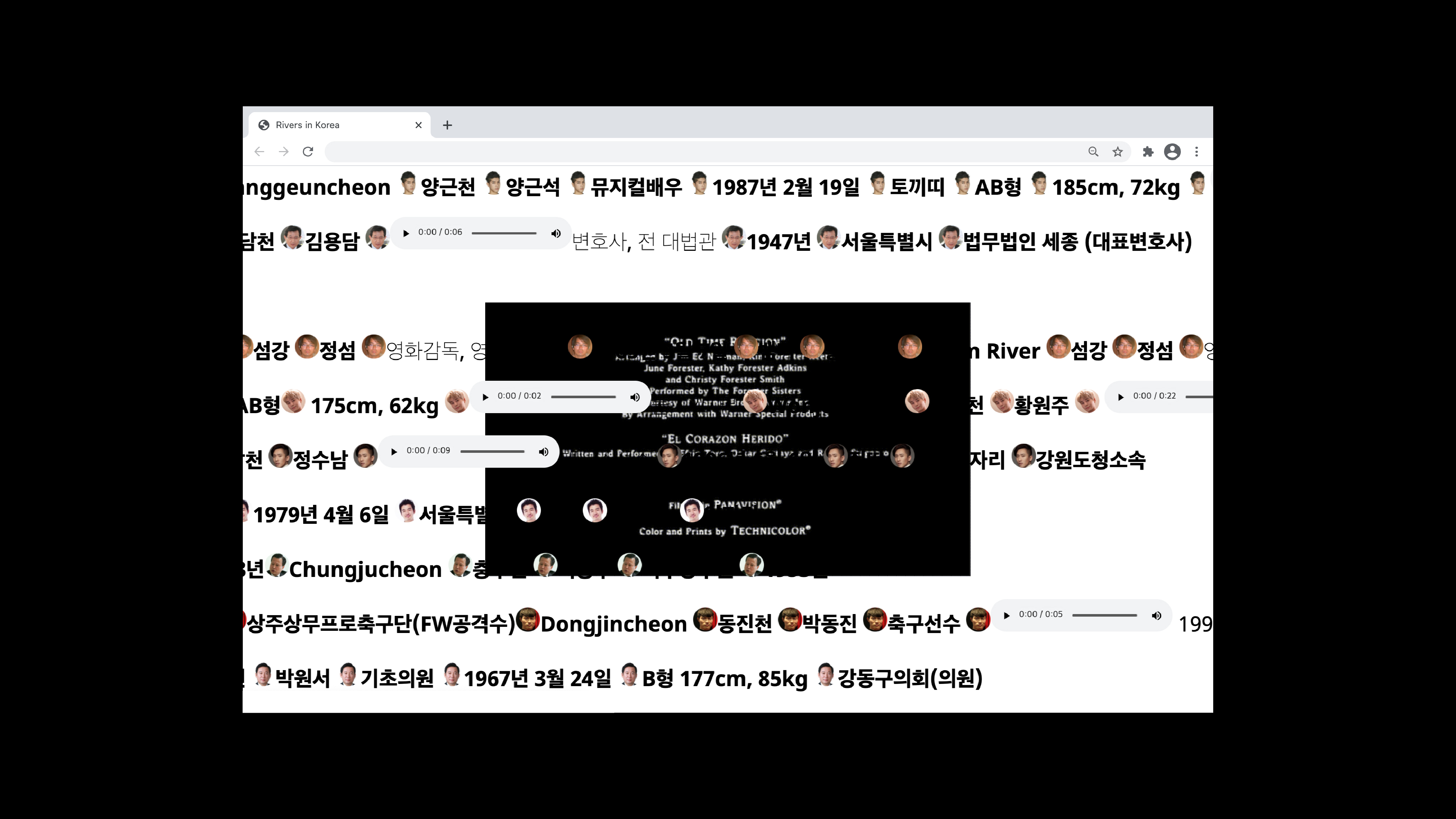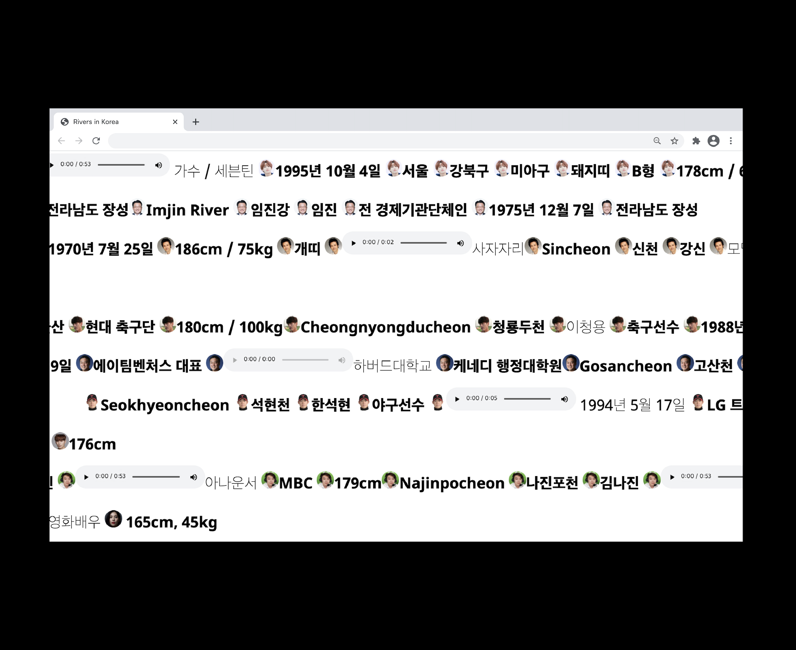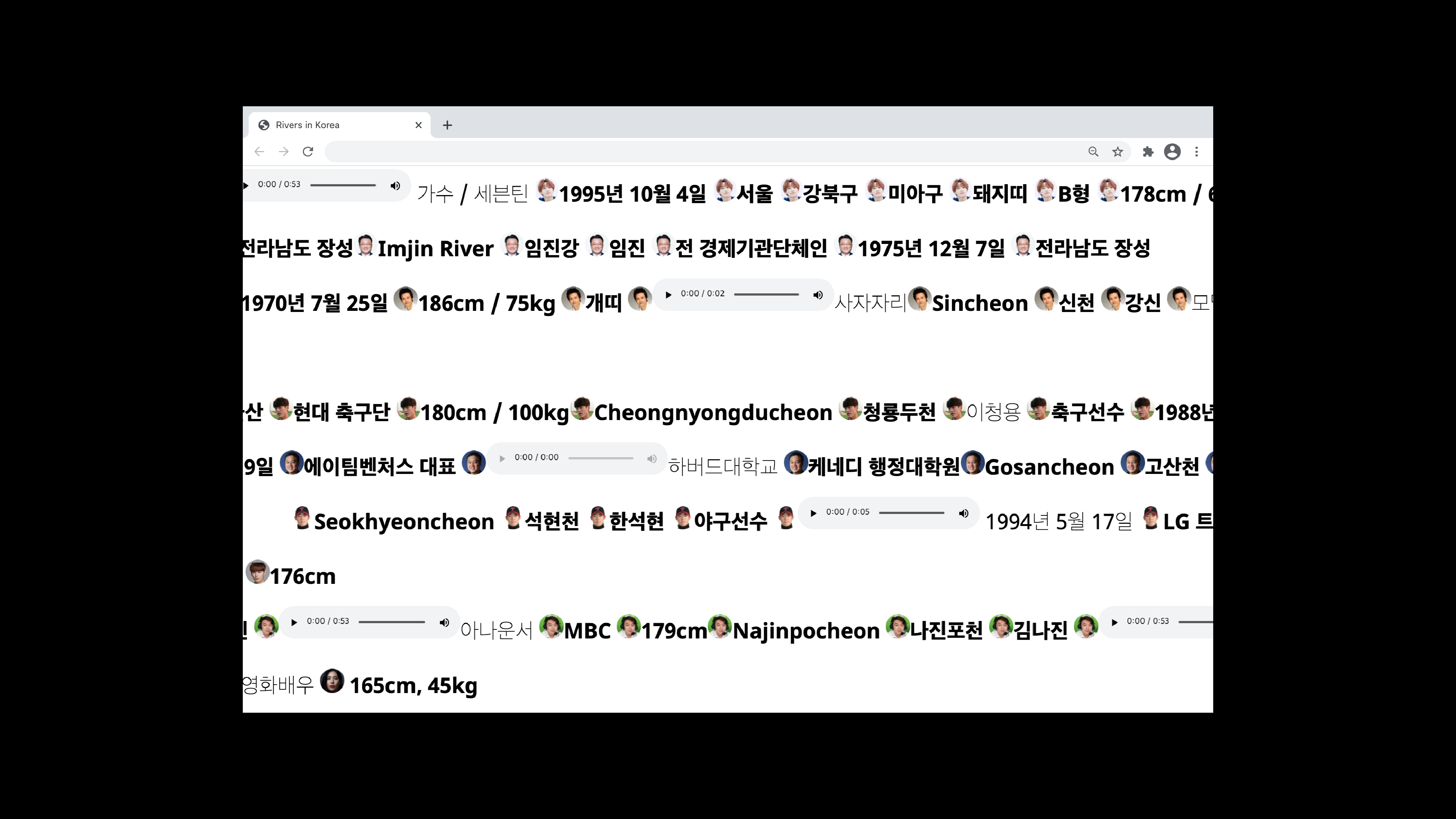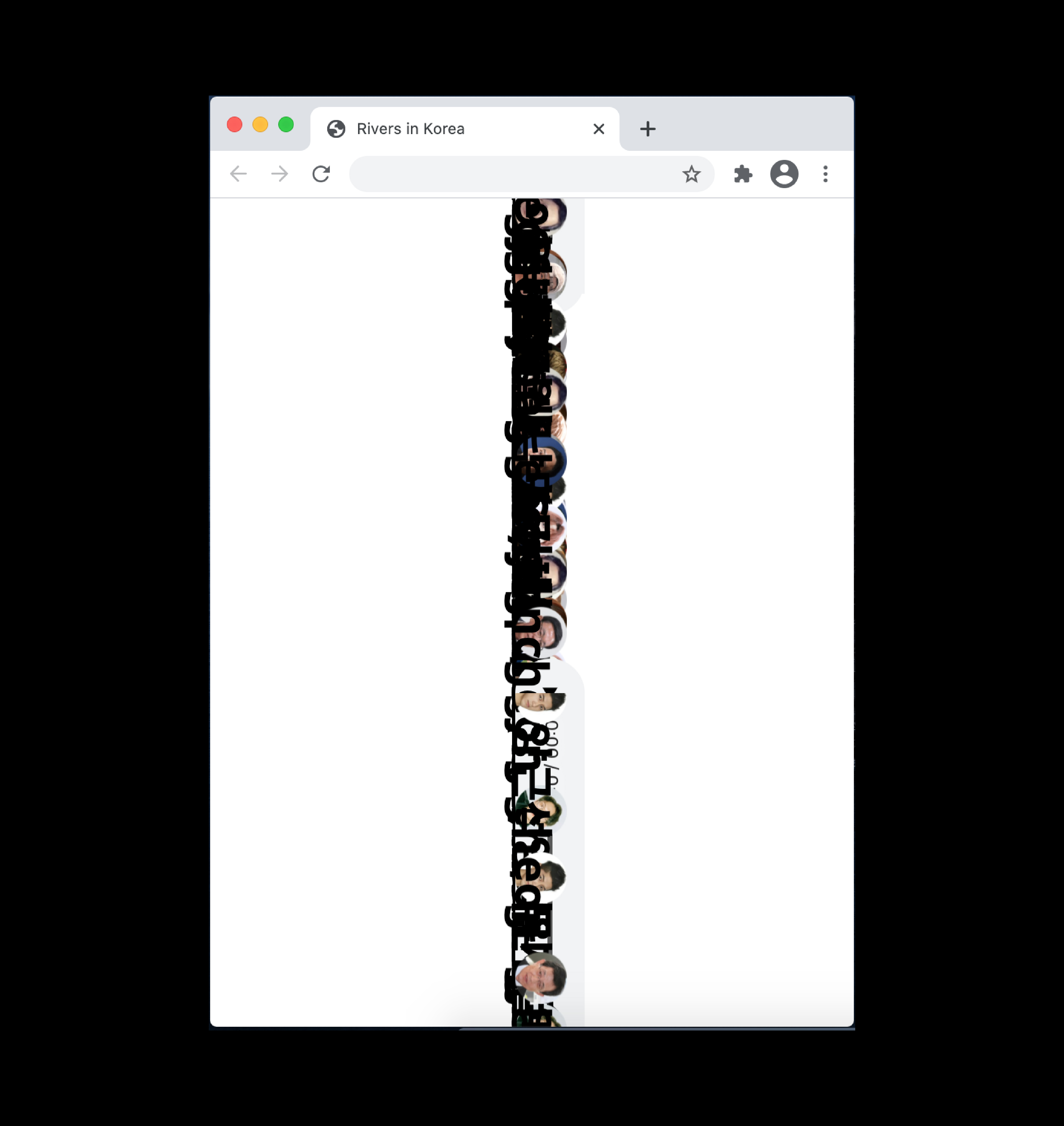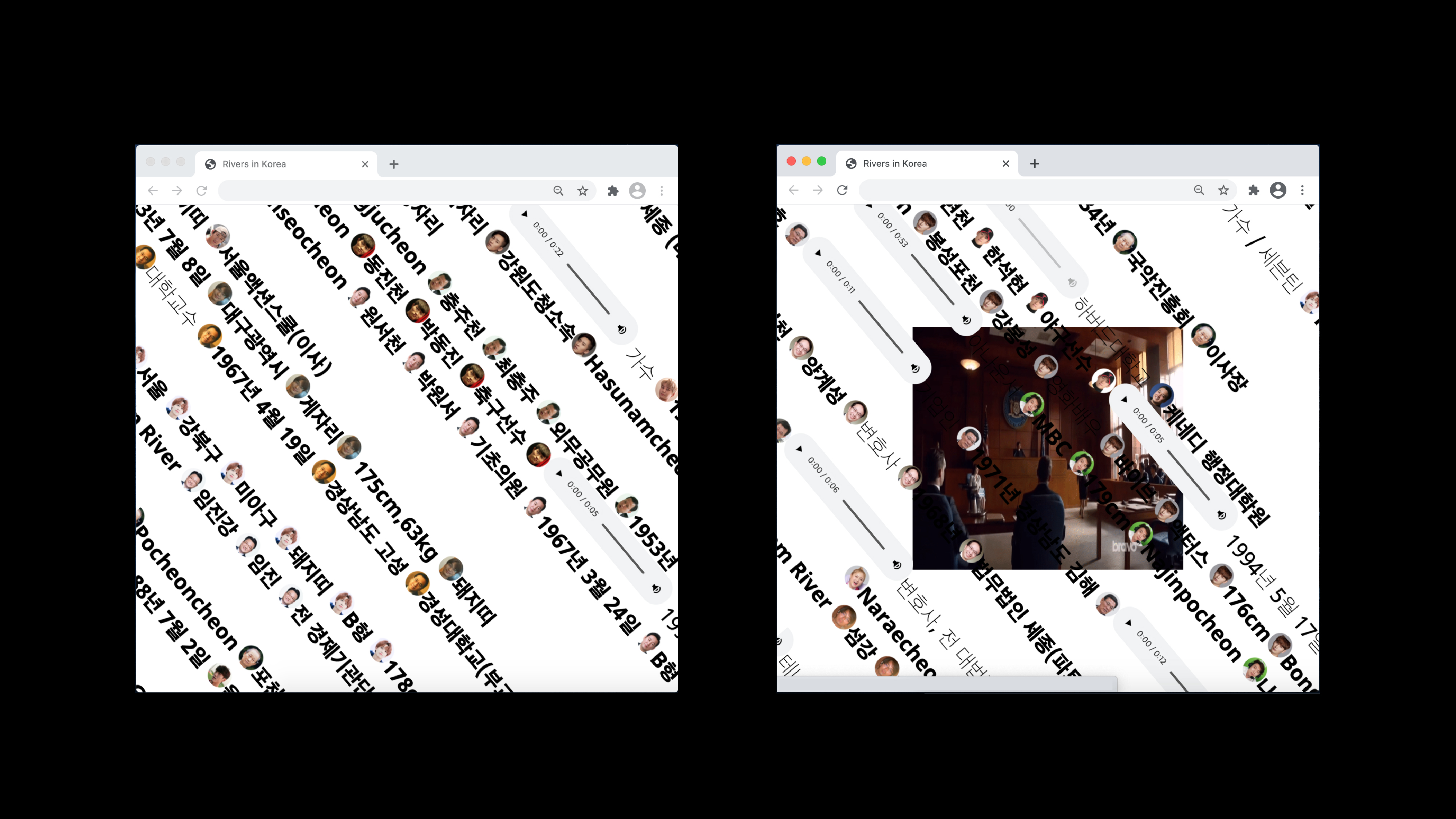 주어진 한국의 강 목록을 통해 강 이름과 이름이 같은 한국의 동명이인을 찾는다. 연관검색어를 통해 정보가 무한하게 이어지는 디지털 정보의 특성을 활용하여 끊임없이 연장될 동명이인들과 그 사람이 가진 키워드들로 또 다른 연관검색어가 링크된다. 강의 줄기 처럼 속도와 길이가 다르고 목록을 보여주는 환경 (브라우저 크기)에 따라 줄기의 방향이 달라진다.