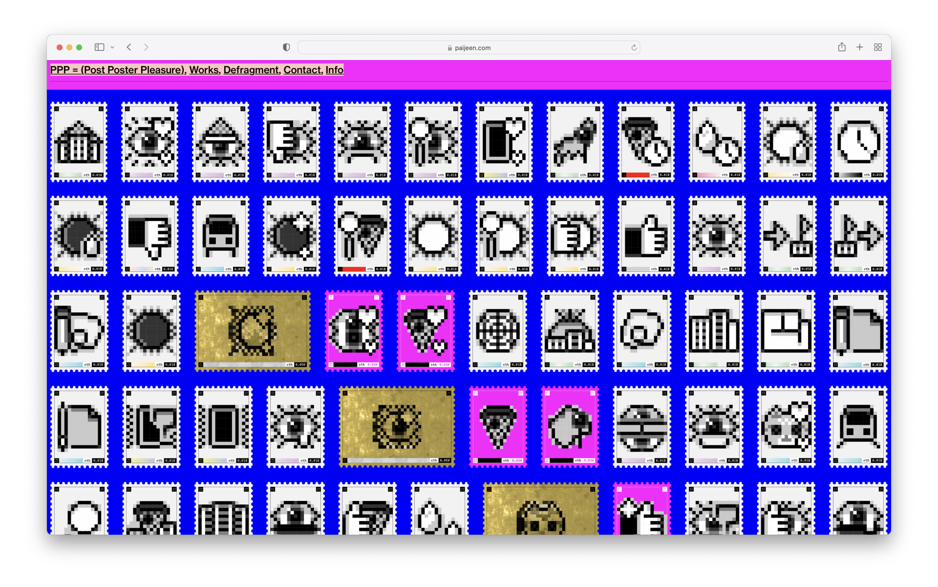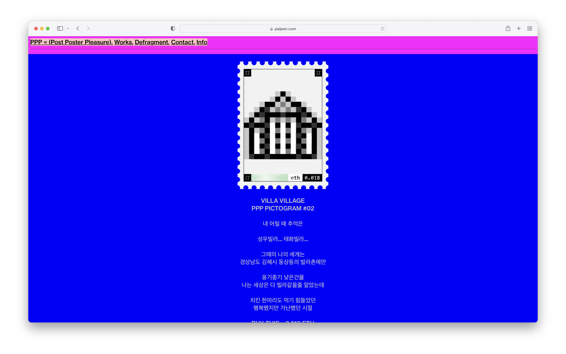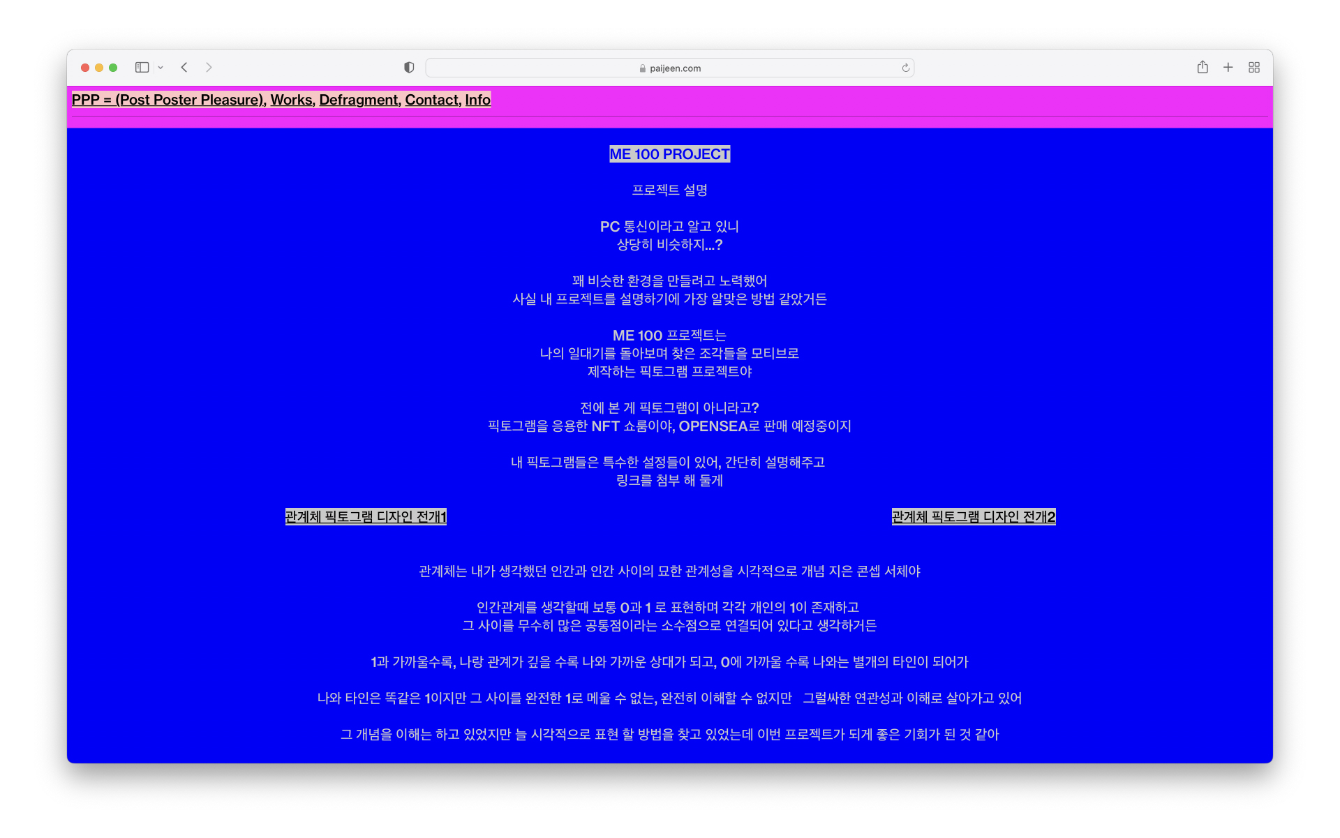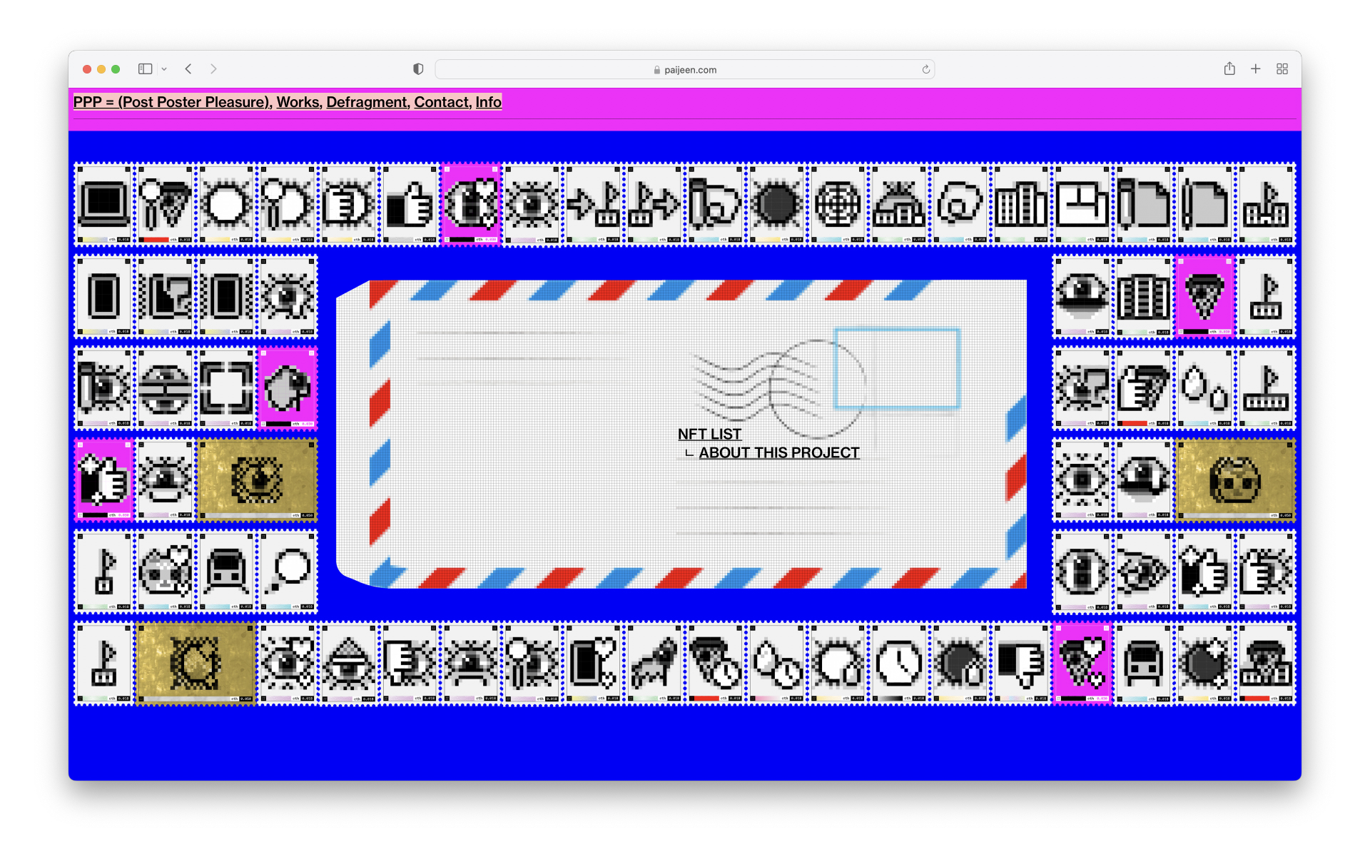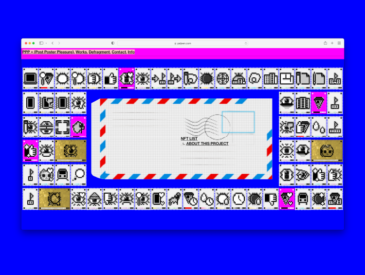 약 70점의 추상화 픽토그램들은 보편적인 매체가 아닌 우표에서 아이디어를 얻은 NFT 우표로 제작이 되며, 쇼케이스 사이트는 draggable 로 제작되어 직접 도트로 구성된 편지봉투에 끌어놓아 관람 할 수 있습니다. 각 우표마다 고유의 '나'와 관련된 스토리가 있으며 NFT LIST 에서 확인가능합니다.