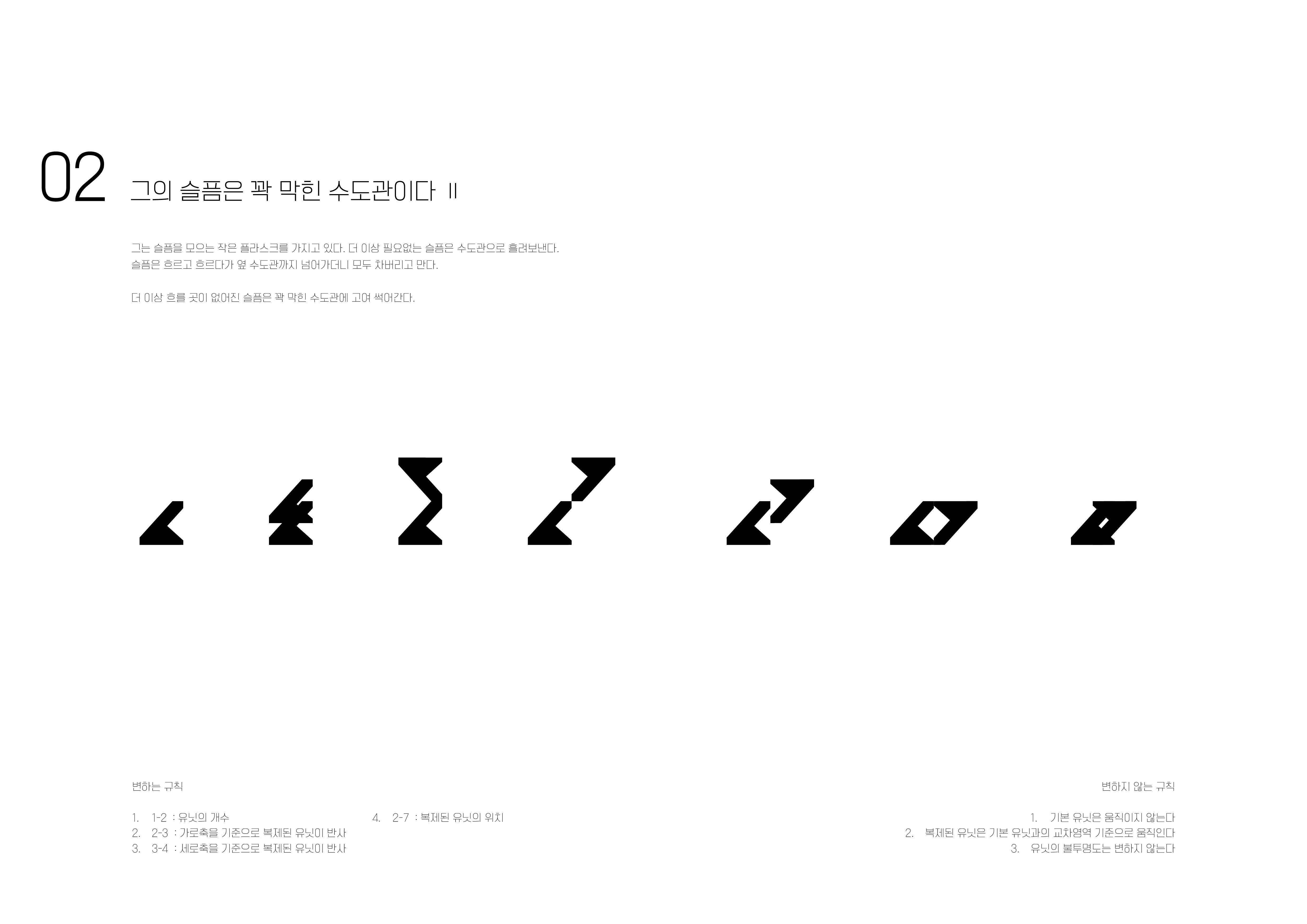 우연 속에서 도형을 만들어내고, 그 도형을 활용해 시퀸스와 패턴을 만들고, 그 복잡한 패턴 속에서 핵심을 파악하고 그 속에서 이어지는 규칙을 찾아 폰트를 만들었습니다.