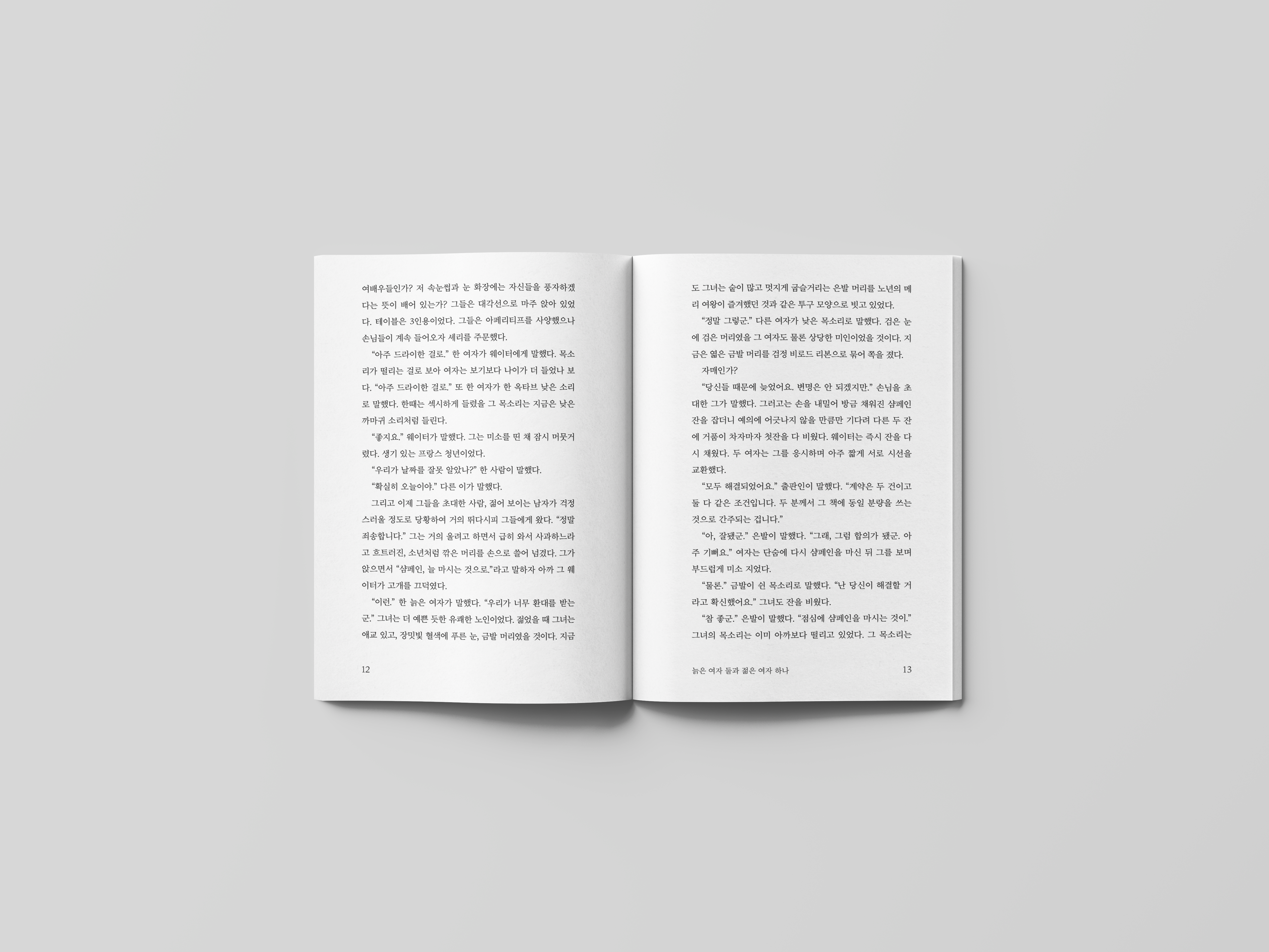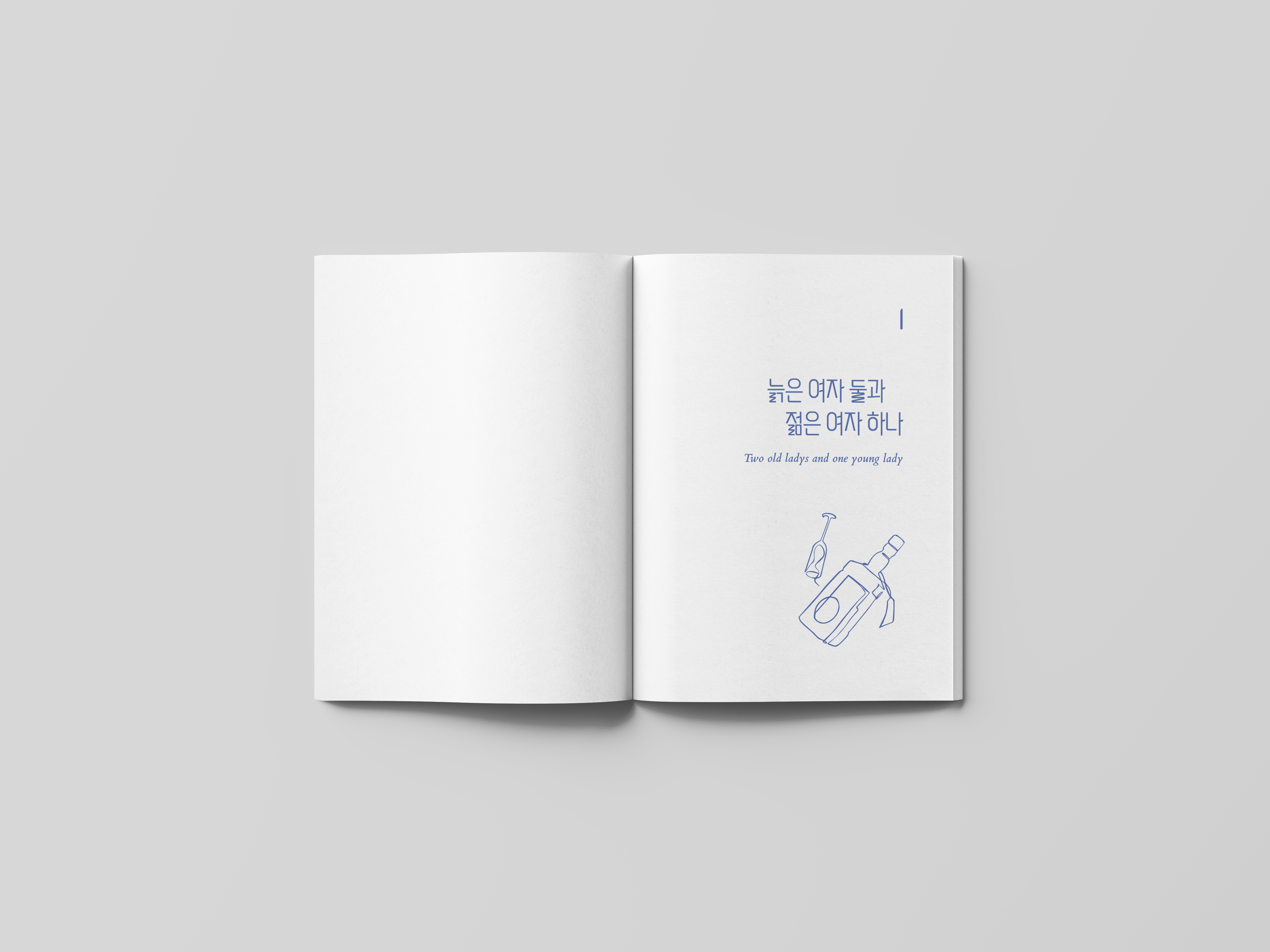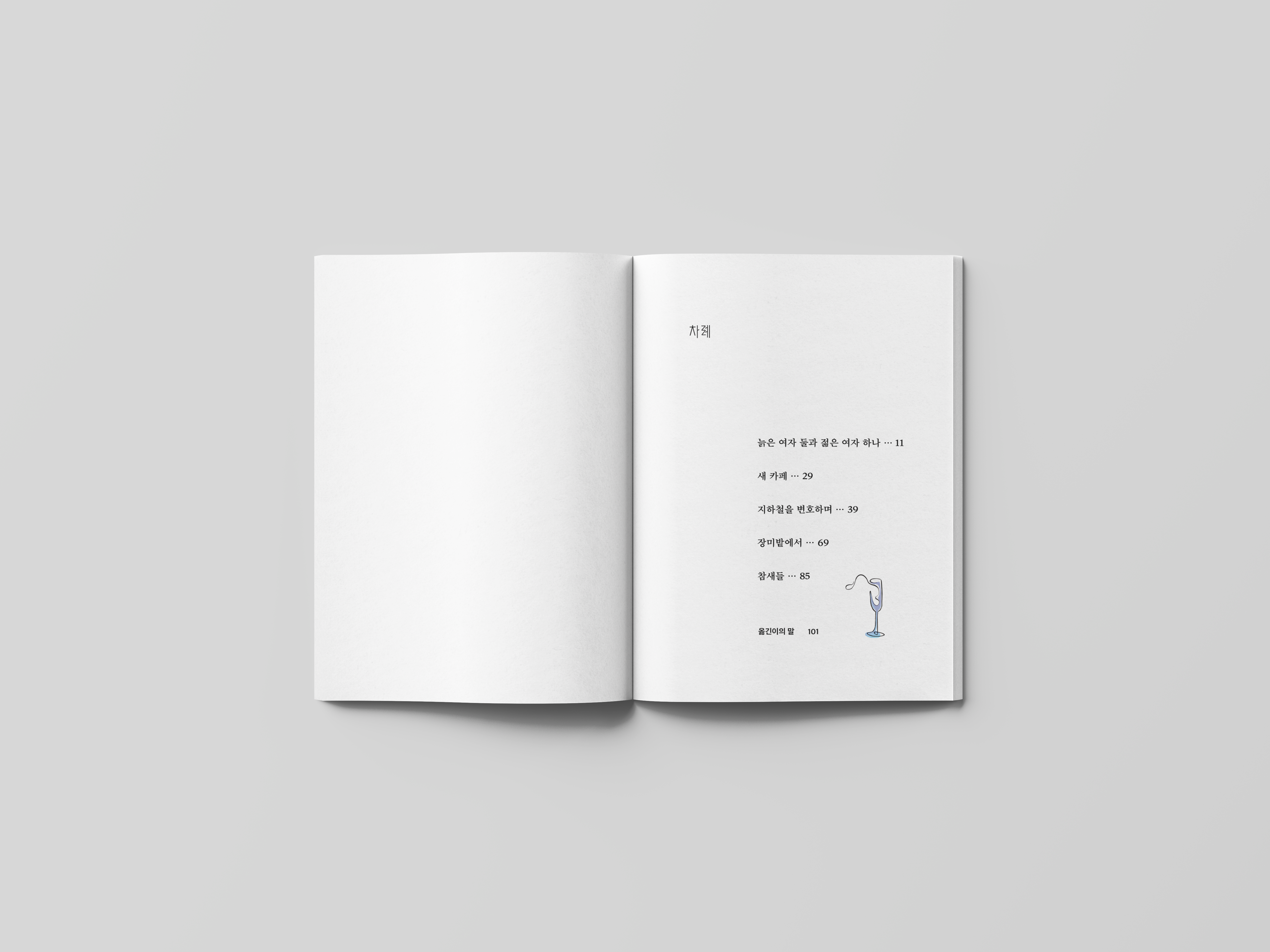 서정적인 드로잉, 가벼운, 등을 디자인 키워드로 도출해 수록된 소설 속 오브젝트를 콜라주 형식으로 배치했다. 또한 제목과 색지, 장 챕터를 푸른색으로 사용하고, 표지에서 그려진 상징물들을 장 챕터에 배치하여 전개하여 독자가 한 권의 책을 끝까지 넘겼을 때 전체적인 시각적 연결성을 느낄 수 있어 독자의 흥미를 지속해서 끌 수 있는 것 또한 목표로 하여 디자인했다.