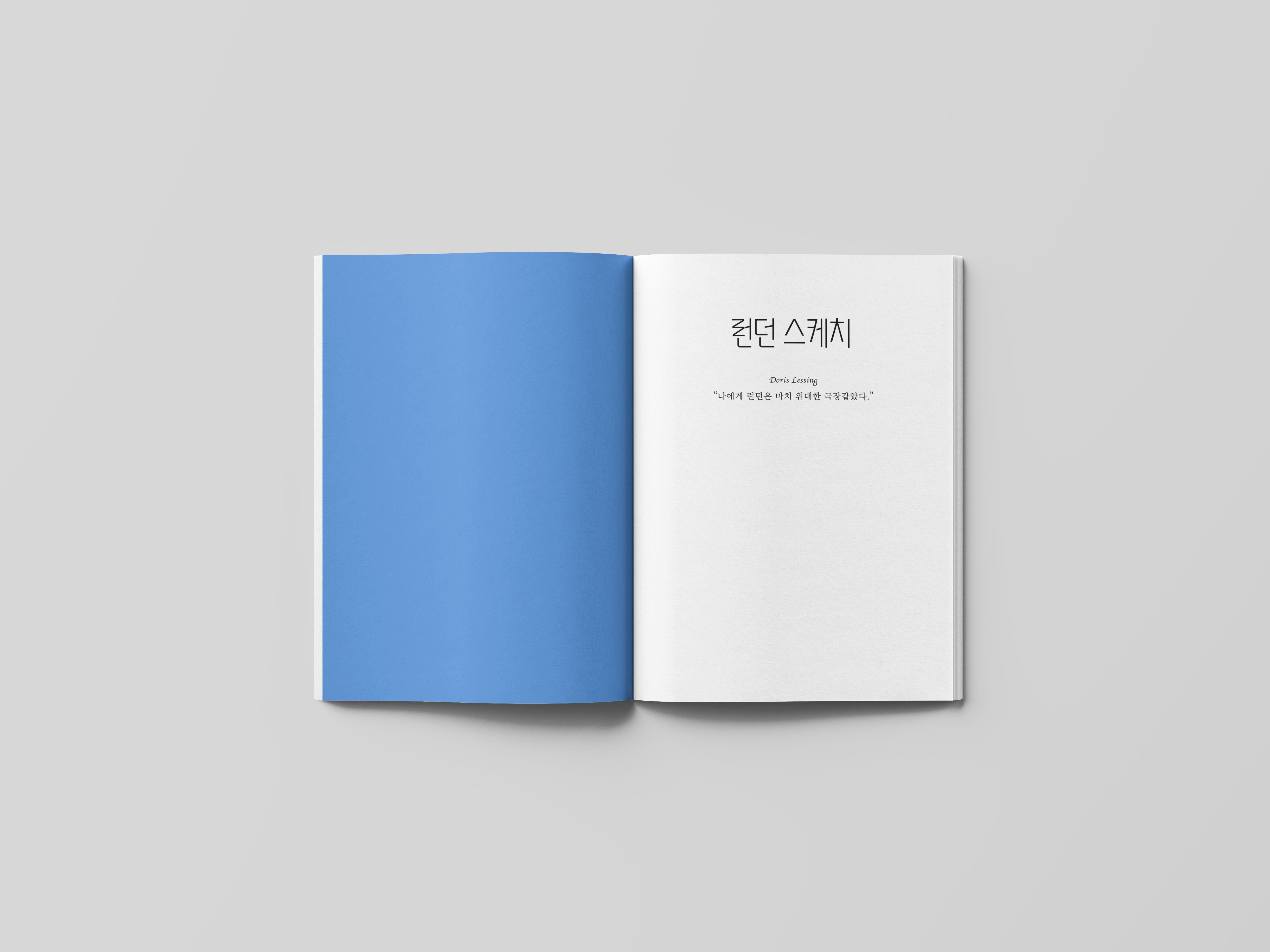 도리스 레싱의 단편집인 『런던 스케치』는 영국에서 1992년에 출간된 작품집으로 레싱의 작품 중 가장 서정적이라고 평가받는 작품이다. 이 작품 중 가장 서정적이면서도 객관화된 시선으로 특정 공간에서 벌어지는 일을 잘 녹인 작품들을 팀원들과 추려, 그 특성을 전체적인 책의 디자인으로 드러내 보고자 진행한 프로젝트이다.