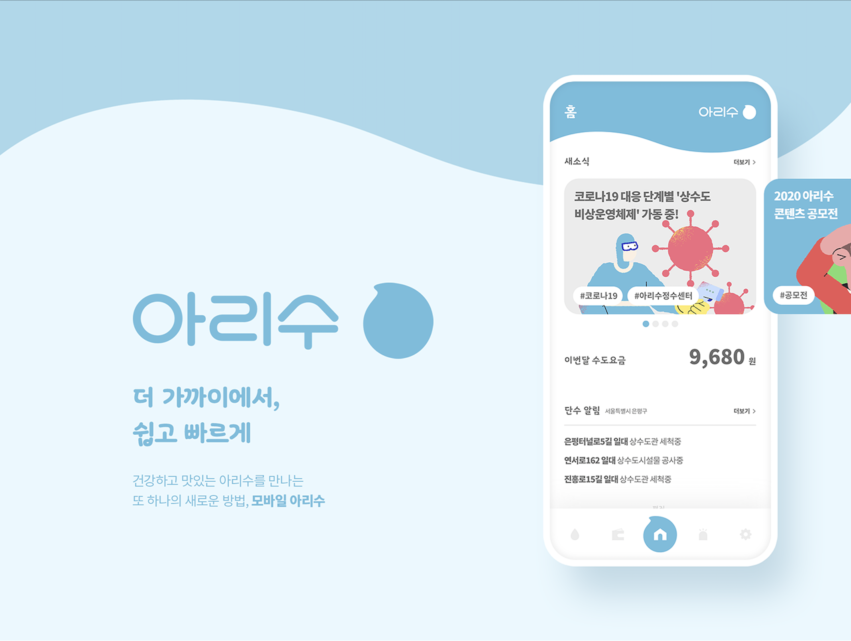 기존 웹의 메뉴와 제공되는 정보 모두 그대로 옮겨, 앱이라는 차별화 없이 서비스되고 있던 앱의 구조적 문제에 주목하였다. 사용자가 늘 휴대하는 '모바일'이라는 플랫폼에서 제공되어야 하는 '아리수' 서비스는 무엇인가— 라는 고민은 새롭게 디자인된 앱의 정보구조를 통해 드러난다. 새로워진 '모바일 아리수'는, 정보의 전달과 민원 접수 서비스에 집중한다. 사용자는 이제 해당 앱을 통해 개인화된 아리수 소식을 받아보며 수도 요금을 간편하게 확인·계산하고, 음수대에 관한 불편 사항과 가정에서의 수도 문제를 빠르게 접수할 수도 있다.