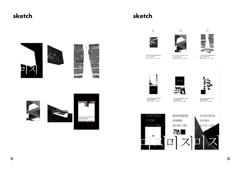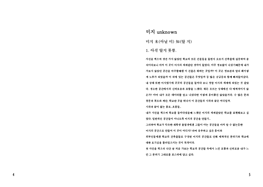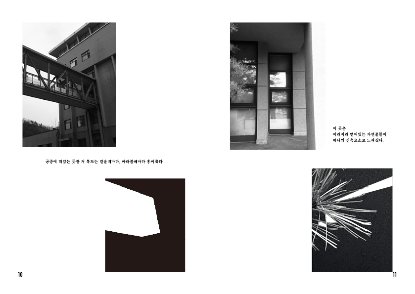 이 과제 덕분에 처음으로 캠퍼스 전체를 둘러보았다. 내가 생활하는 정보관과 파라다이스홀만 나에겐 학교라고 인식되었고 내가 갈 일이 없는 건물들은 그저 나한텐 배경이었다. 이 학교에 캠퍼스는 어디서부터 어디까지인지 아무 정보 없었던 상태로 사진을 찍으며 전체를 돌았을 땐 내 머릿속도 미지 내가 발걸음 하는 곳들도 그저 미지였다. 어떠한 것이 미지의 상태일 땐 그것이 사람이든 배경이든 더 매력적이게 다가온다. 내가 느꼈던 신비로웠던 미지의 기분을 시각적으로 매력적으로 표현하여 학교에 아무 정보 없는(미지) 사람들에게 흥미를 불러일으키고 싶었다.