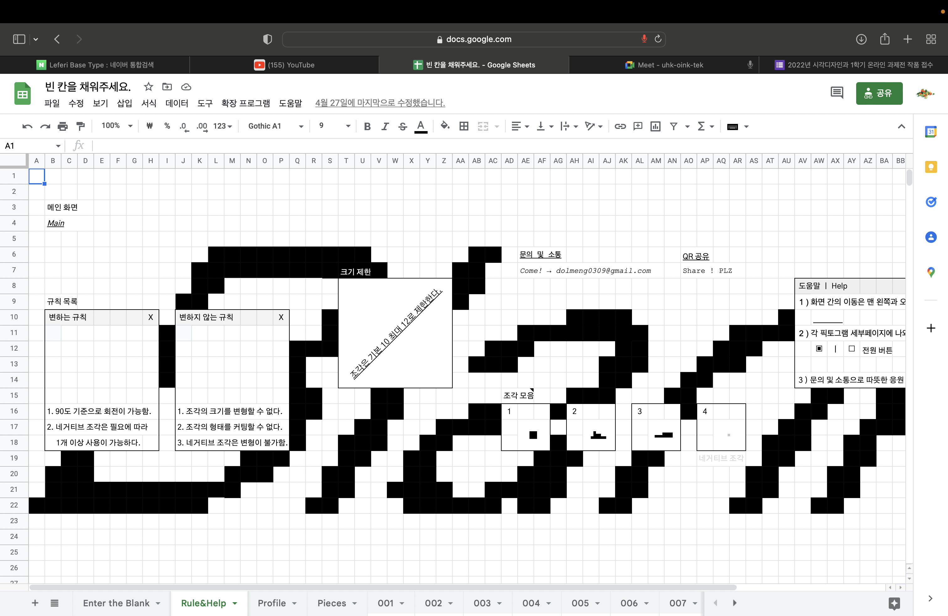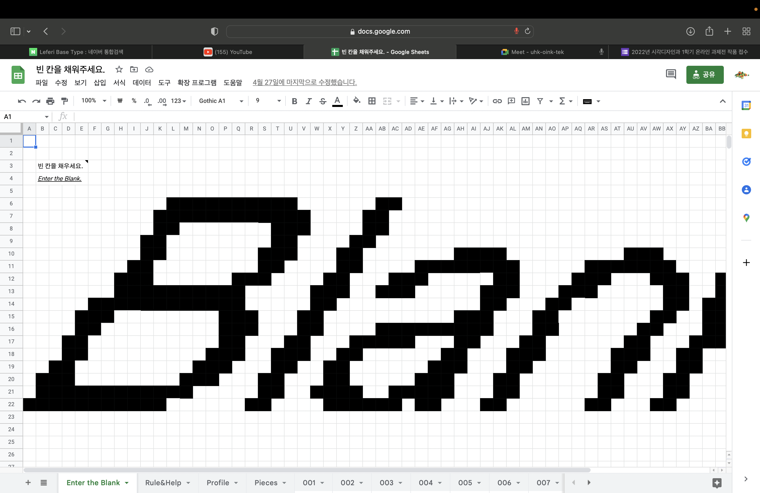 이 작품은 어떠한 특정한 디자인 툴을 활용한 것이 아닌, 구글 엑셀(Excel)을 이용하여 제작하였다. 수 많은 수직과 수평의 선으로 구성되어있는 칸들이 모여 정보와 데이터를 구조화한다. 나는 이러한 엑셀의 특성과 나의 '빈 칸'이라는 특성을 연결지어 웹사이트 형식의 결과물을 제작하게 되었다.