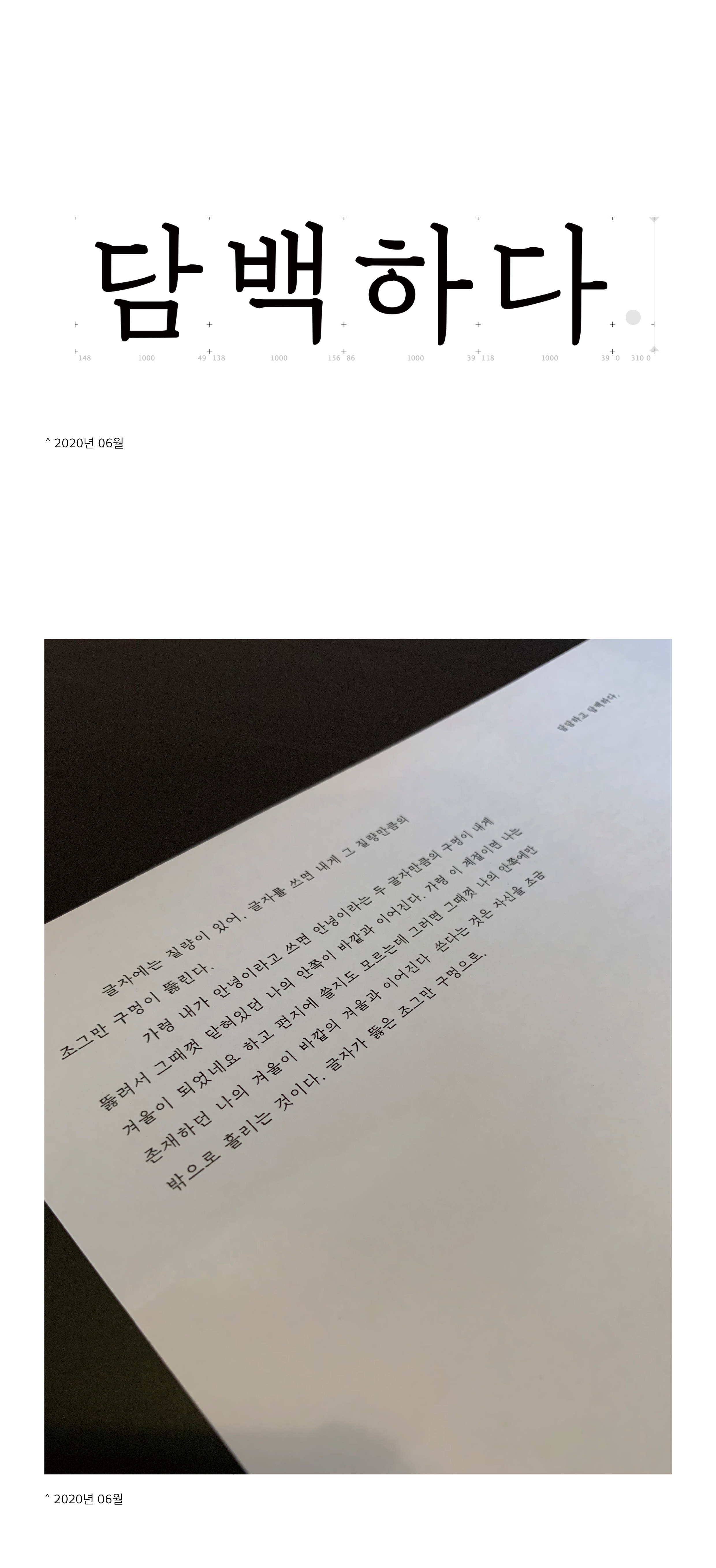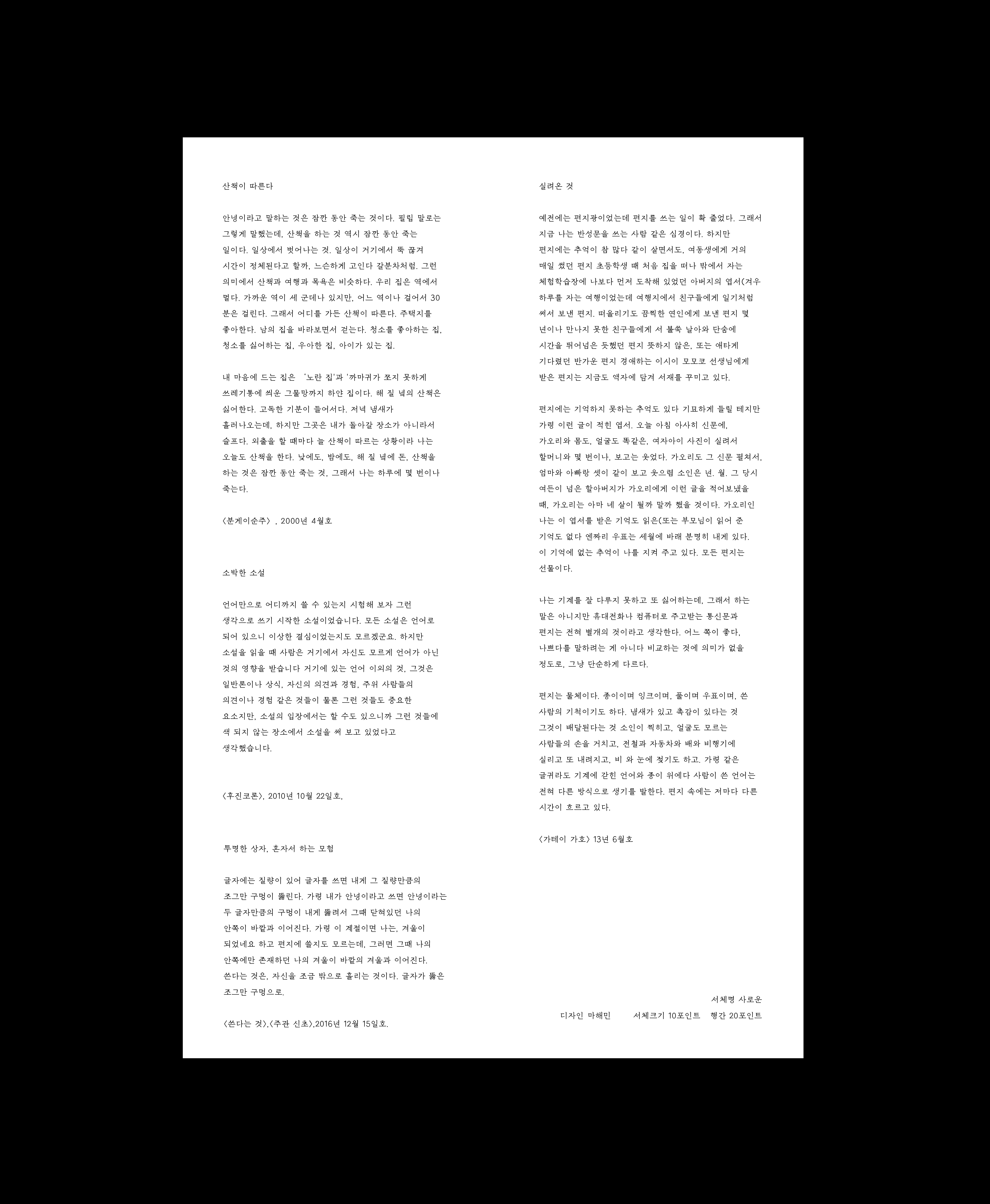 사로운은 10pt가 기준인 본문용 서체이다. 획 굵기의 변화가 적고 공간의 대비가 크지 않아서 담담하고 담백한 인상을 준다. 본인의 사사로운 생각, 감정, 경험을 담백하게 보여주기에 좋다. 이 글자의 작업물은 인쇄물로 소개된다.