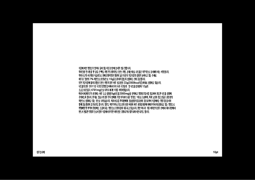 성분표시체는 10pt 성분을 표시하는 글씨체로 약이나 재료의 성분을 조심해야 하는 사람이나 노인들을 위해 만들었다.