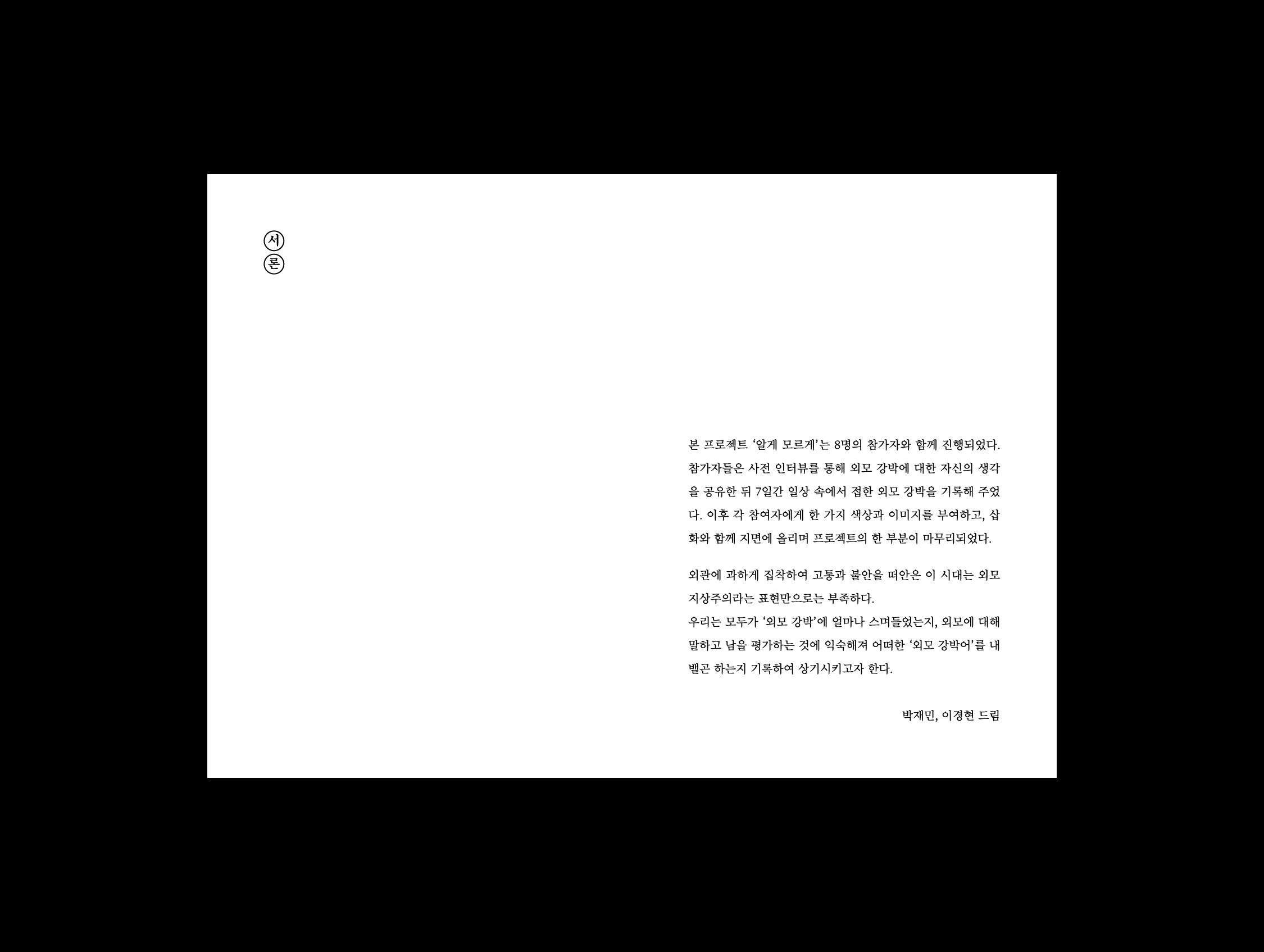 우리는 모두가 ‘외모 강박’에 얼마나 스며들었는지, 외모에 대해 말하고 남을 평가하는 것에 익숙해져 어떠한 ‘외모 강박어’를 내뱉곤 하는지 기록하여 상기시키고자 한다.