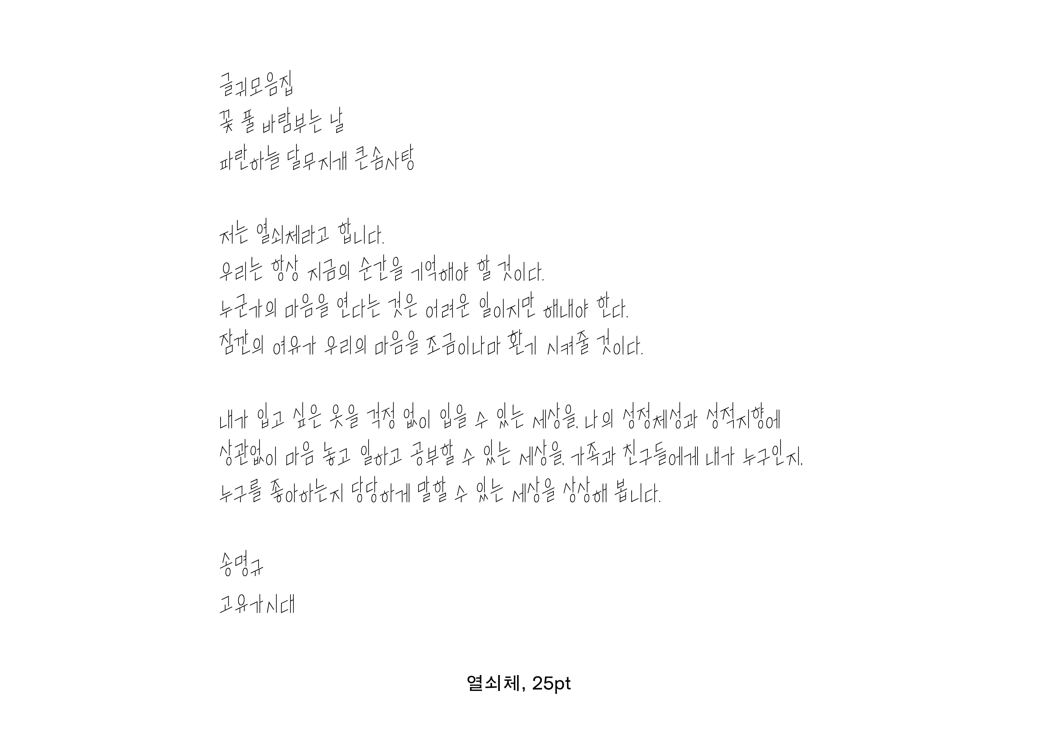 열쇠체는 각기 다른 사람들의 이름을 쓰는데 사용이 될 수도 있으며, 비밀편지 혹은 암호를 전달하는 역할로 사용되는 서체를 만들어 보고 싶었습니다. 아래 링크를 통해 지금까지 그린 서체를 웹에서 즐길 수 있습니다.