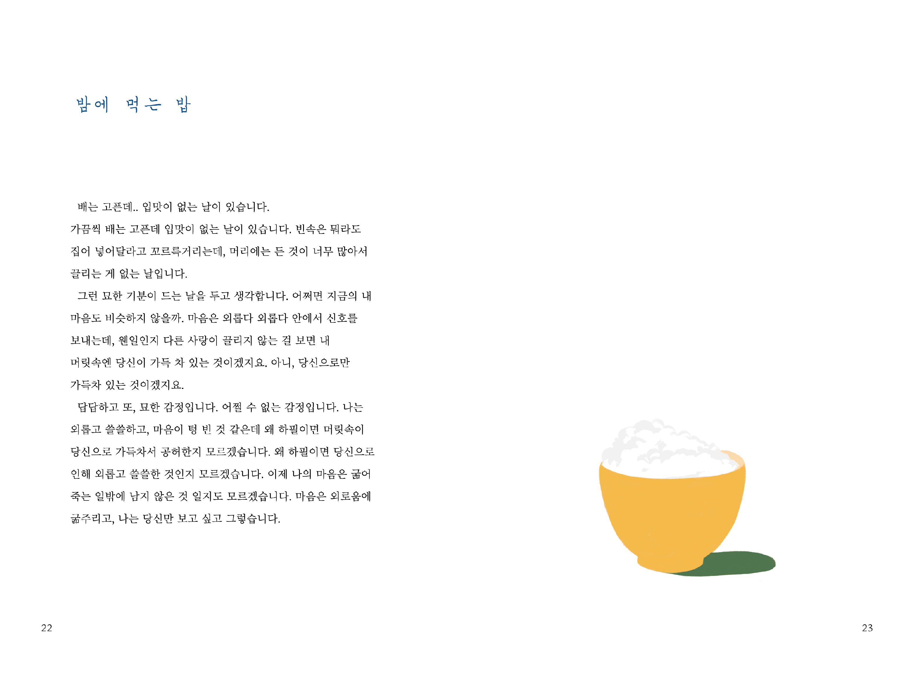 주요 페이지에 일러스트를 활용해 외로움이 마냥 어두운 감정이 아니라 , 외로움은 누구나 가지고 있으며 회복해 나갈 수 있다는 메세지를 담으려고 했다. 밝은 옐로우, 그레이, 다크 그린 세가지 색깔만을 사용해 과하지 않고, 세련되면서도 따뜻한 느낌을 주려고 했다. ' 우린 모두 다 일인분의 외로움을 안고 살아간다. ' 는 메세지를 이번 프고젝트를 통해 전하고자 했다.