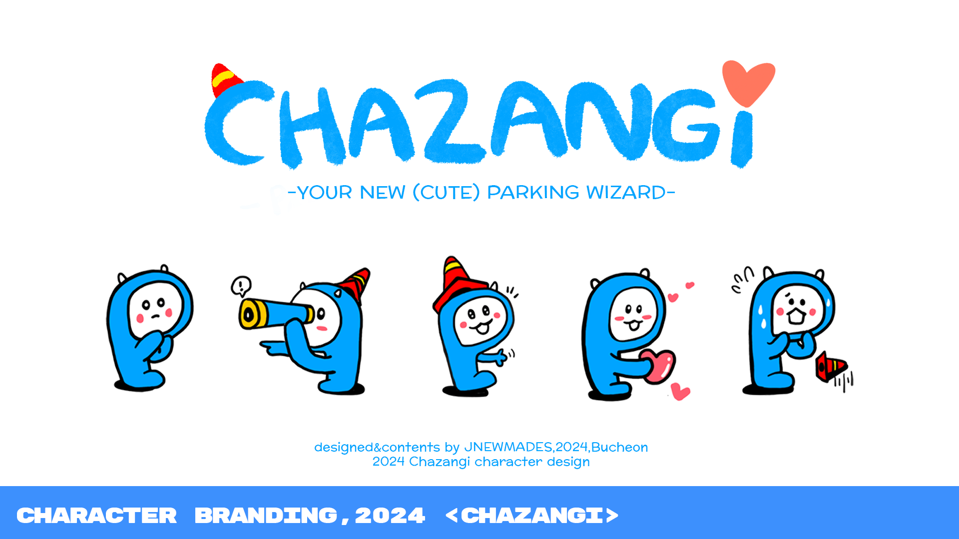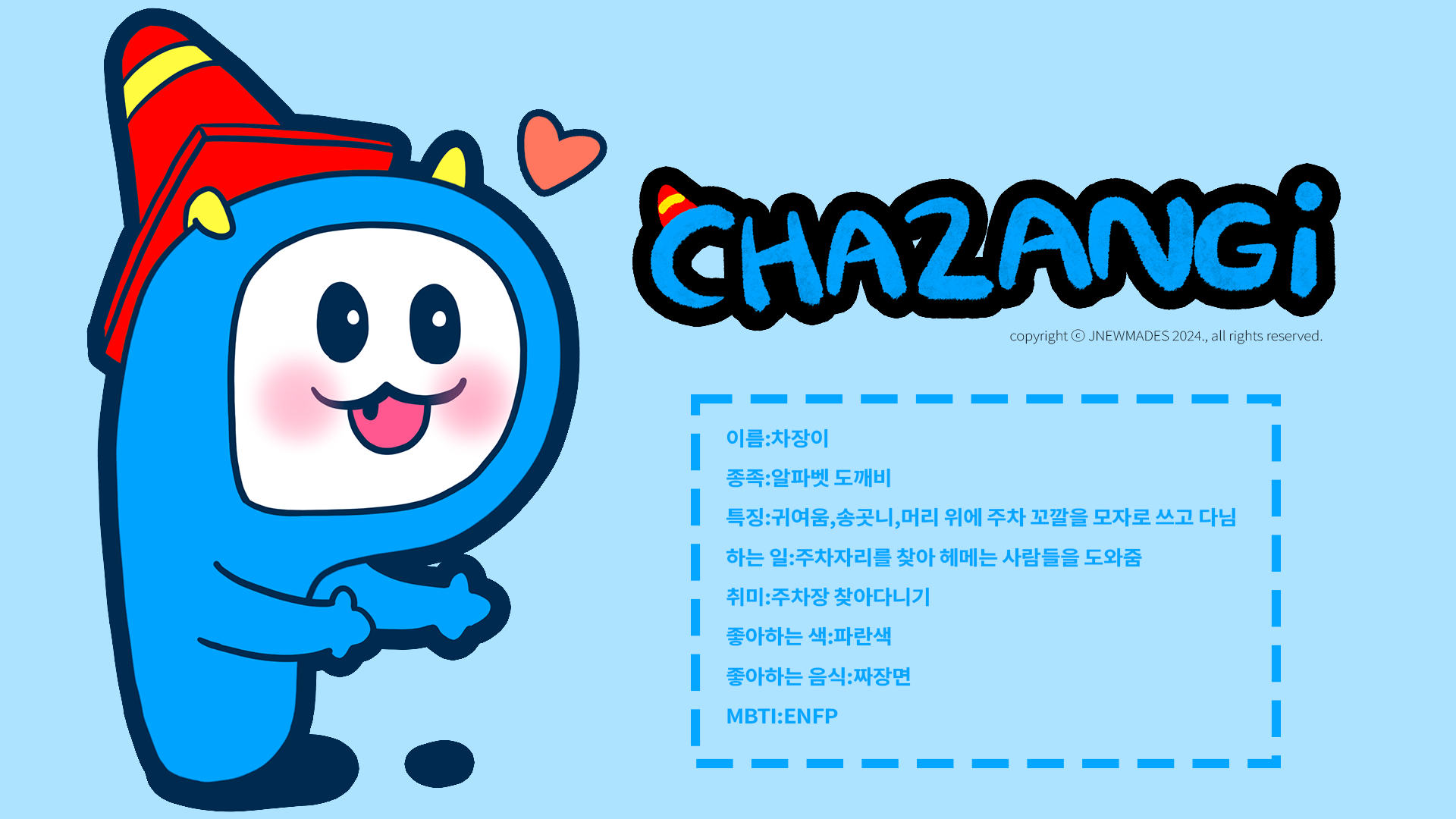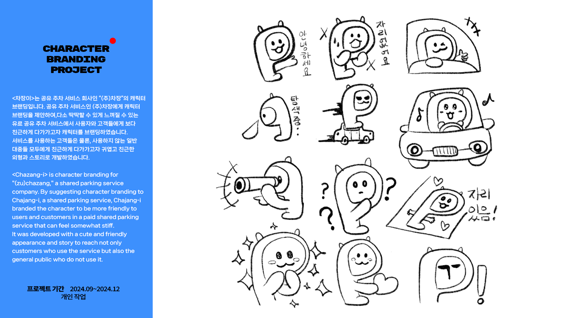 공유 주차 서비스인 (주)차장에게 캐릭터 브랜딩을 제안하여, 다소 딱딱할 수 있게 느껴질 수 있는 유료 공유 주차 서비스에서 사용자와 고객들에게 보다 친근하게 다가가고자 캐릭터를 브랜딩하였습니다. 서비스를 사용하는 고객들은 물론, 사용하지 않는 일반 대중들 모두에게 친근하게 다가가고자 귀엽고 친근한 외형과 스토리로 개발하였습니다.