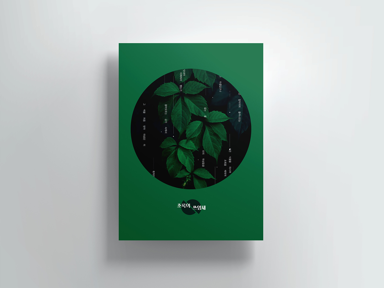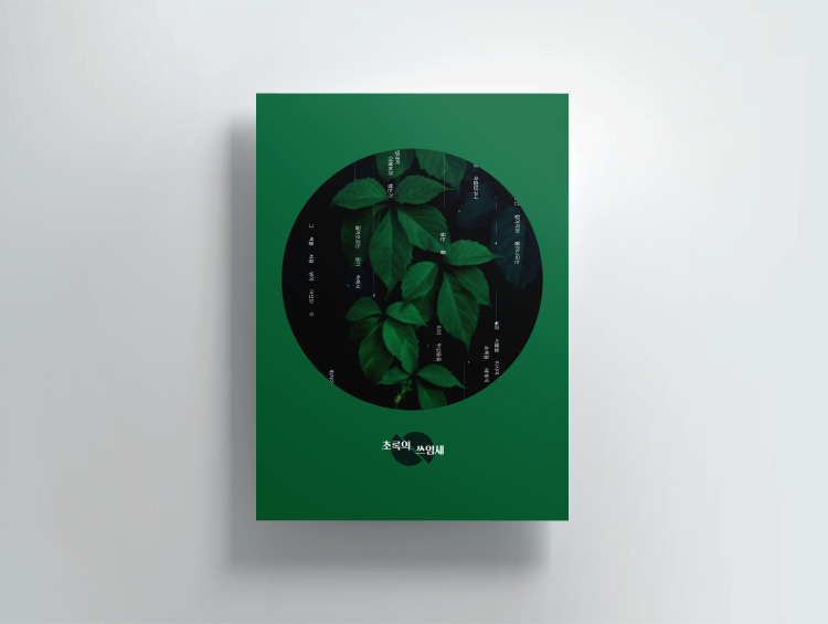 <초록의 쓰임새>라는 시를 담아 만든 포스터이다. 비 오는 날 초록의 풍경과 빗물에 담긴 문자를 표현했다. 이파리 표면의 미묘한 요철을 살릴 수 있는 질감의 펄지를 선택하여 인쇄했다.