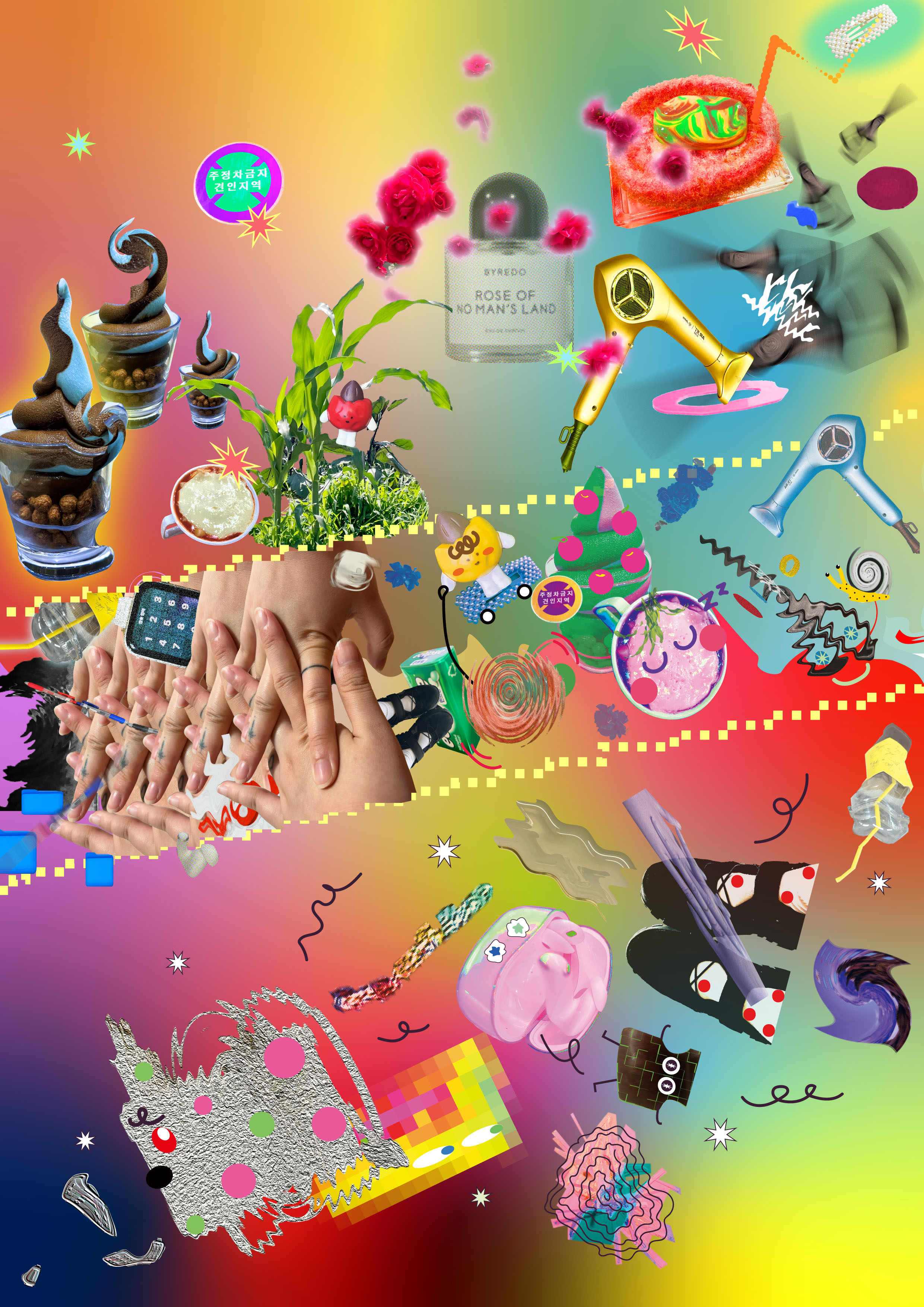 학교에서 처음 만난 두 사람이 정한 조건 -시간, 이미지, 감정, 색상- 에 따라 각자의 경험을 기록하고, 이를 편집하여 하나의 유기적인 흐름으로 구성한 작업이다. 상단과 하단에는 각각 개인의 시간이 분리되어 표현되며, 중앙은 두 사람의 시간이 겹치는 구간으로, 함께 보낸 시간 동안 관찰한 서로의 이미지를 콜라주 방식으로 풀어냈다.
