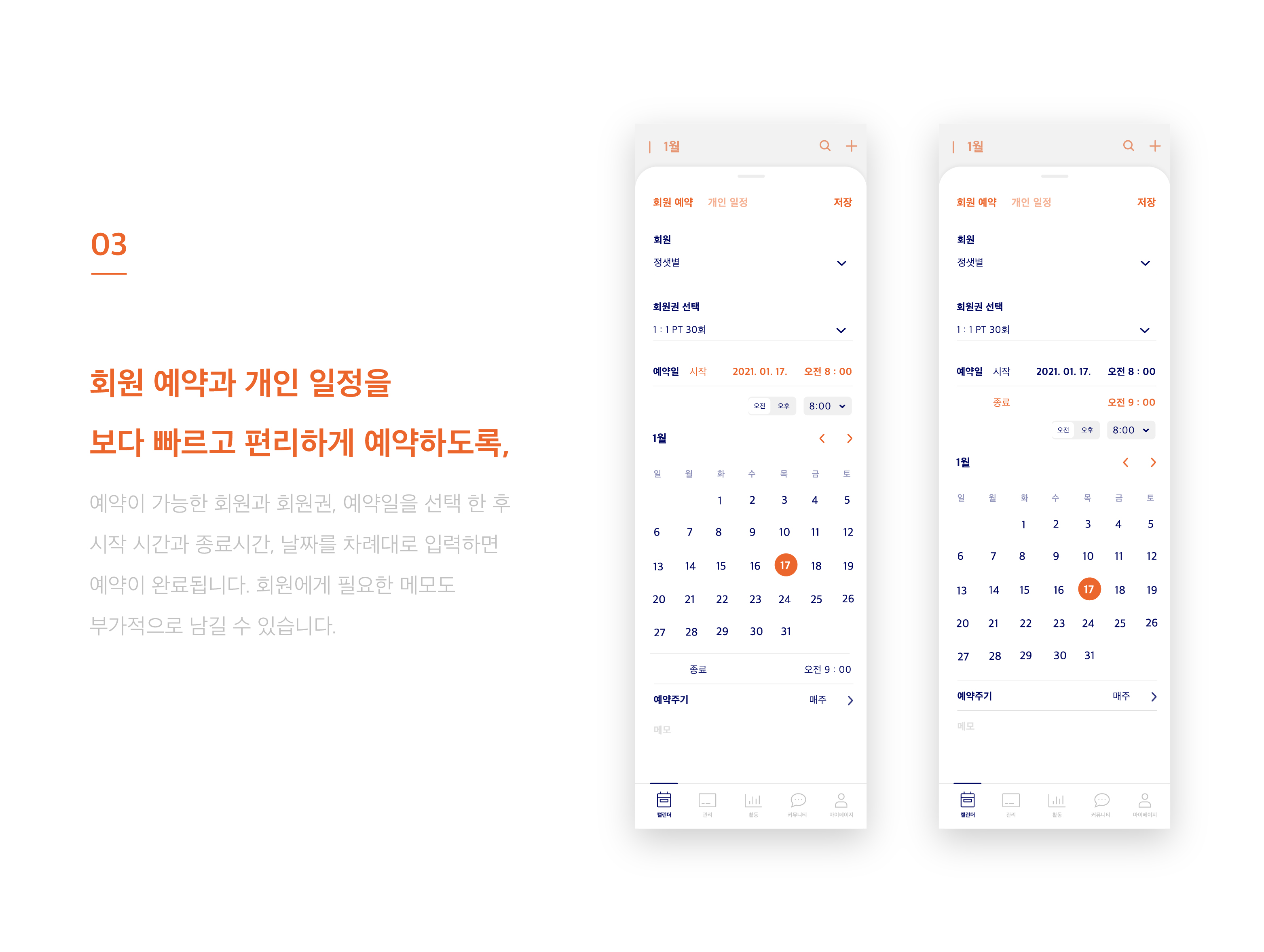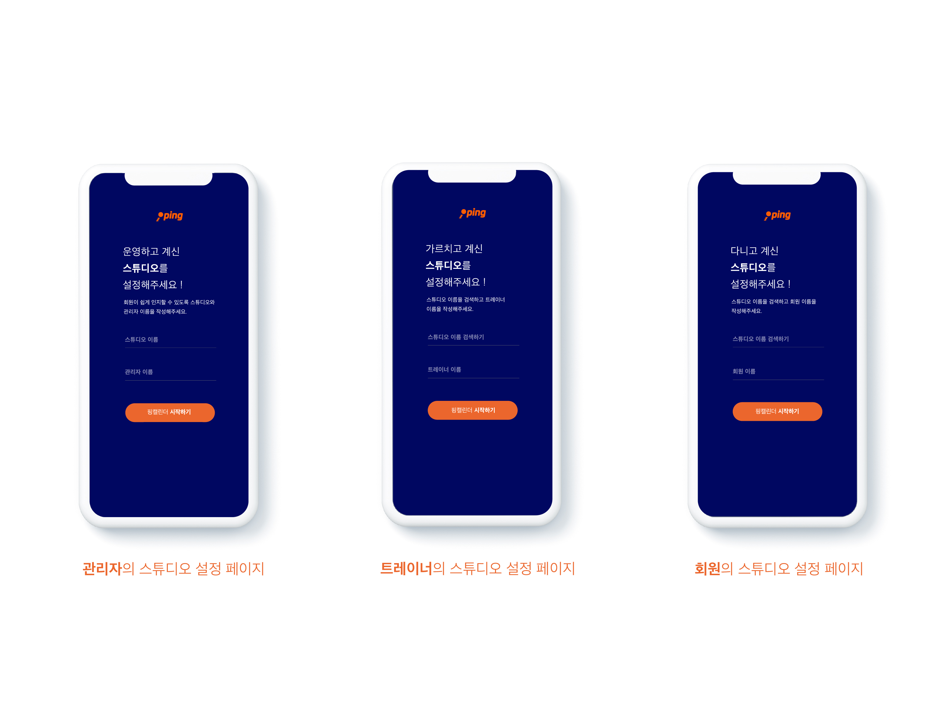 나에게 맞는 핑캘린더로 사용하자 ! 사용자에게 가장 편리한 예약방법으로 제공하는 핑캘린더로 앱을 재구성해보았다. 사용하는 사용자에게 맞춰서 앱의 사용기능이 변경된다. 또한 앞으로 있을 수업을 빠르게 준비하도록, 지난 수업 기록도 빠르게 볼 수 있도록 구성하며 현재 시간과 진행중인 수업의 진도 및 스케쥴을 한 눈에 알아볼 수 있다. 회원 예약과 개인 일정 또한 보다 빠르고 편리하게 예약하도록 리디자인 하였다.
