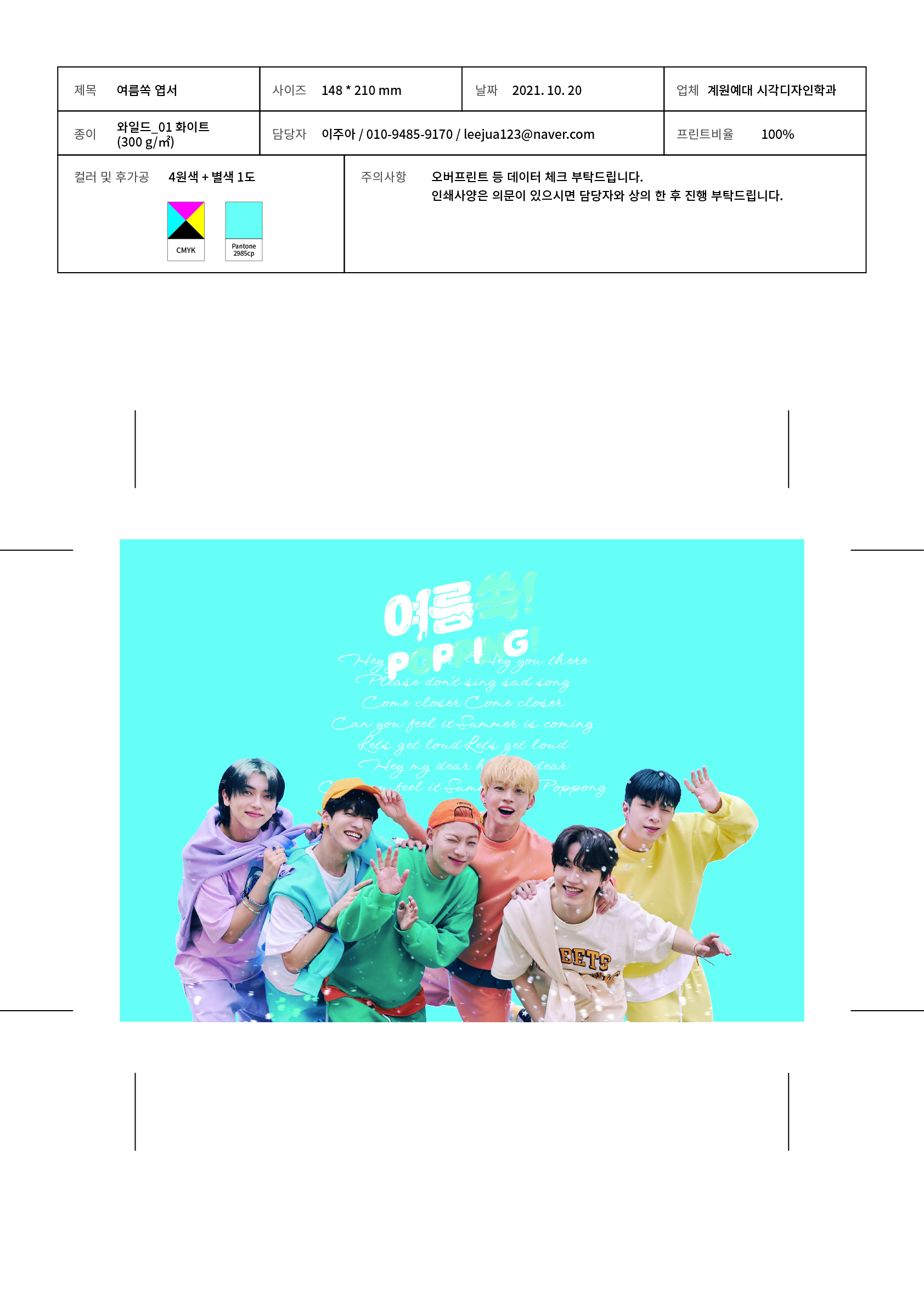 가수 '온앤오프(ONF)'의 여름 앨범 '여름 쏙'을 모티브로 카드 엽서를 제작했다. 여름의 청량하고 시원한 색을 표현하기 위해 별색(Pantone 2985cp)을 사용해 인쇄했다.