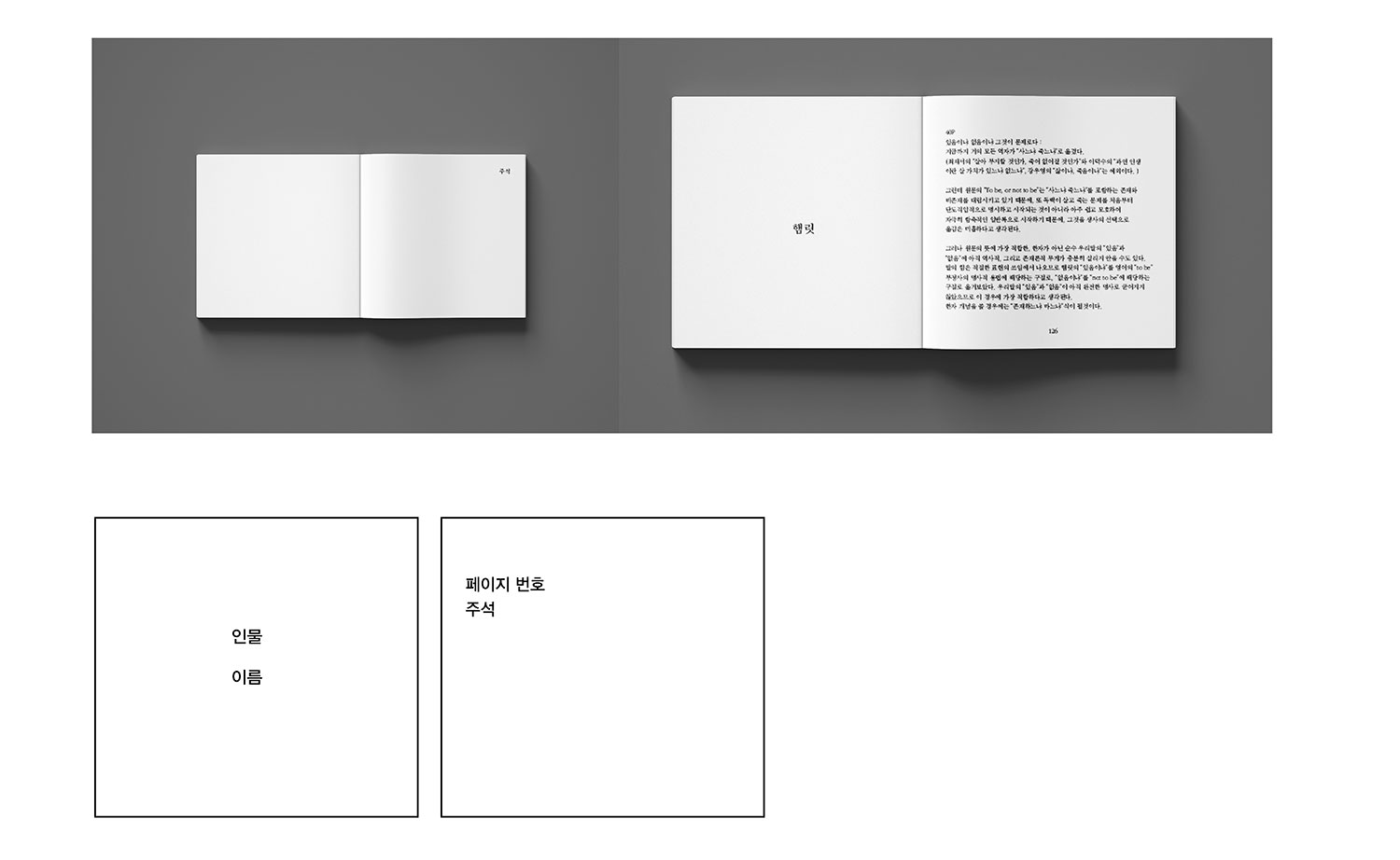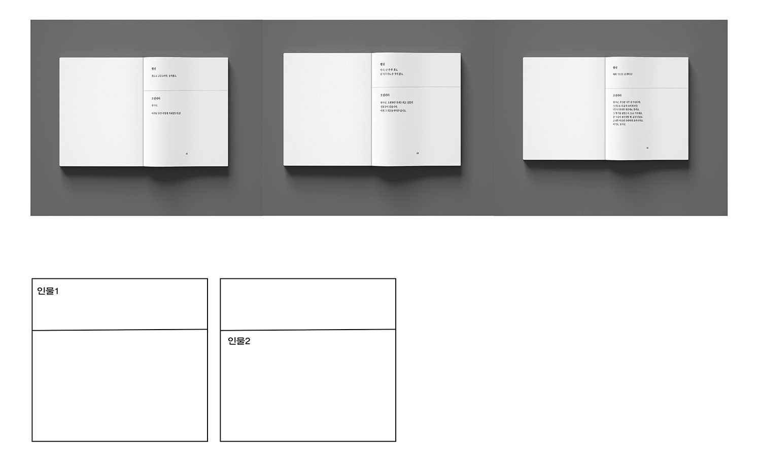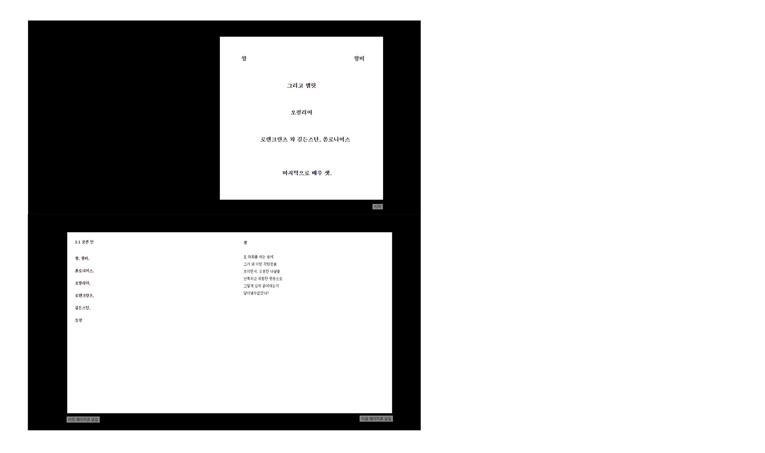 인물 1의 대화가 끝나면 다음장으로 넘겨 인물2의 대화를 확인 할 수 있다. 본문 바로 밑에 주석이 표시되는 희곡 텍스트와는 다르게 인물간의 대화의 흐름에 집중할 수 있도록 주석 페이지는 인물들의 대사와 분리하여 단독으로 구성했다. 수석은 인물 별로 구분하였으며 페이지 번호를 보고 찾아갈 수 있도록 페이지 번호도 표시해주었다. 종이의 지면으로 옮기는 작업을 한 뒤에 웹으로 구현하는 작업을 진행했다. 구성은 크게 바뀌지 않되, 주석은 해당 문장 위에 마우스를 올리면 표시되는 형식으로 바꾸었다. 버튼을 누르면 페이지가 이동하여 마치 e-book을 읽는 듯한 느낌을 준다.