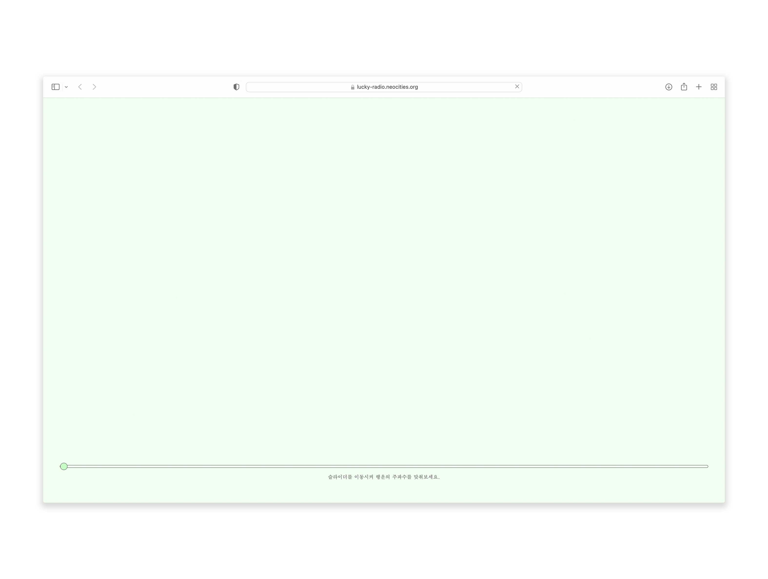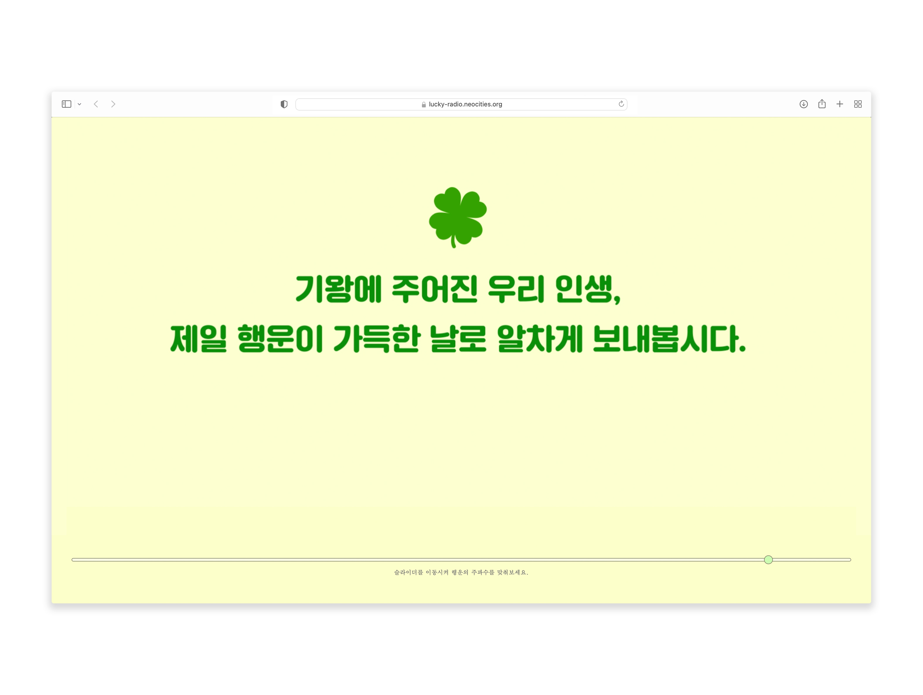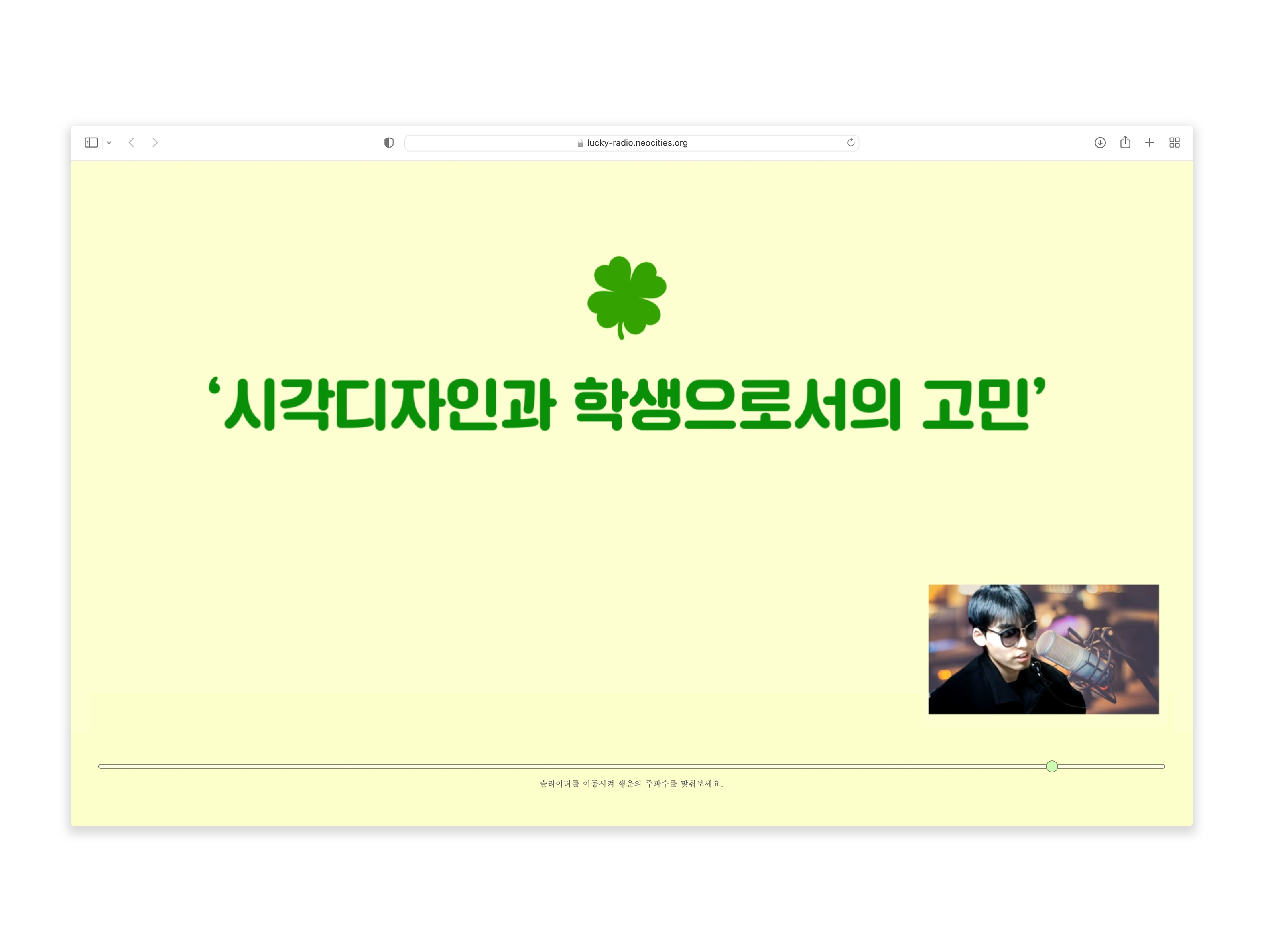 <시각디자인과 학생으로서의 고민>이라는 공통된 주제에 관한 글을 작성한 후, 우리의 고민이 서로 반응하는 순간을 행운의 순간으로 칭하기로 하였다. 웹에 방문하면 등장하는 슬라이더. 이는 일종의 라디오 주파수 역할을 하는데, 슬라이더를 움직이면 행운과 관련된 여러 광고들을 마주하게 된다. 주파수를 맞춰가며 나오는 소음을 거쳐 행운의 순간을 찾는다면, 마침내 우리의 글(고민)이 담긴 라디오가 재생된다.