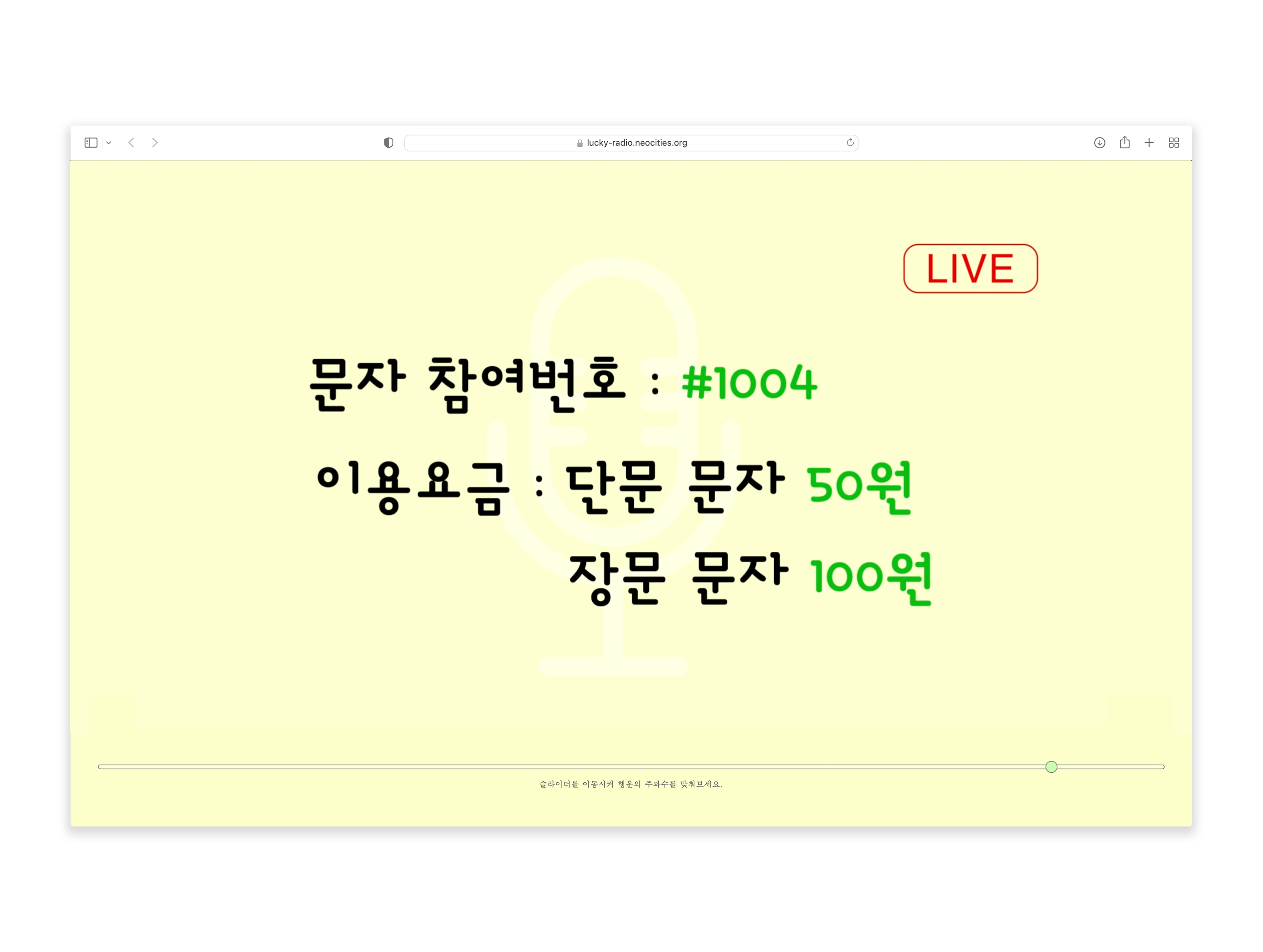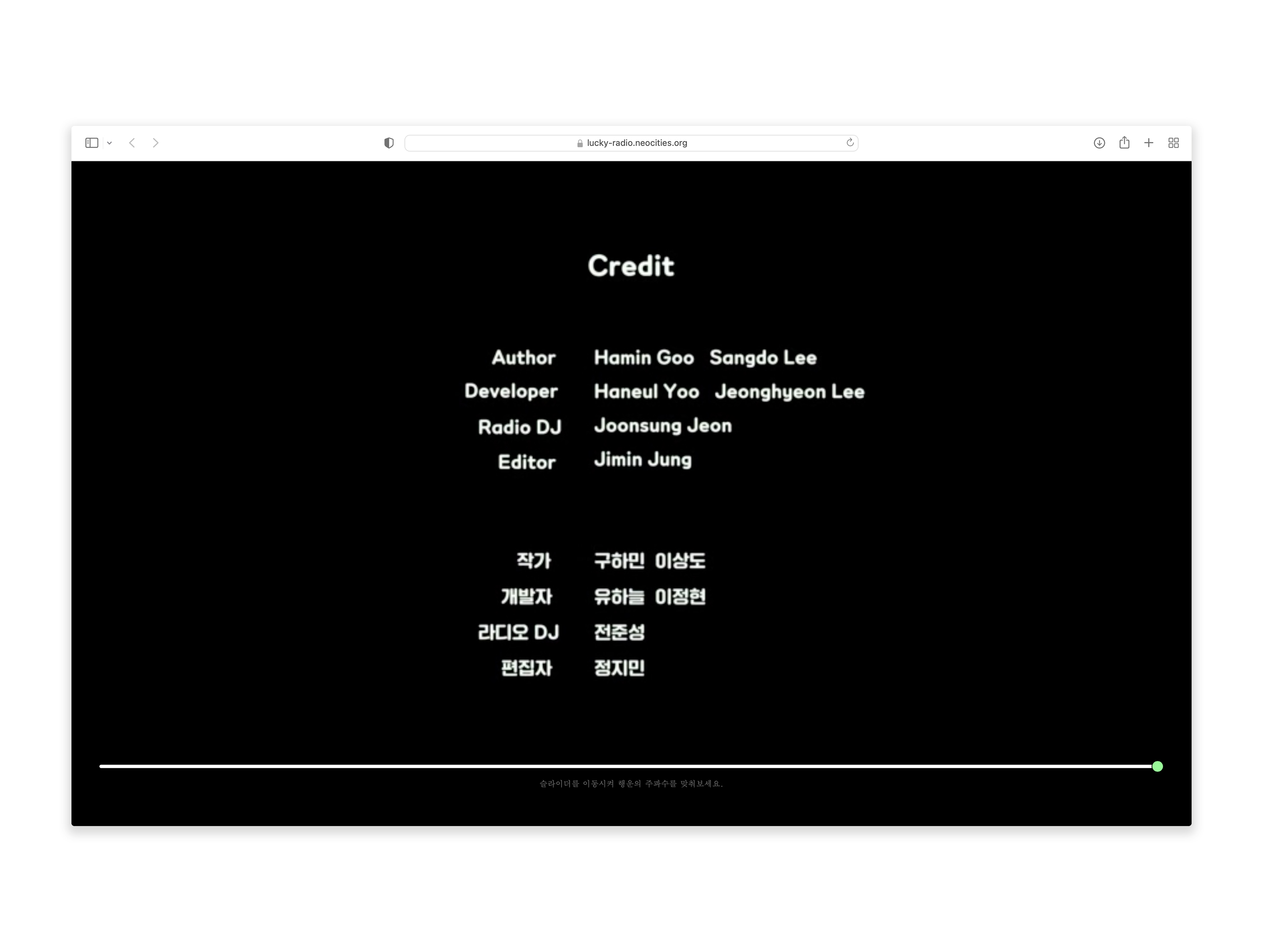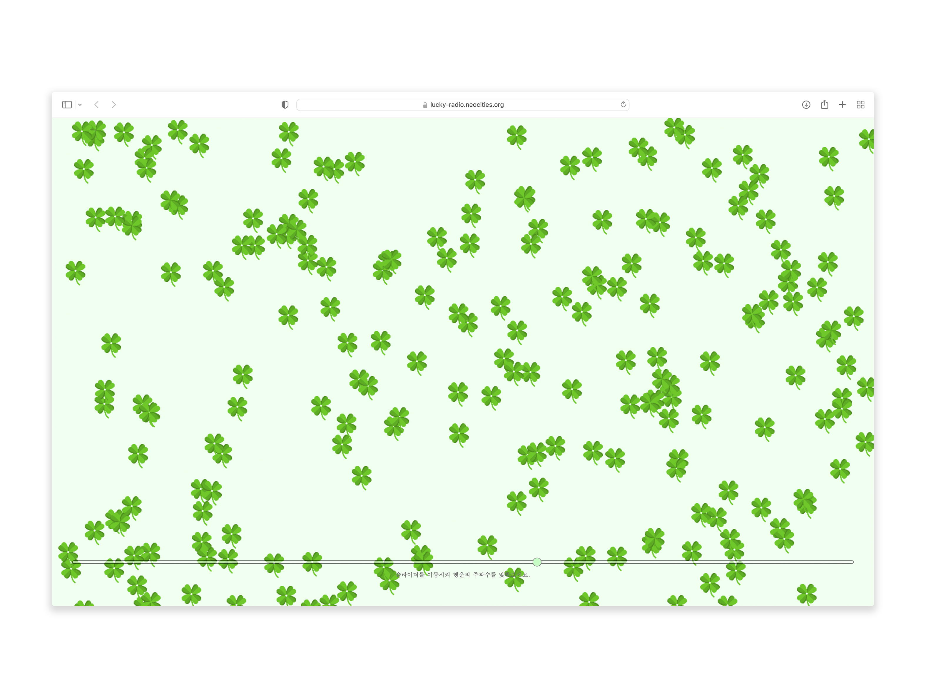 <시각디자인과 학생으로서의 고민>이라는 공통된 주제에 관한 글을 작성한 후, 우리의 고민이 서로 반응하는 순간을 행운의 순간으로 칭하기로 하였다. 웹에 방문하면 등장하는 슬라이더. 이는 일종의 라디오 주파수 역할을 하는데, 슬라이더를 움직이면 행운과 관련된 여러 광고들을 마주하게 된다. 주파수를 맞춰가며 나오는 소음을 거쳐 행운의 순간을 찾는다면, 마침내 우리의 글(고민)이 담긴 라디오가 재생된다.