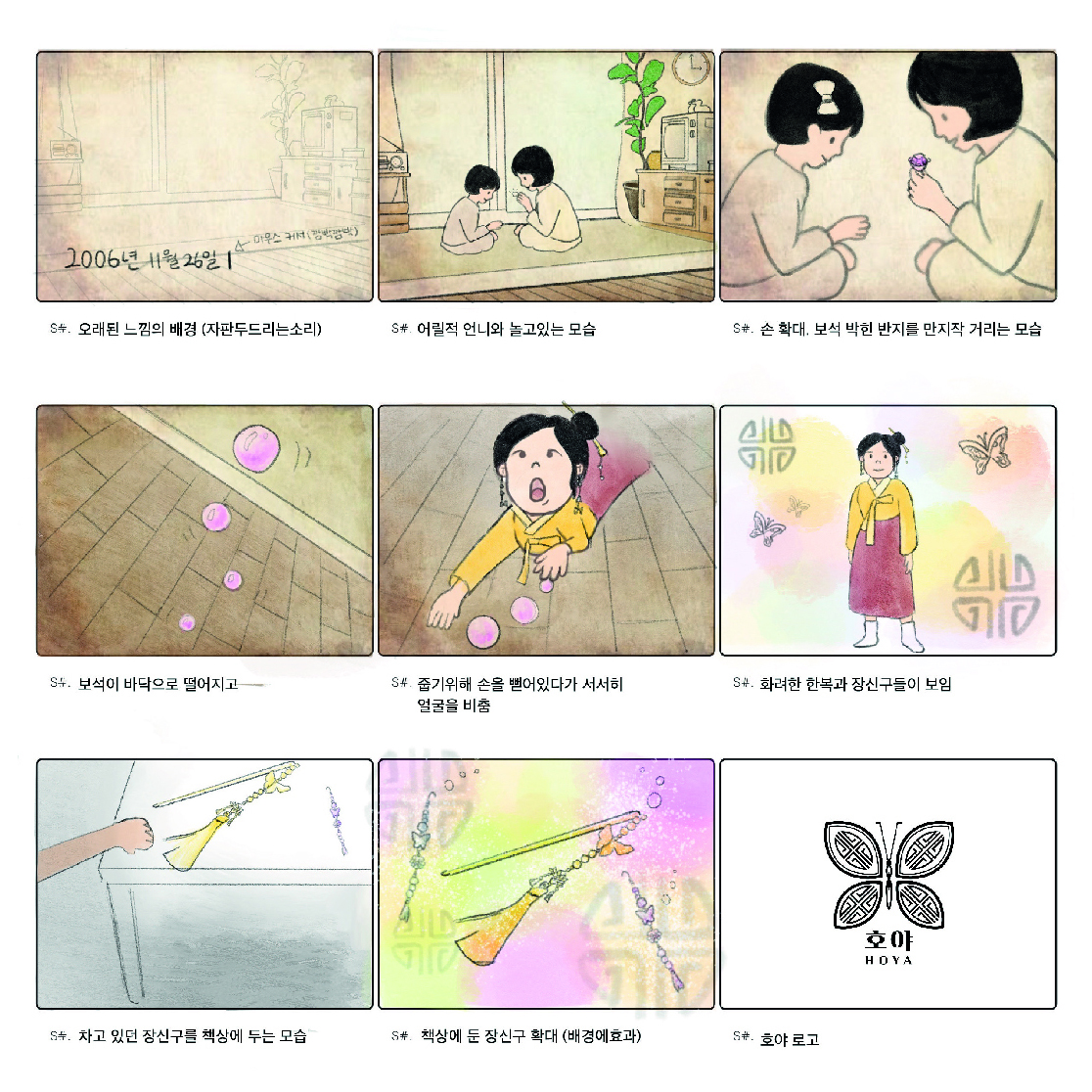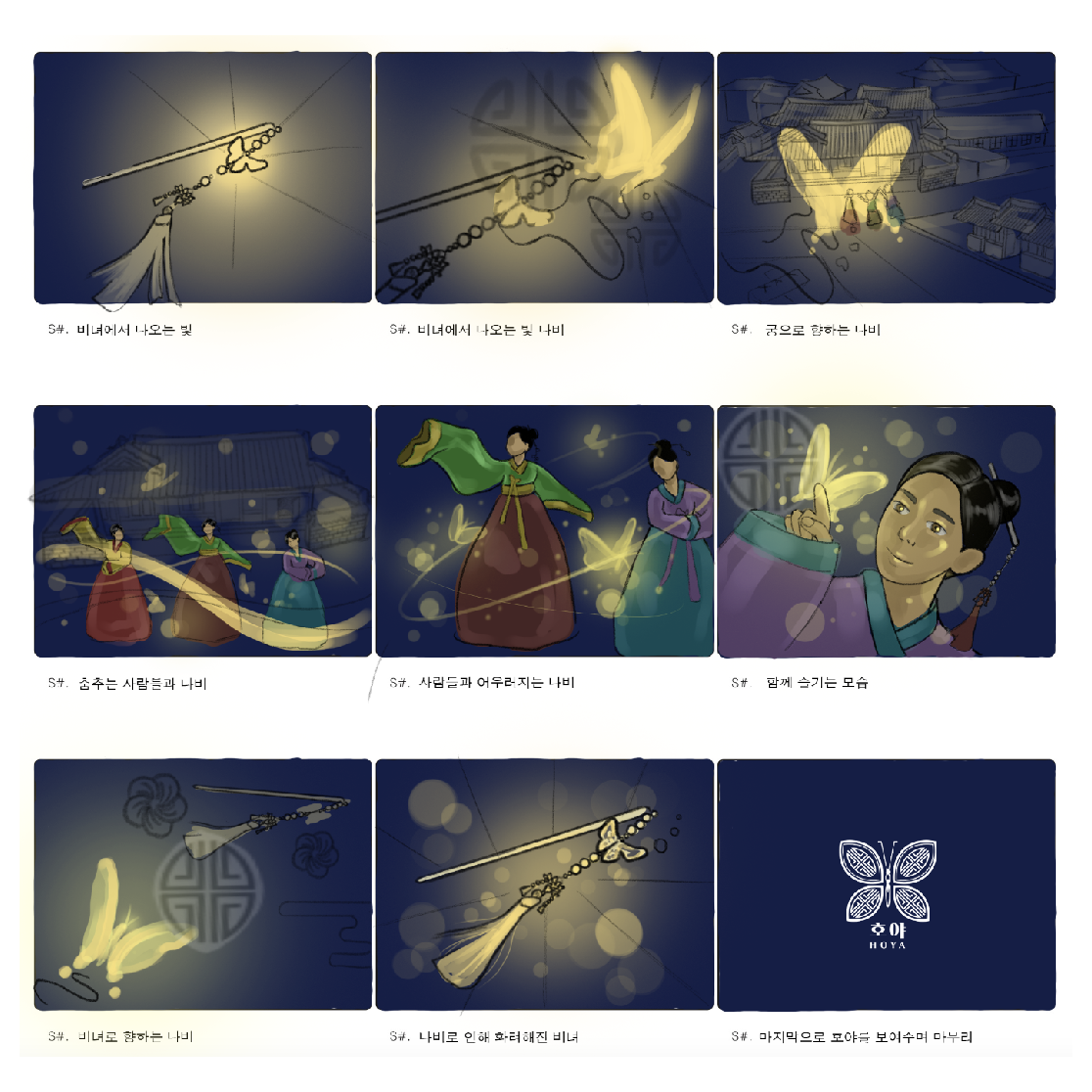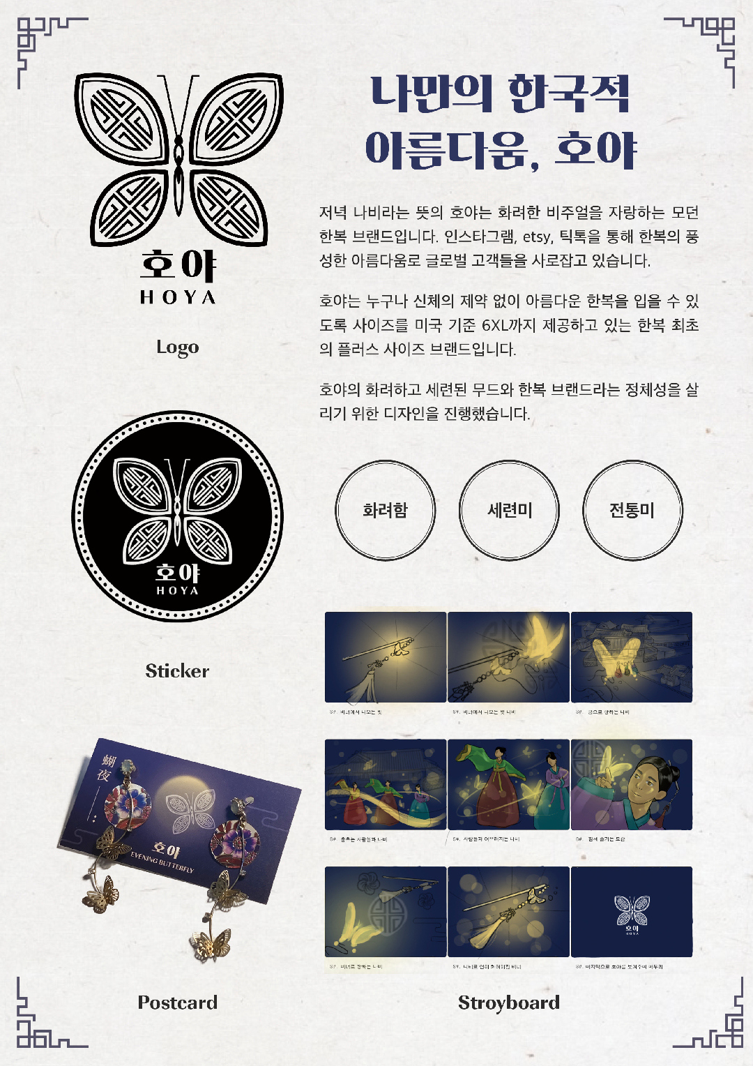 ‘호야’는 글로벌 MZ세대 고객들을 타깃으로 하는 한복 브랜드이다. 브랜드 네임의 뜻인 ‘저녁 나비’와 한국 전통문양에서 영감을 받은 로고를 디자인하고 로고 디자인을 귀걸이 꽂이 엽서, 스티커로 확장했다. 호야의 브랜드 스토리를 담은 광고 기획 스토리보드도 두 가지로 제작했으며, 숏폼 형태의 영상을 별도로 연출, 촬영, 편집했다. 숏폼 영상에는 호야의 한국적이면서 세련된 분위기를 표현하기 위해 ‘Peggy Gou’의 한국말이 담긴 노래 <Starry Night>를 활용했다. 호야의 화려하며 동양적인 무드를 여러 매체를 통해 표현했다.