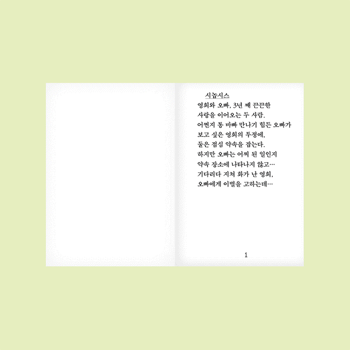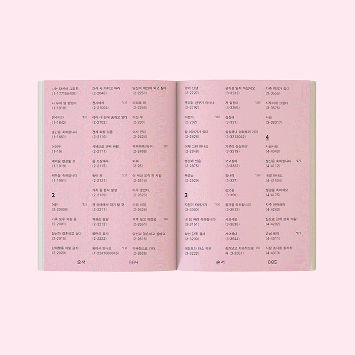 삐삐 암호로 나타낸 연인의 이야기. 영상속에서 수집한 숫자들을 삐삐 암호에 접목시켜 하나의 이야기를 구성했다. 인쇄물은 이야기에 대한 대본집 형식의 책 한 권과, 영상속의 숫자들을 다양한 방법으로 아카이빙 한 책 한 권, 총 두 권으로 구성되어 있다.