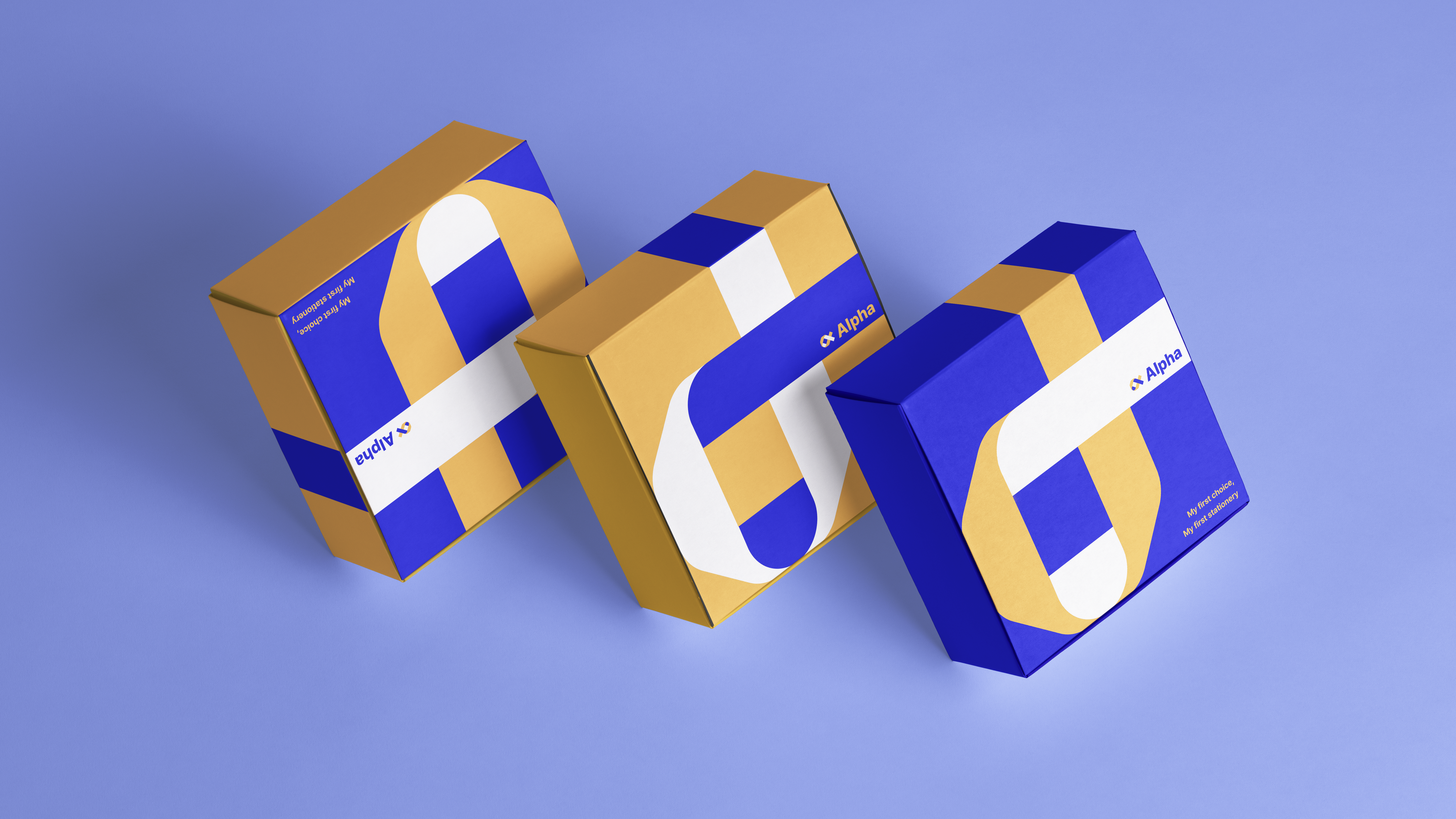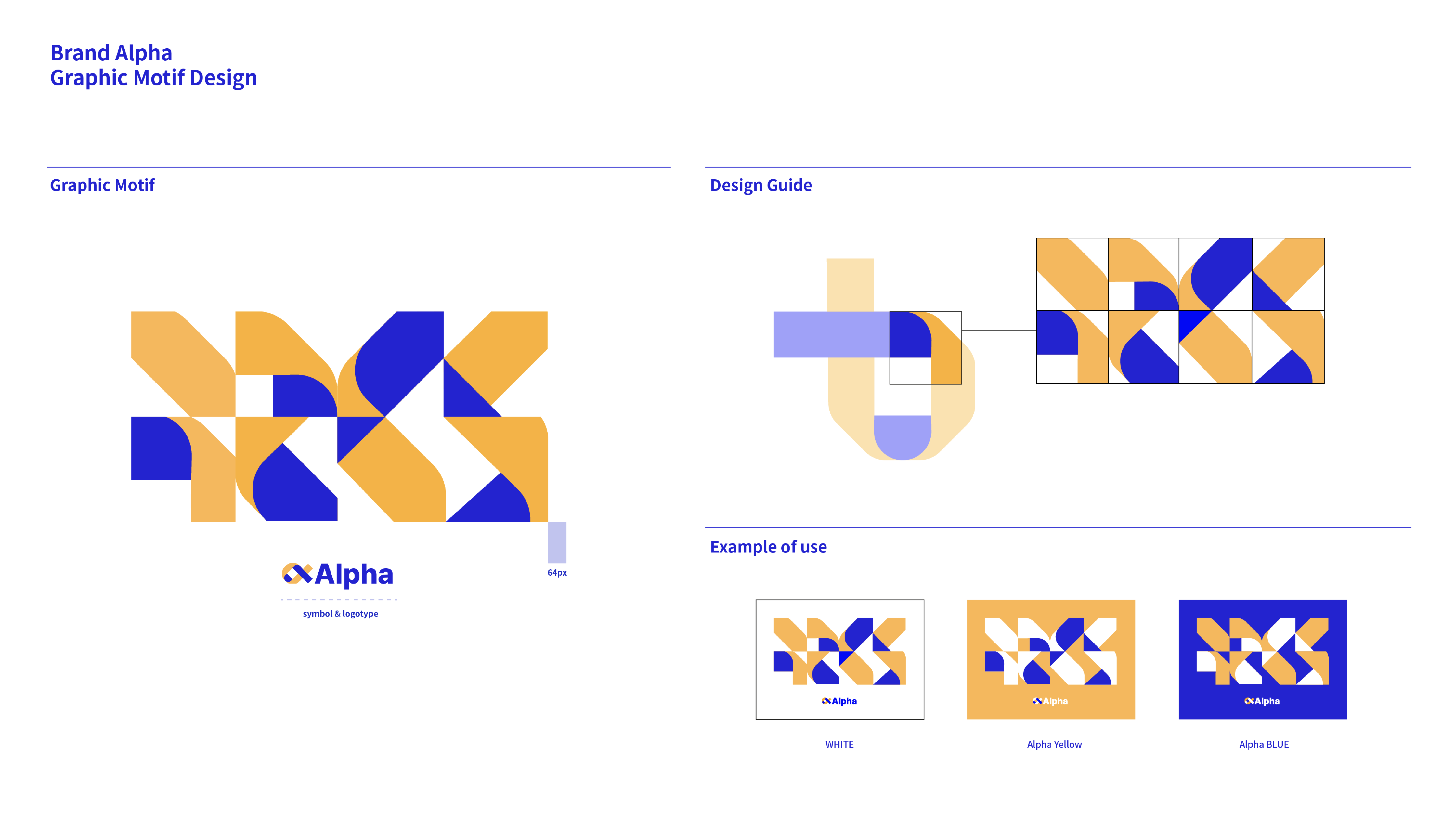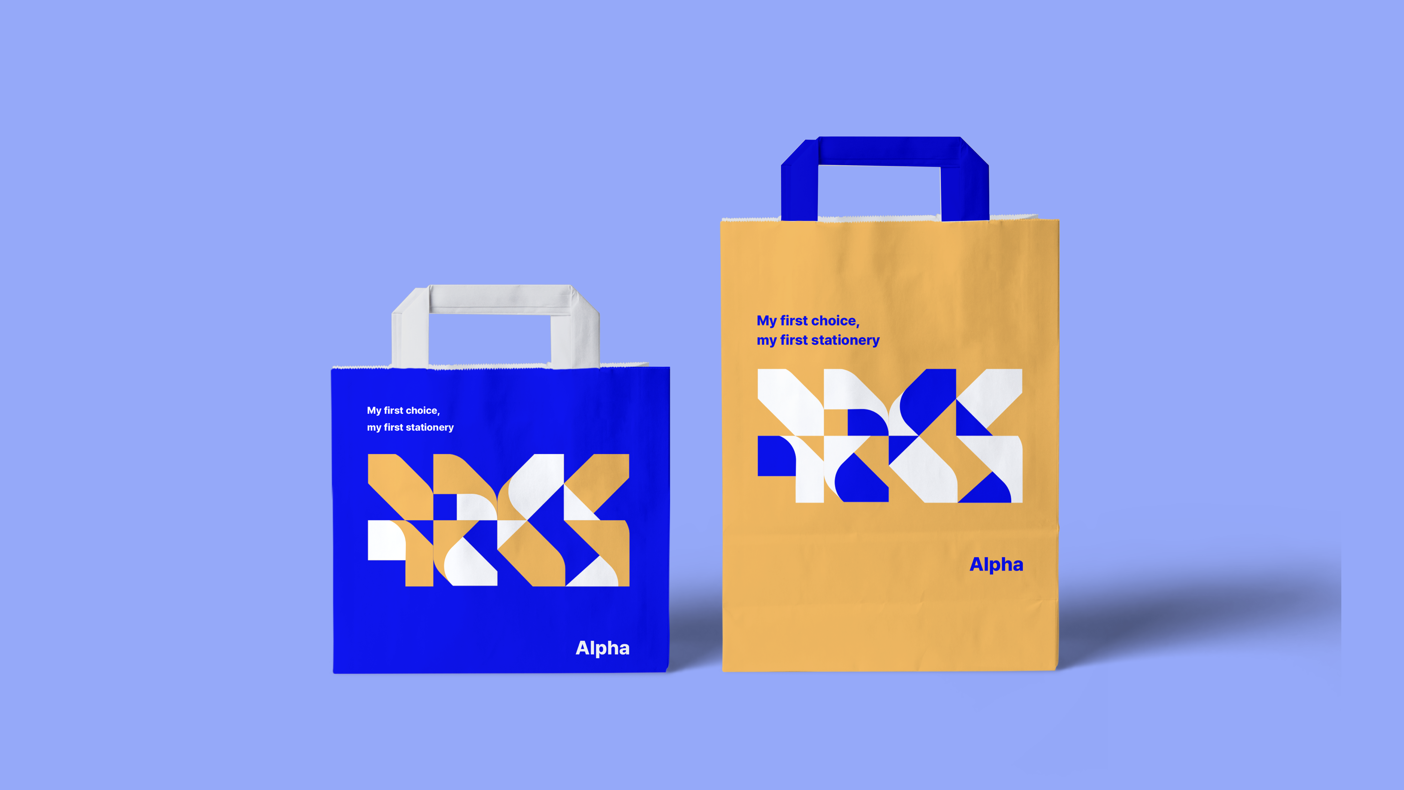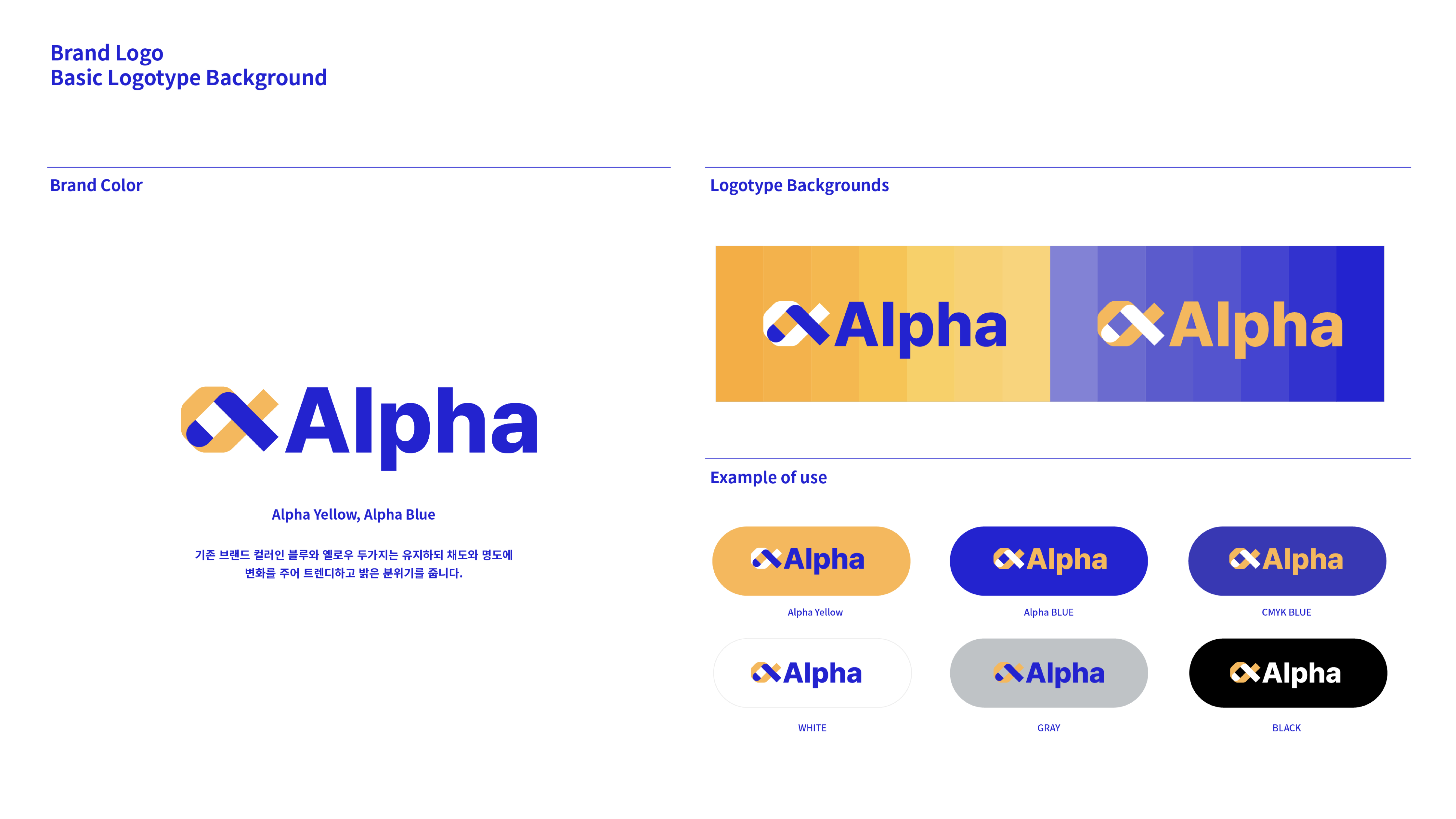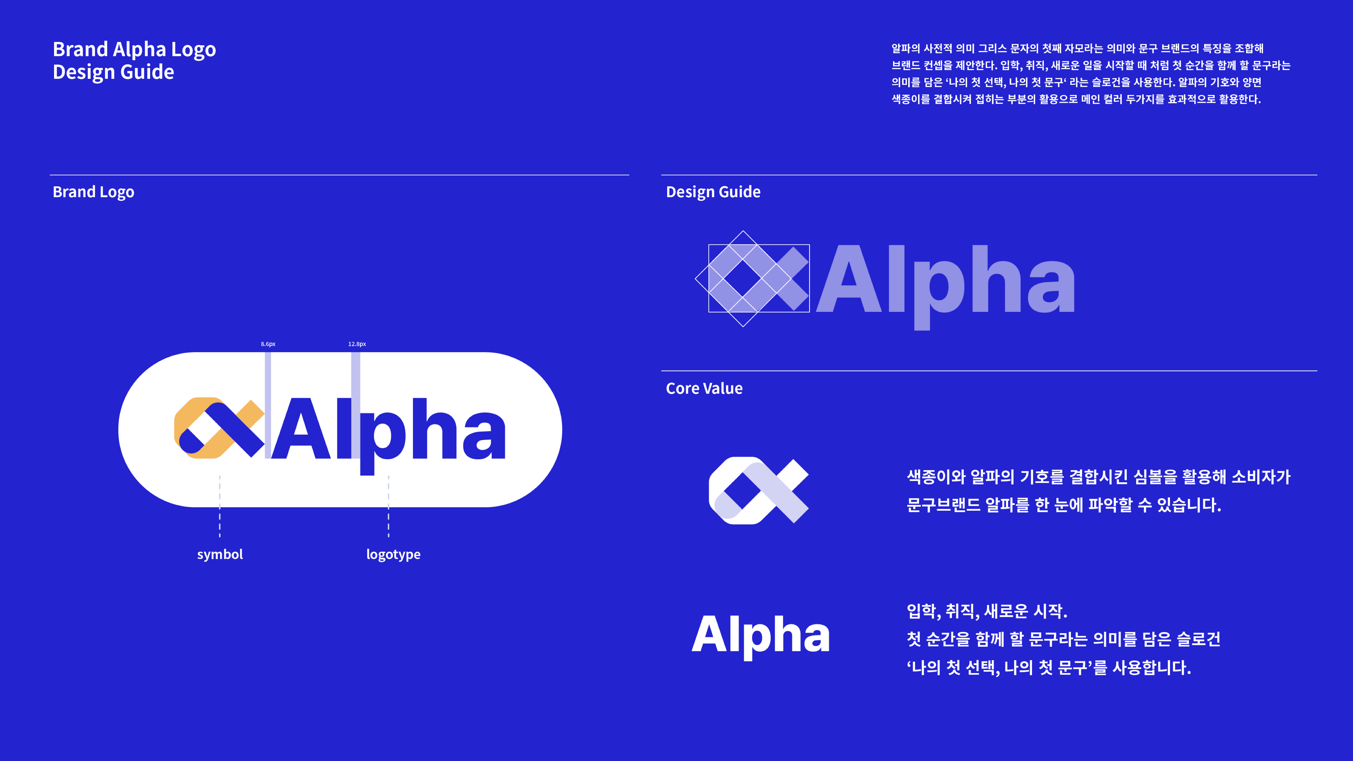 알파의 사전적 의미인 그리스 문자의 첫째 자모와 문구 브랜드의 특징을 조합해 새로운 브랜드 컨셉을 제안한다. 알파의 기호와 문구류중 하나인 양면 색종이를 결합하여 브랜드의 메인컬러와 서브컬러를 모두 나타낼 수 있는 로고를 제작했다.