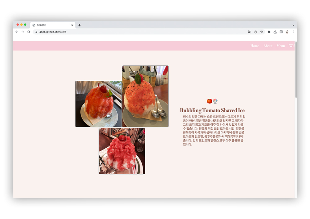 디지털 프로그래밍 수업에서 함께 기말 프로젝트로 진행한 홈페이지 만들기입니다. 모두가 좋아하는 공통점을 찾다 보니 디저트에 대해서 만들게 된 홈페이지 이다. 첫 코딩이란 것을 배우면서 만들기는 쉽진 않은 여정이었으나 함께 진행하면서 코딩에 대해서 같이 새로운 것들을 배우고 느끼는 값진 시간이었다.