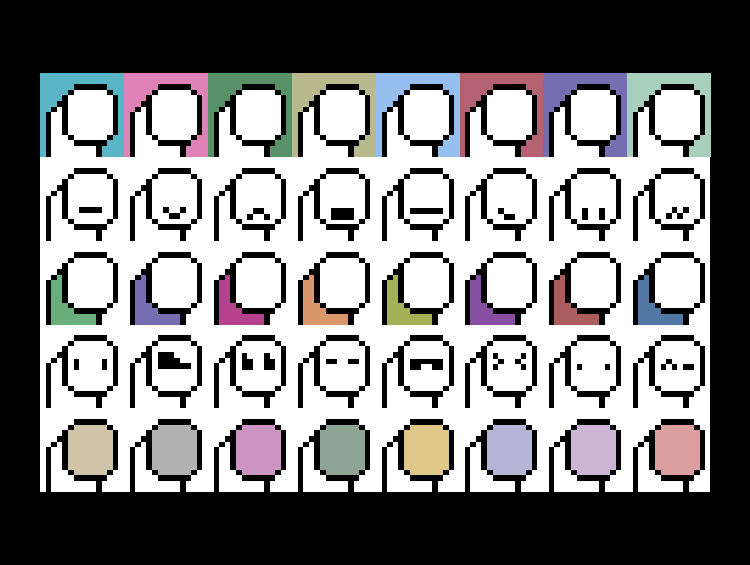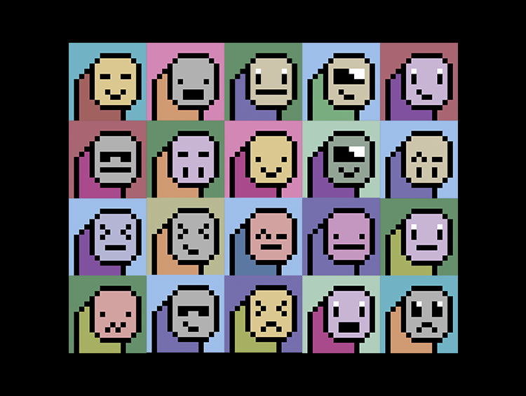 NFT 프로젝트 중 하나인 크립토펑크를 레퍼런스 삼아서 제작한 것으로, 캐릭터 스케치 위에서 각각 다른 컬러와 표정 변화가 조합된 32768개의 다양한 캐릭터를 만들어 낼 수 있다.