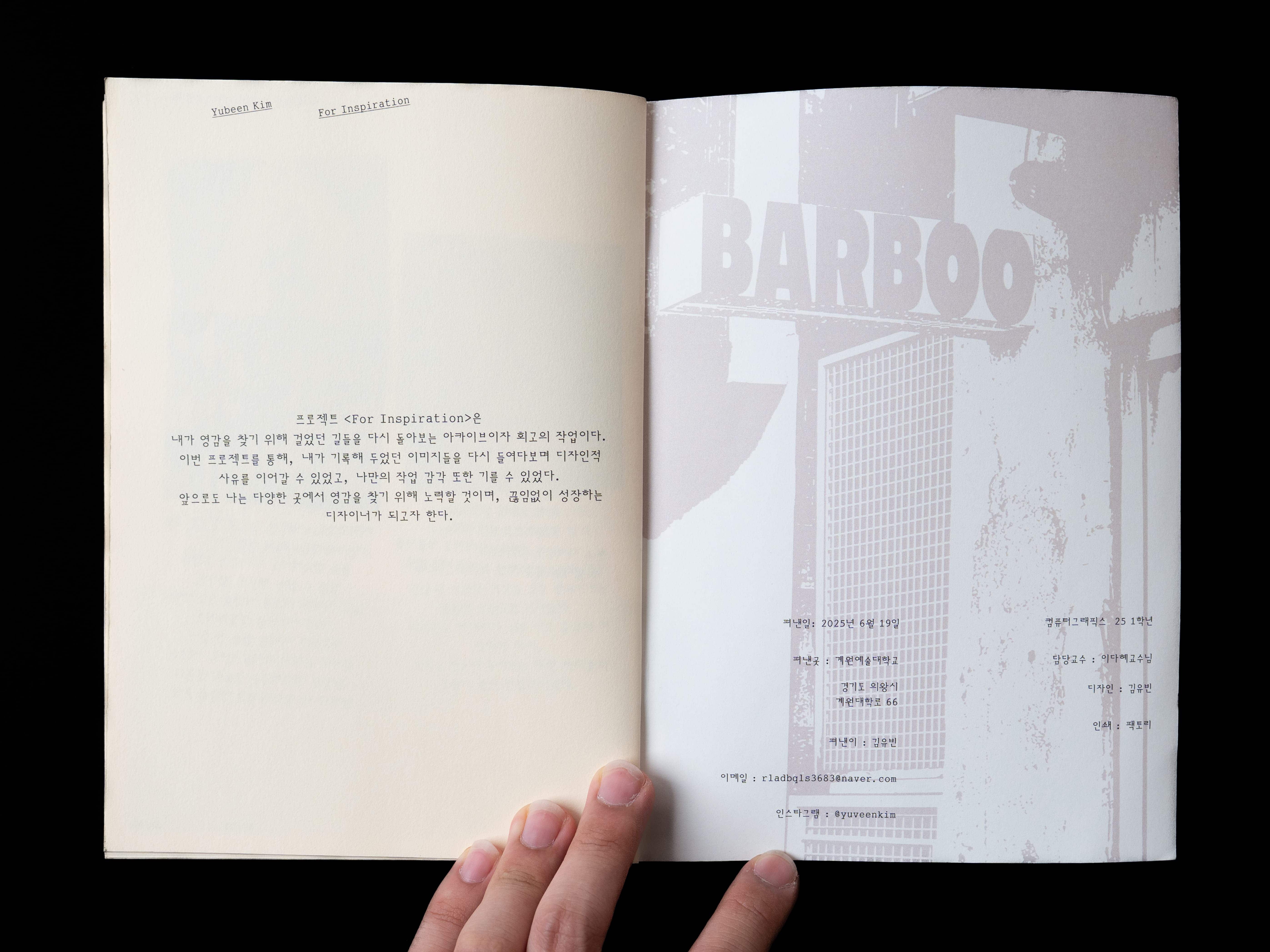 <For Inspiration>은 스스로 영감을 찾기 위해 걸었던 길들을 다시 돌아보는 아카이브이자 회고의 작업이다.