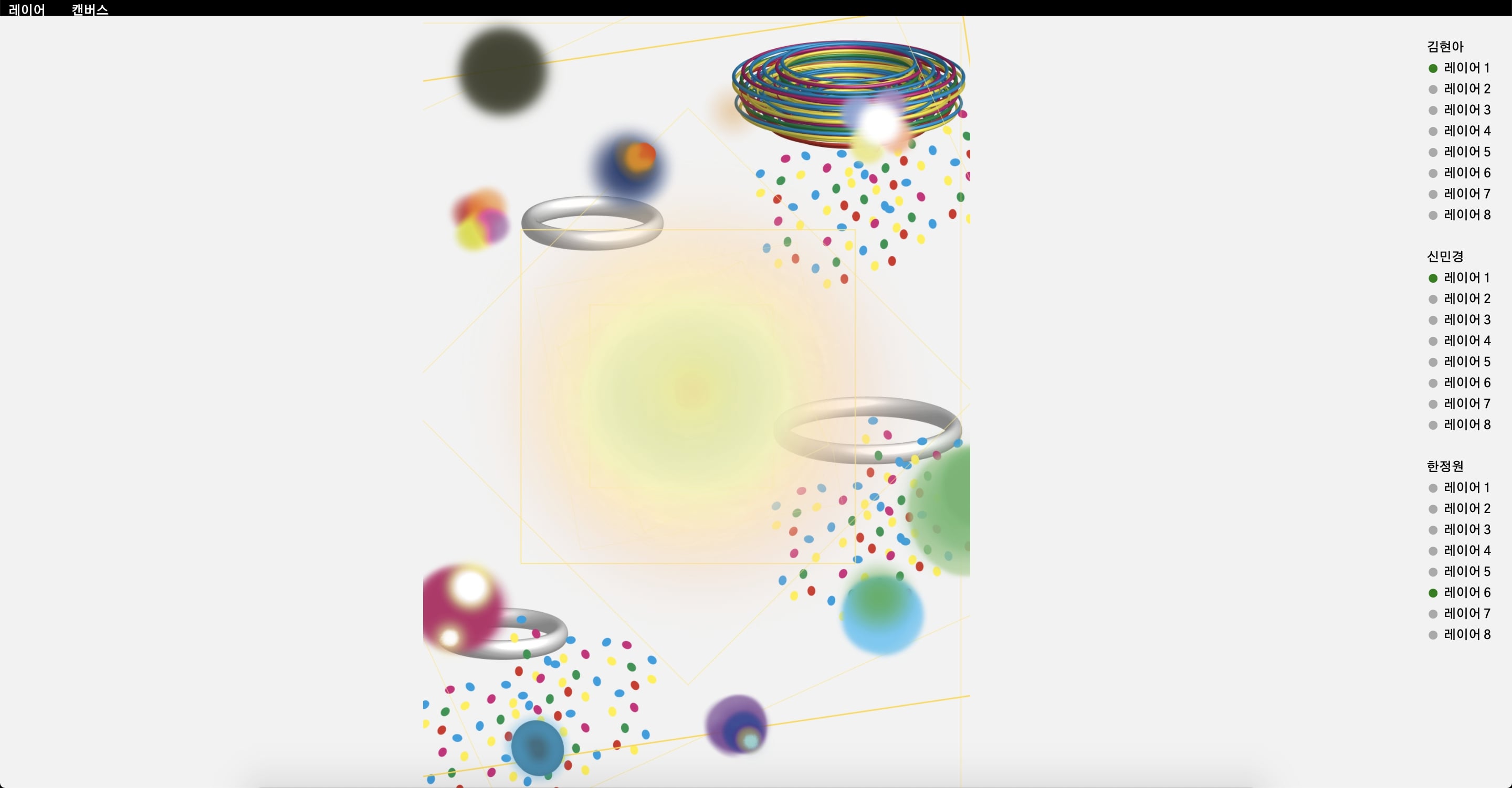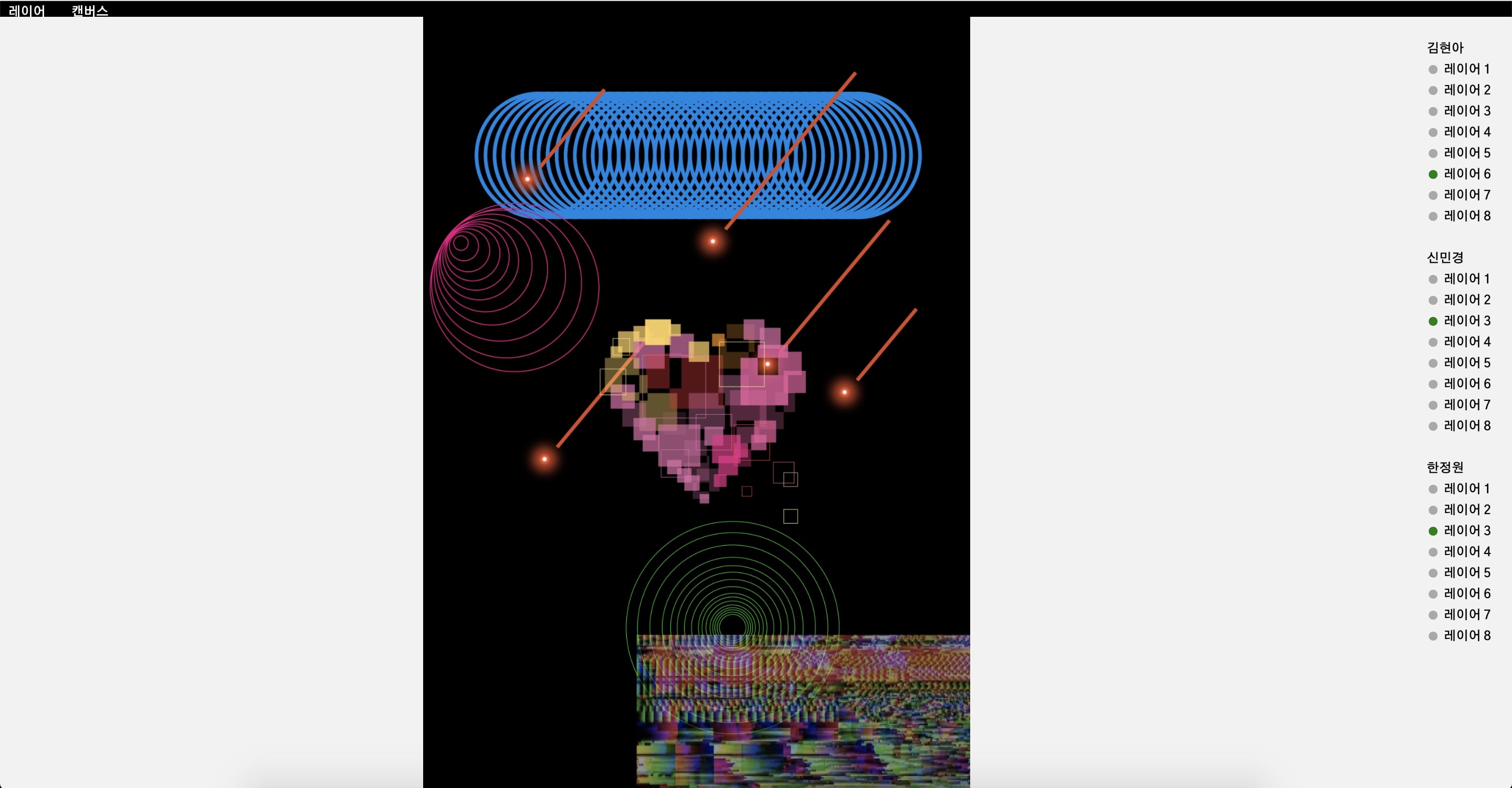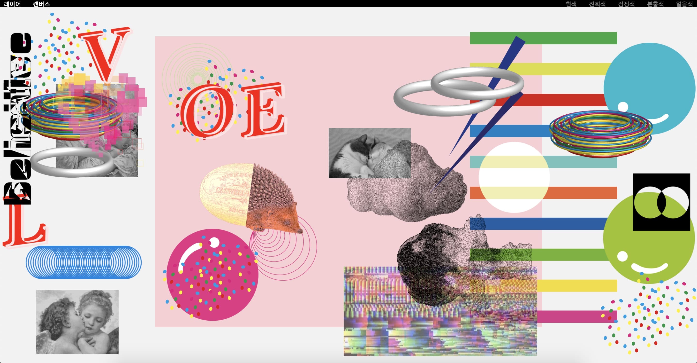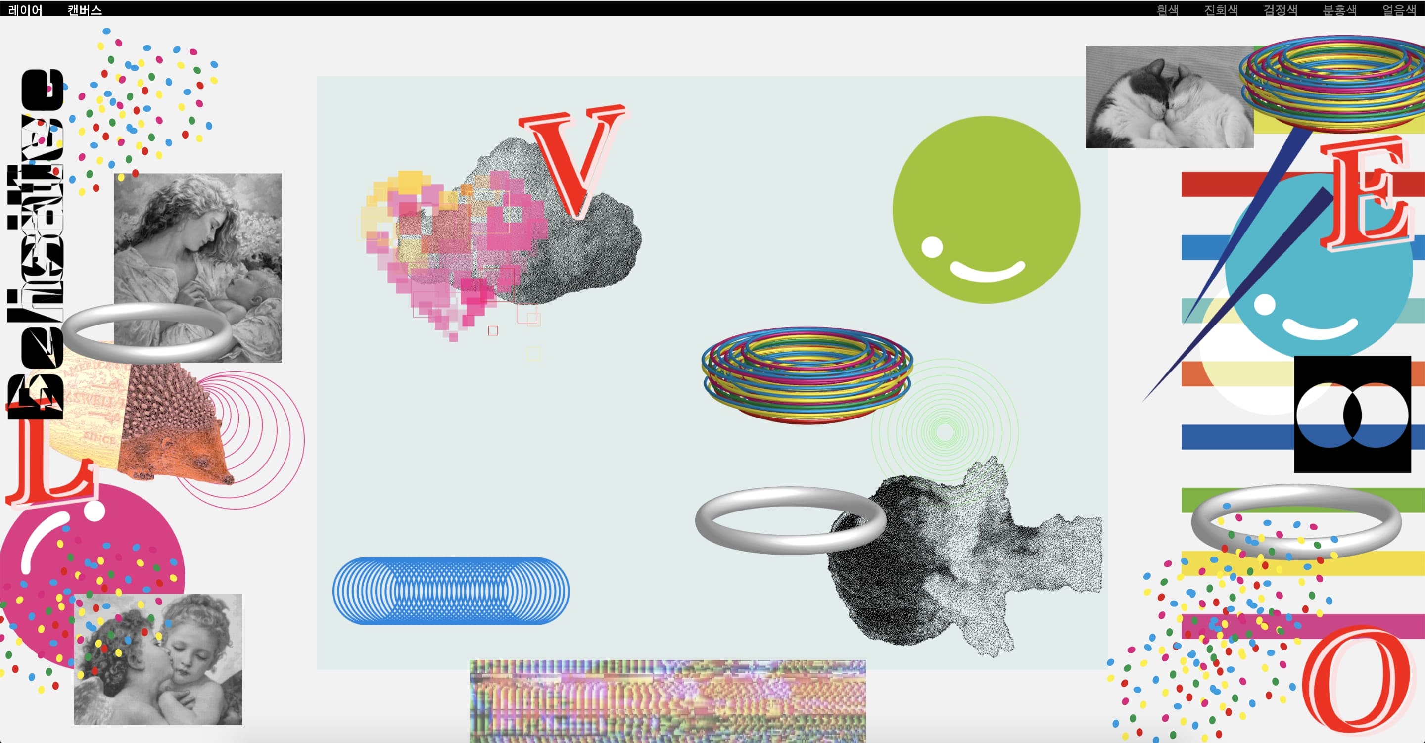 웹 -주제를 정하여 세 사람이 랜덤으로 번갈아가며 하나의 파일 안에서 릴레이 콜라주 포스터 작업을 했다. 레이어가 쌓이면서 각자의 레이어들을 껐다 켰다하며 사용자 마음대로 구성할 수 있는 레이어페이지와 레이어 요소들을 직접 이동하여 체험할 수 있는 캔버스페이지로 구성되어 있는 웹 사이트이다.