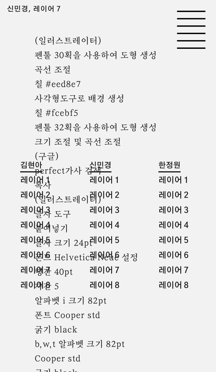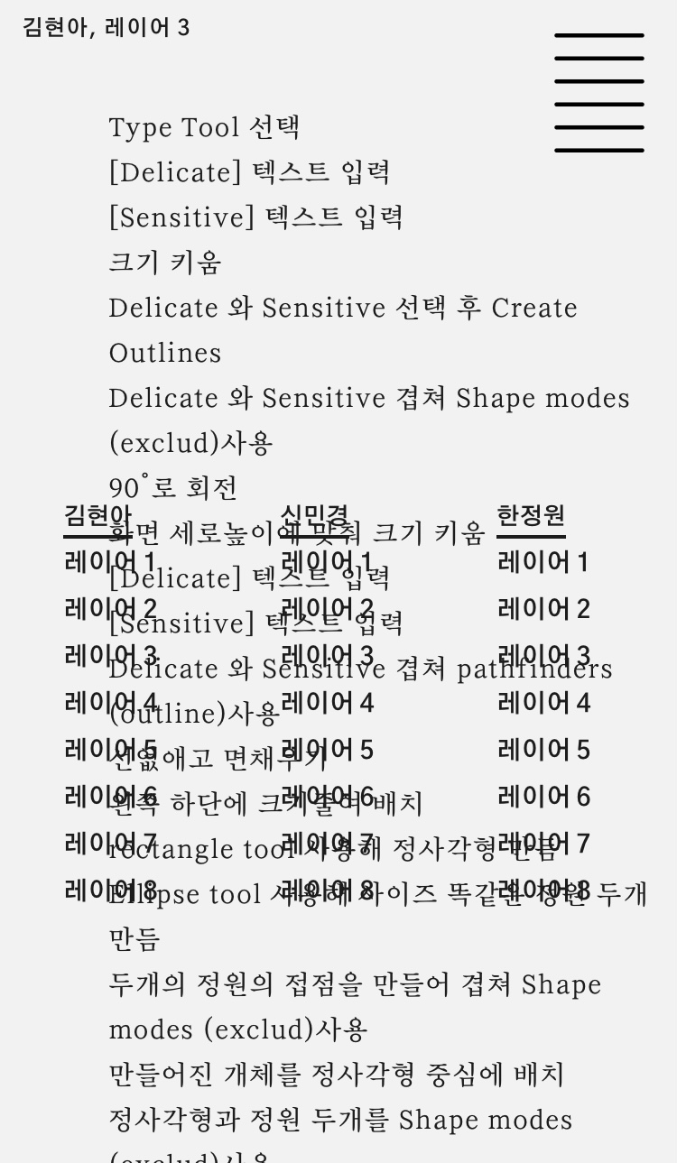 모바일 웹 -작업 내역과 레이어를 어떠한 생각을 가지고 무엇을 표현하고 싶었는지 기록한 사이트이다. 레이어가 겹쳐지는 것에 영감을 얻어 레이어 이름들과 작업내역을 겹치면서 어긋나게 만들었고, 레이어를 눌렀을 때 맨 위에 이름과 레이어는 스크롤 해도 그 자리에 고정되어있다.