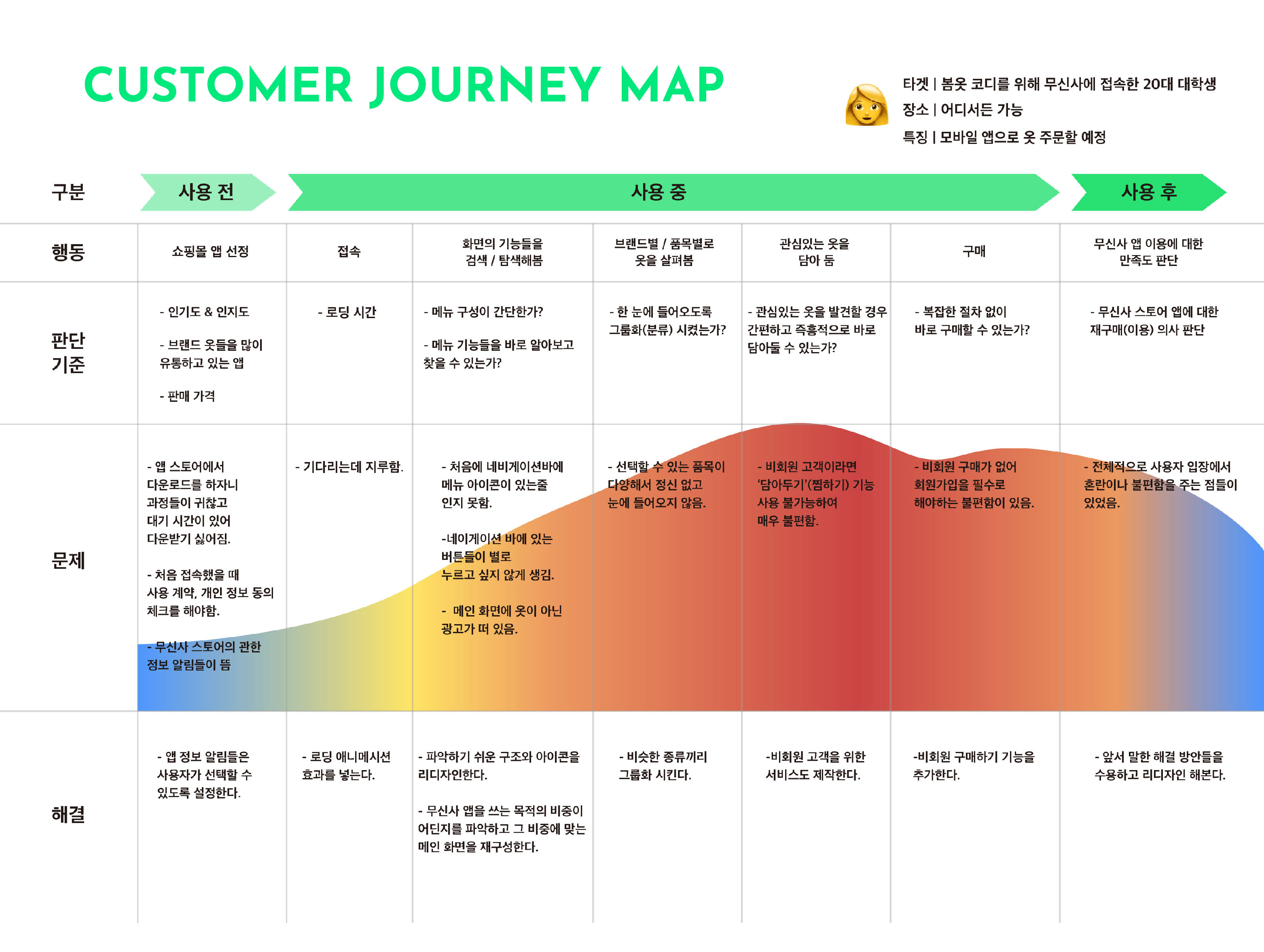 3C / SWOT / 페르소나 / 고객여정지도 등을 활용하여 무신사에 대한 시장조사와 타사와의 경쟁 분석, 사용자 분석을 하며 앞으로의 디자인 방향을 기획하였다. 그리고 앱의 구조를 새롭게 설계하고 스토리보드와 와이어프레임을 스케치하며 최종적으로 화면을 디자인하게 되었다.
