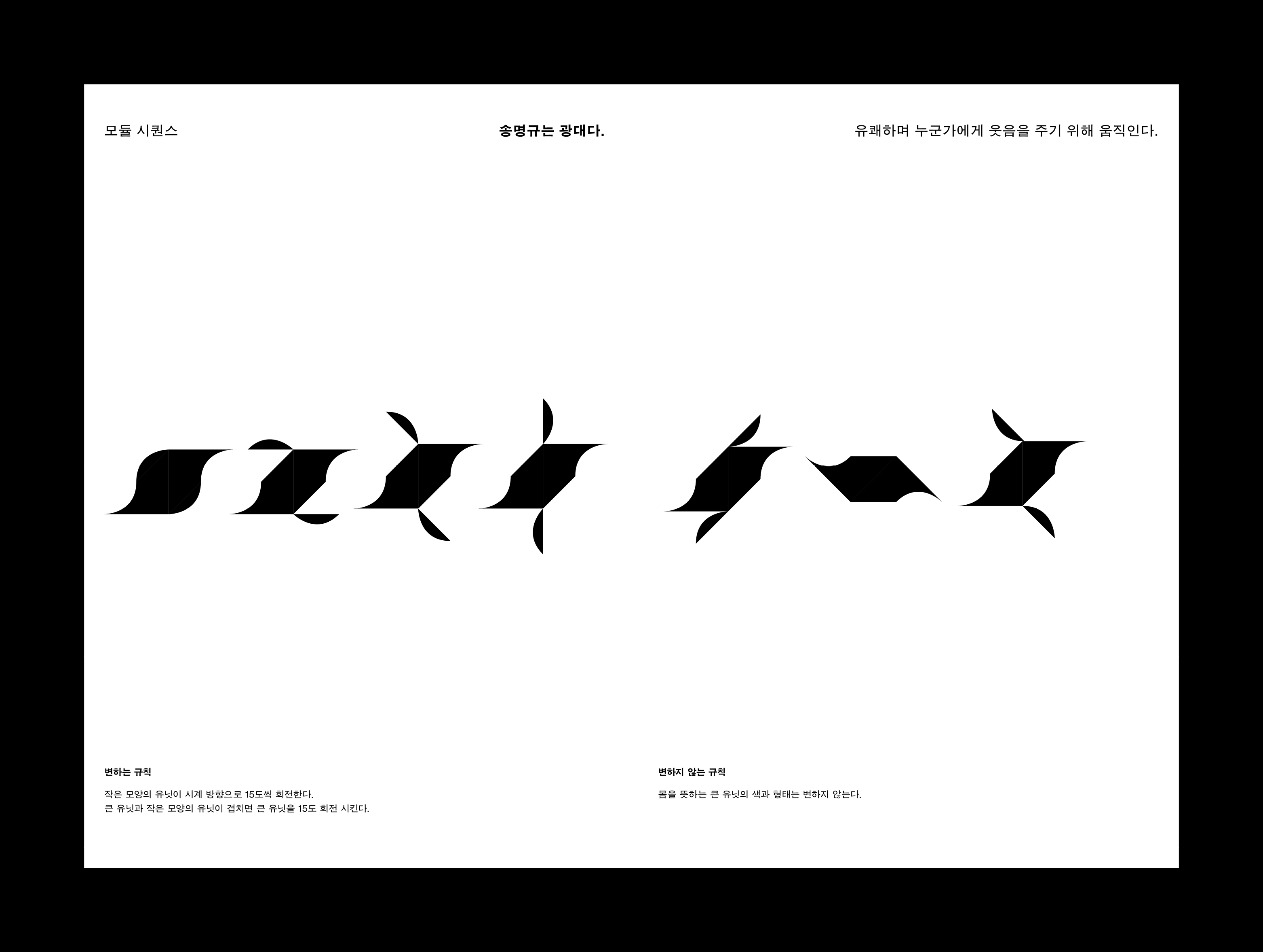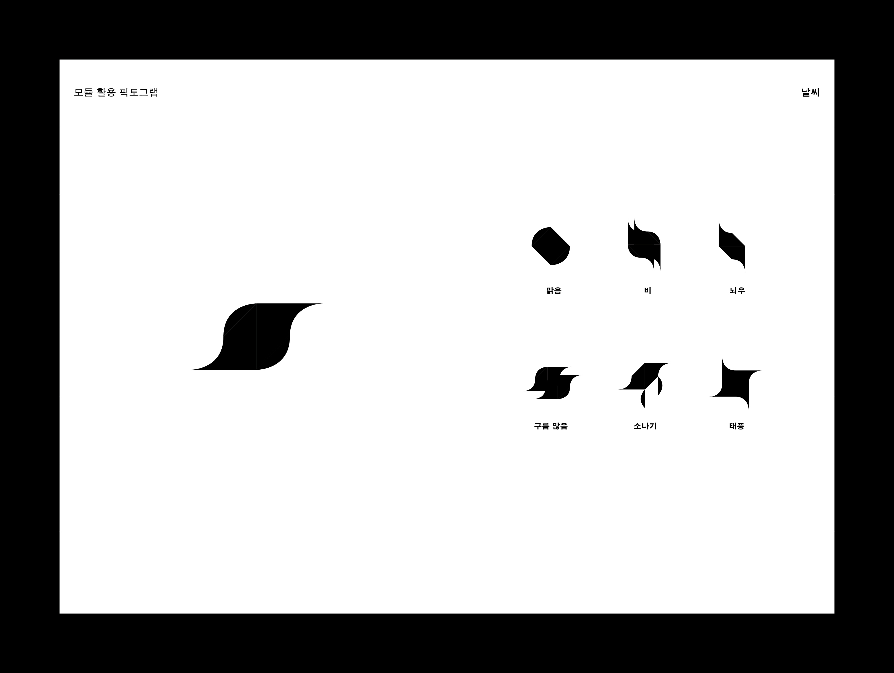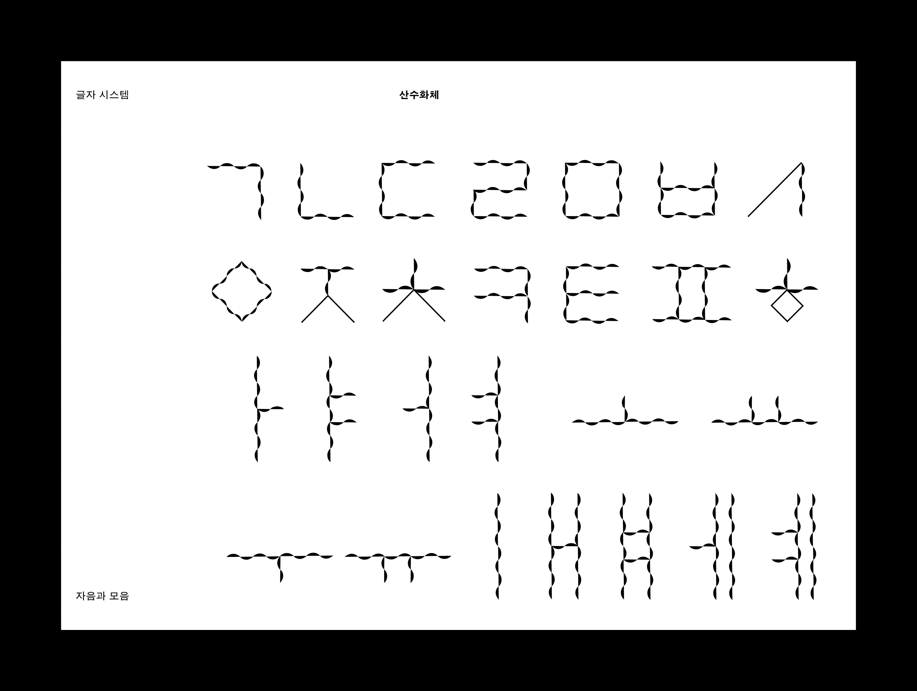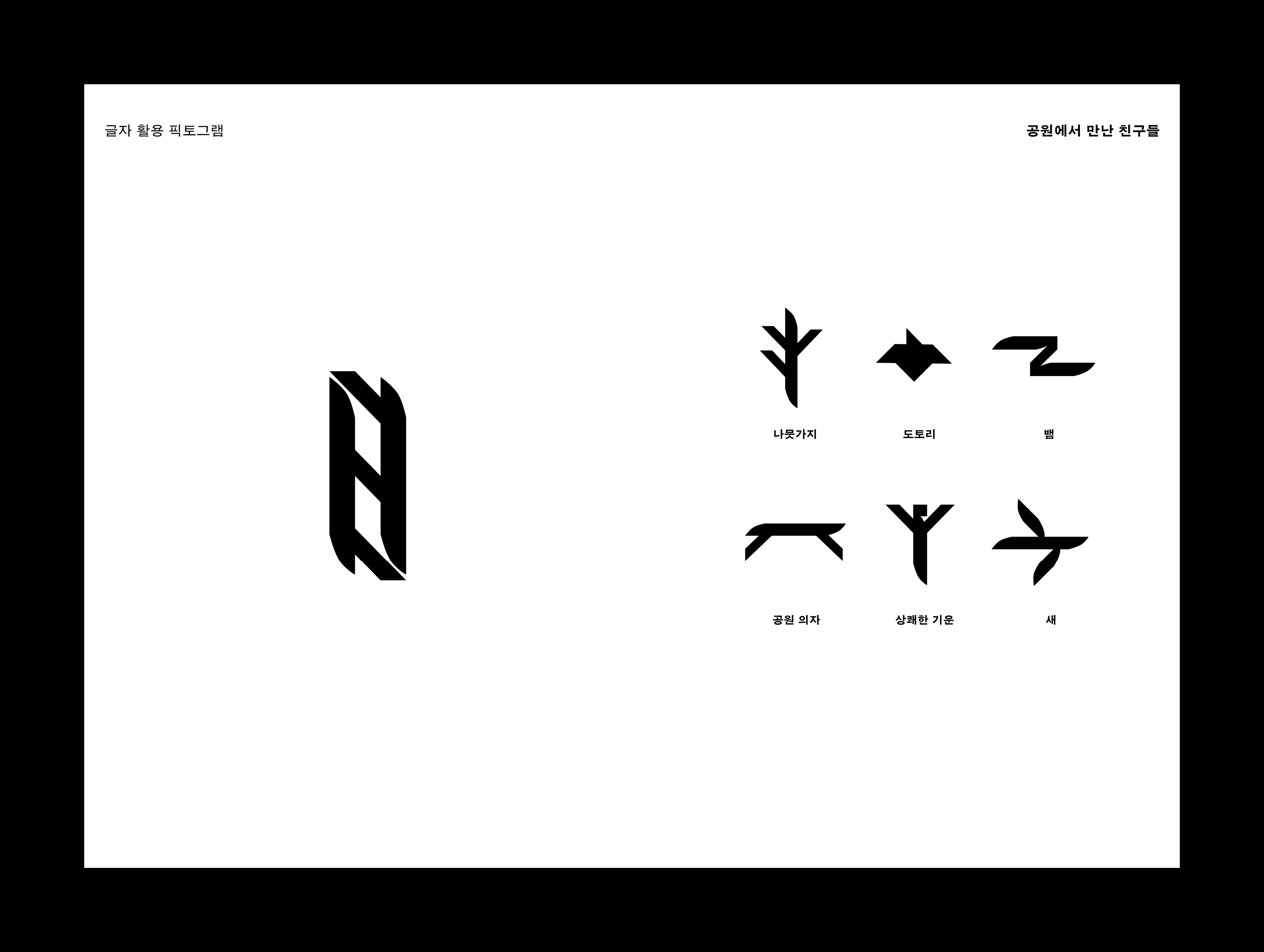 나를 표현한 30개의 문장에서 ‘유순’, ‘광대’, ‘인공위성’을 선택해 하나의 모듈을 만들어 이미지로 번역하는 작업을 진행하였다. 모듈을 패턴화하여 패턴 속에서 찾을 수 있는 유닛들을 조합하여 라틴 서체 ‘열쇠체’와 한글 서체 ‘산수화체’, 숫자 ‘발굽체’를 만들었다. 유닛과 모듈에서 활용한 규칙을 가져와 공원에서 만날 수 있는 친구들과 날씨를 표현하는 픽토그램을 만들었다.